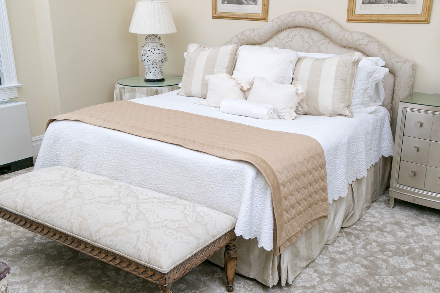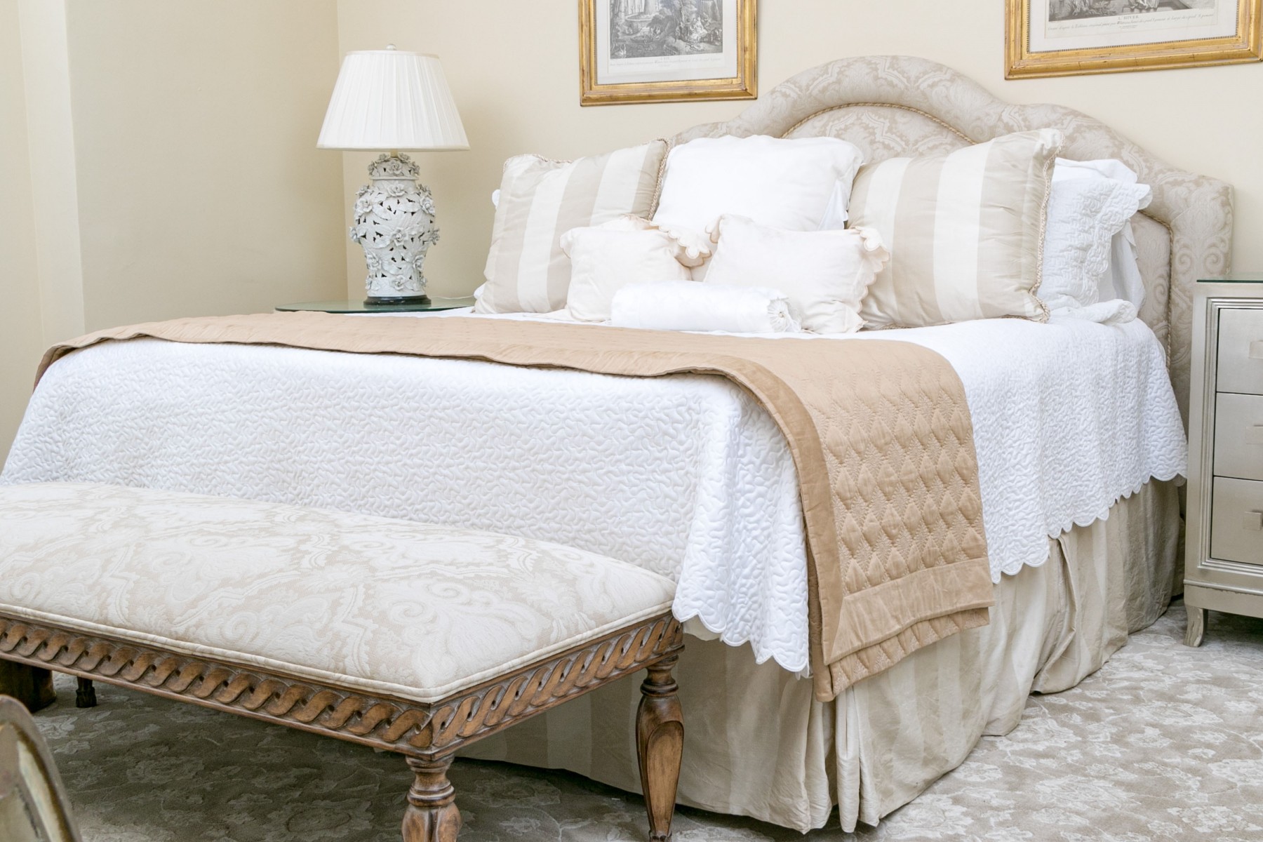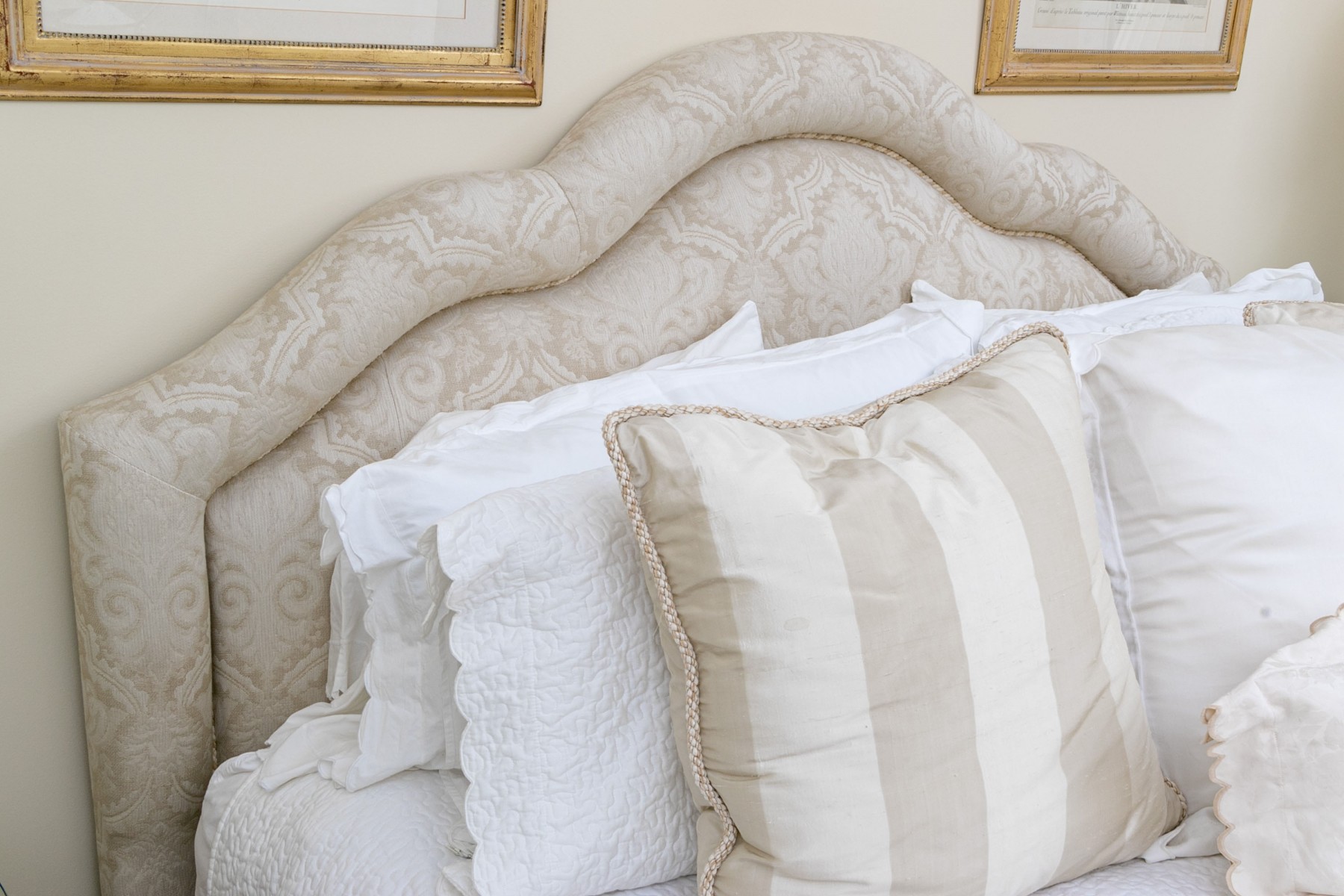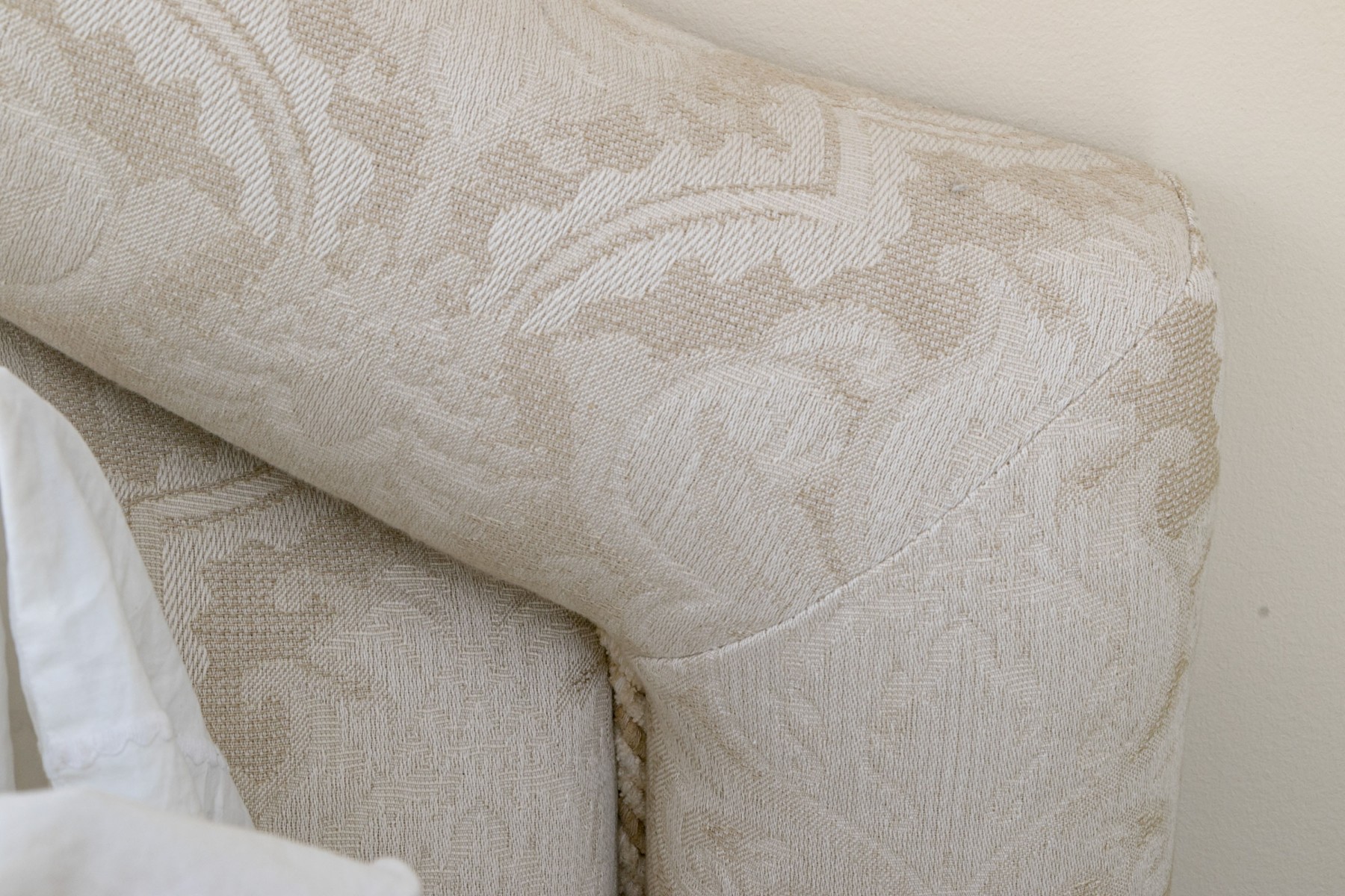 Beige cotton piped head board complete with bedstead, mattress, Harvard frame, linens, and pillows.