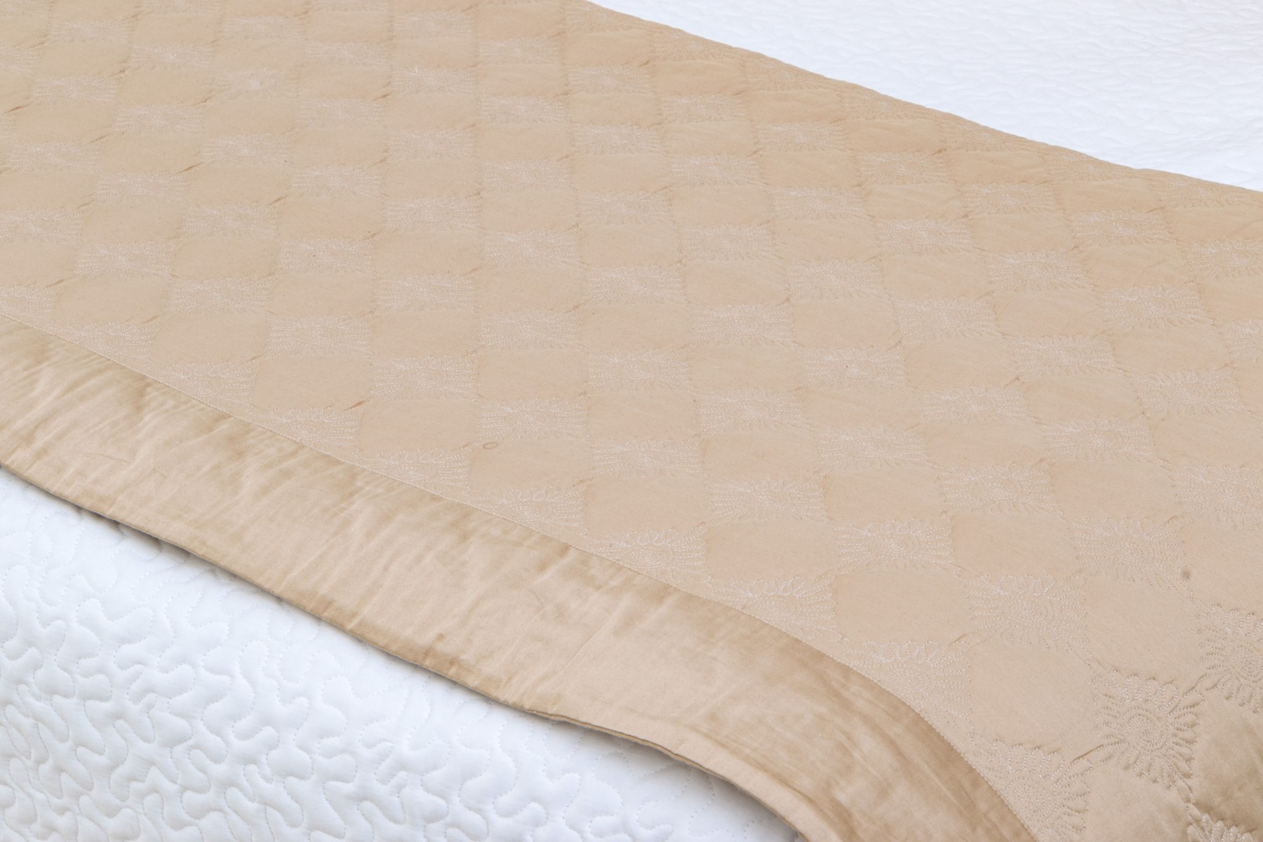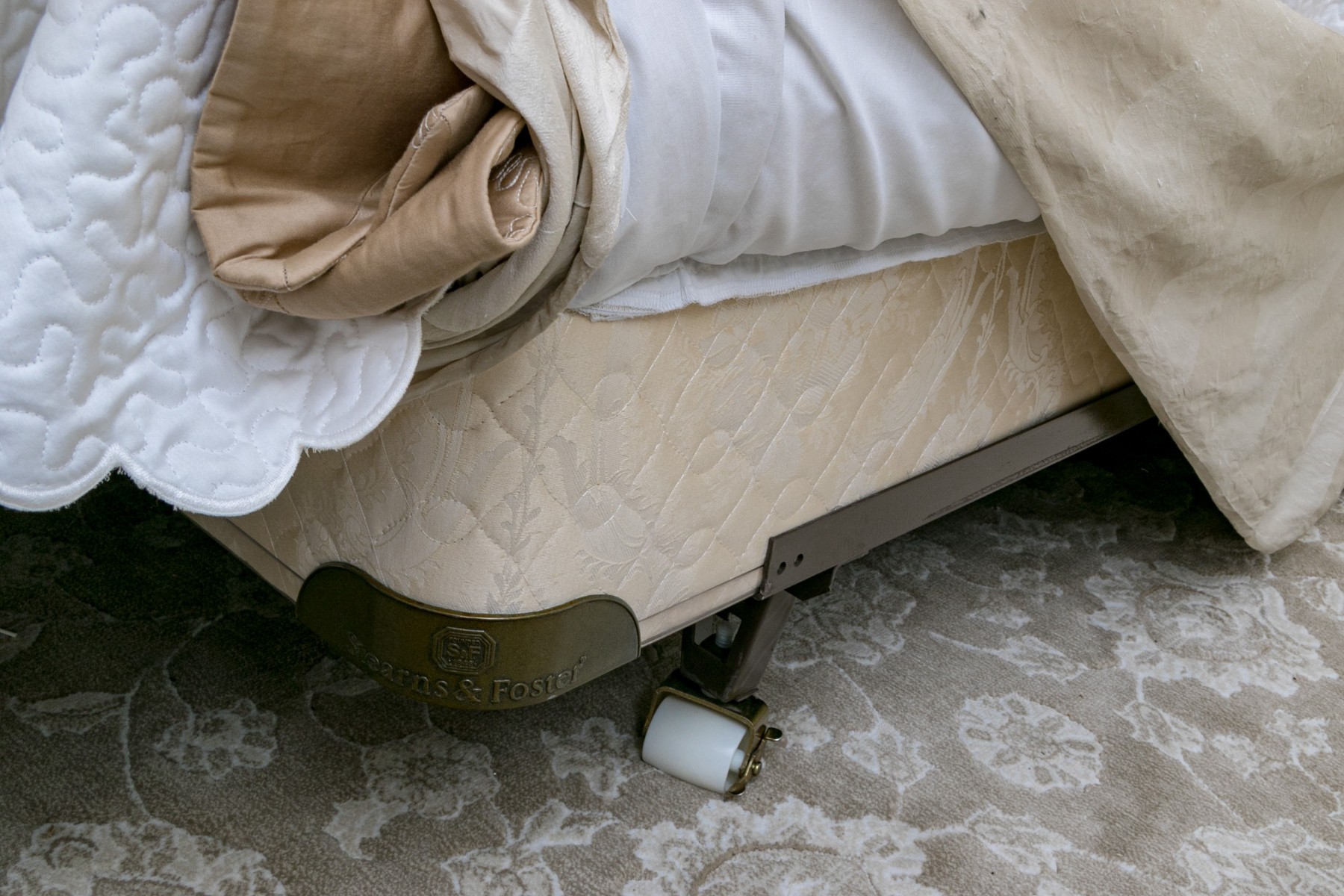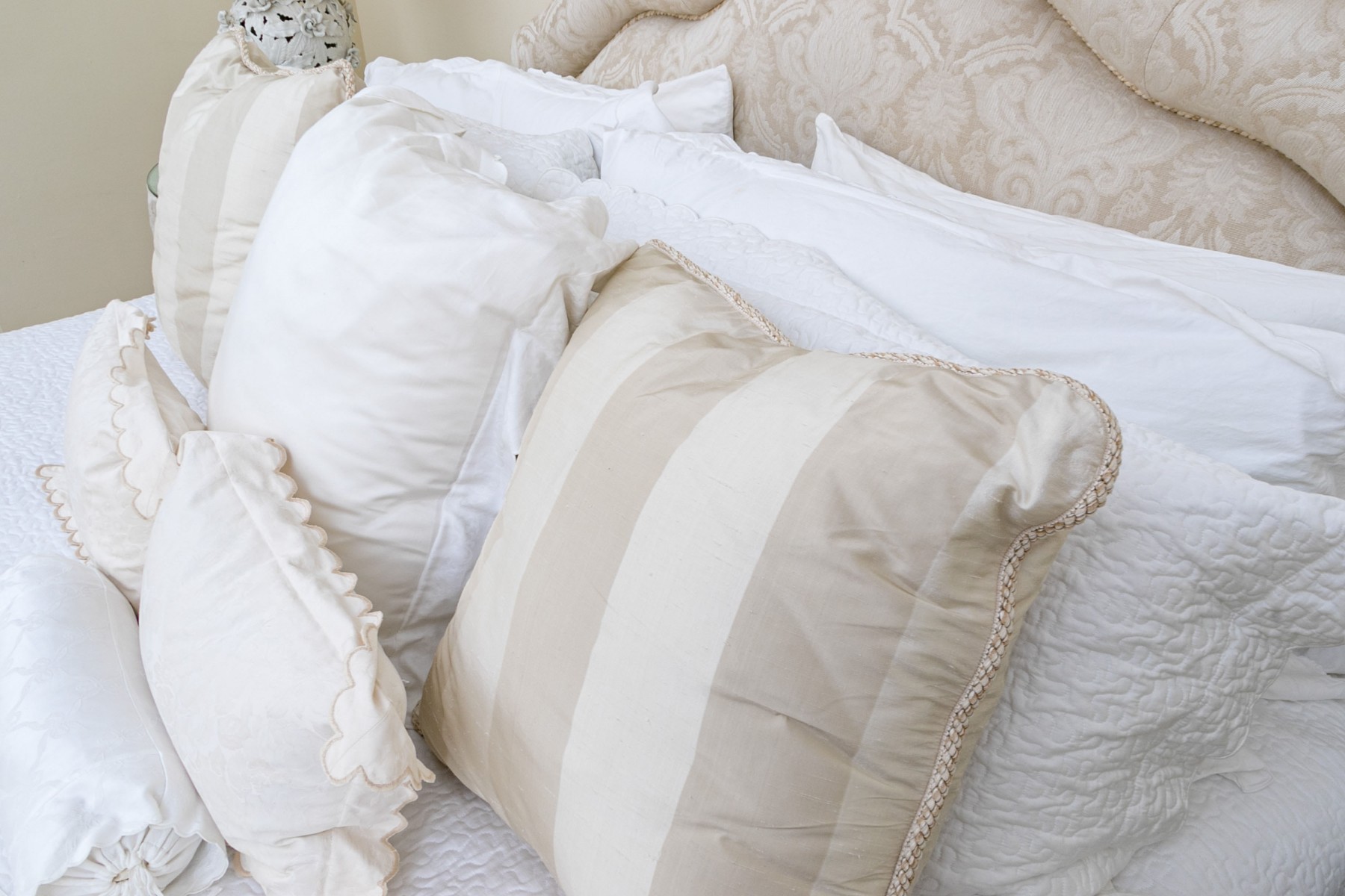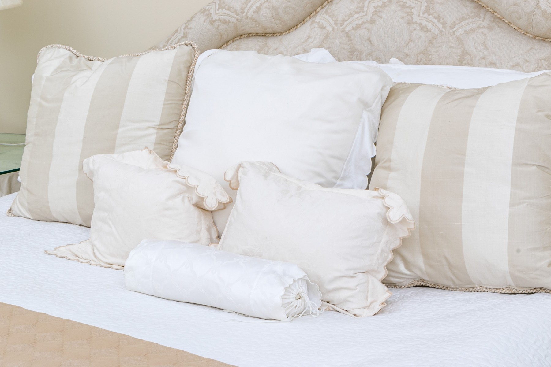 Beige cotton piped head board complete with bedstead, mattress, Harvard frame, linens, and pillows.