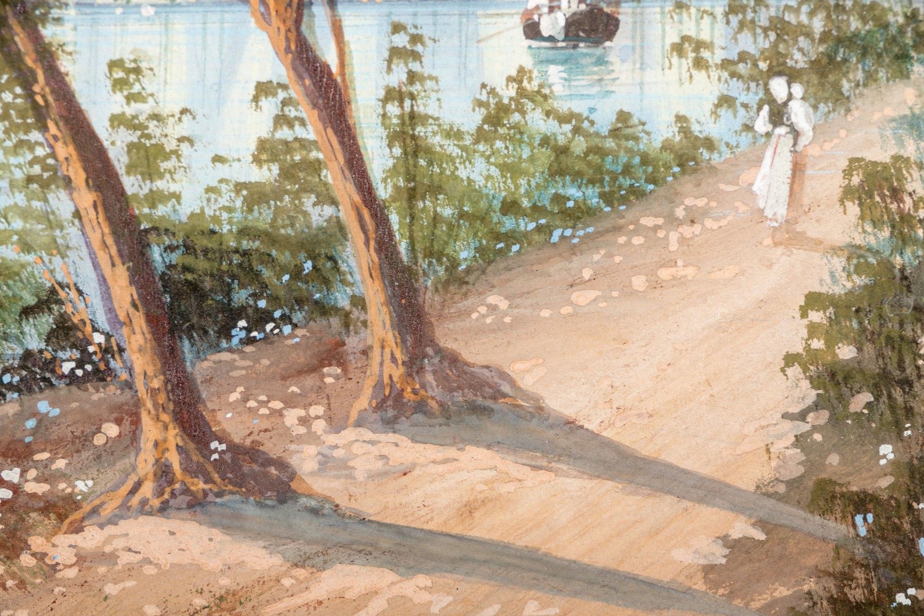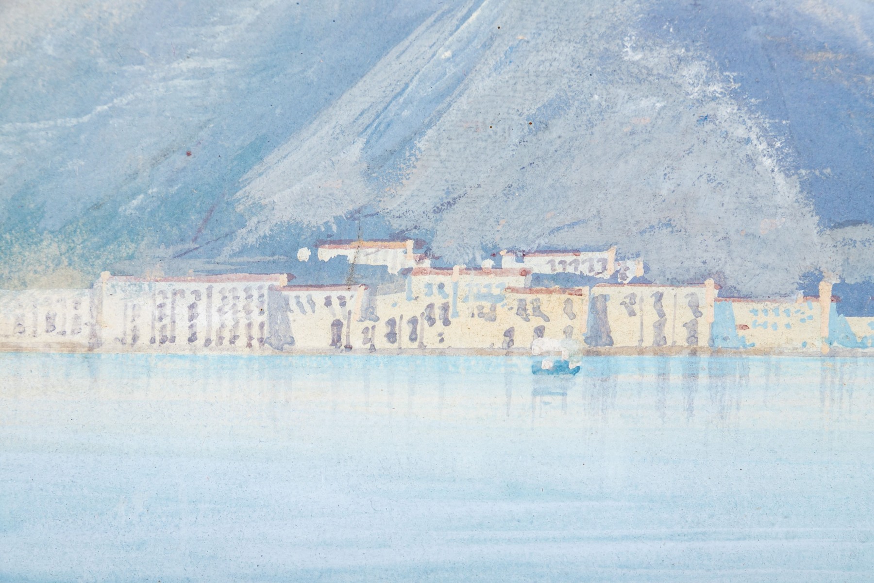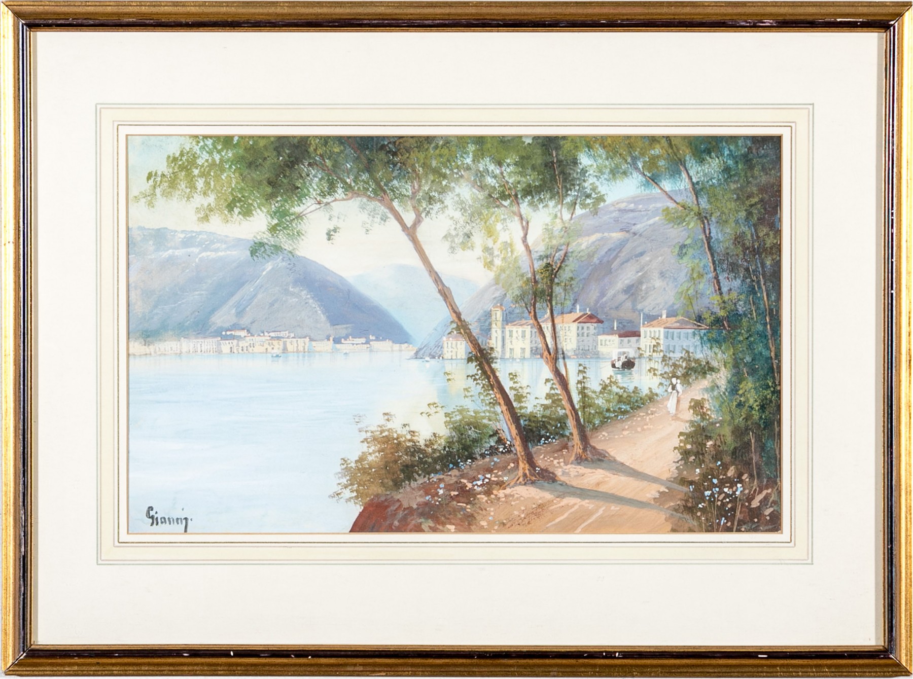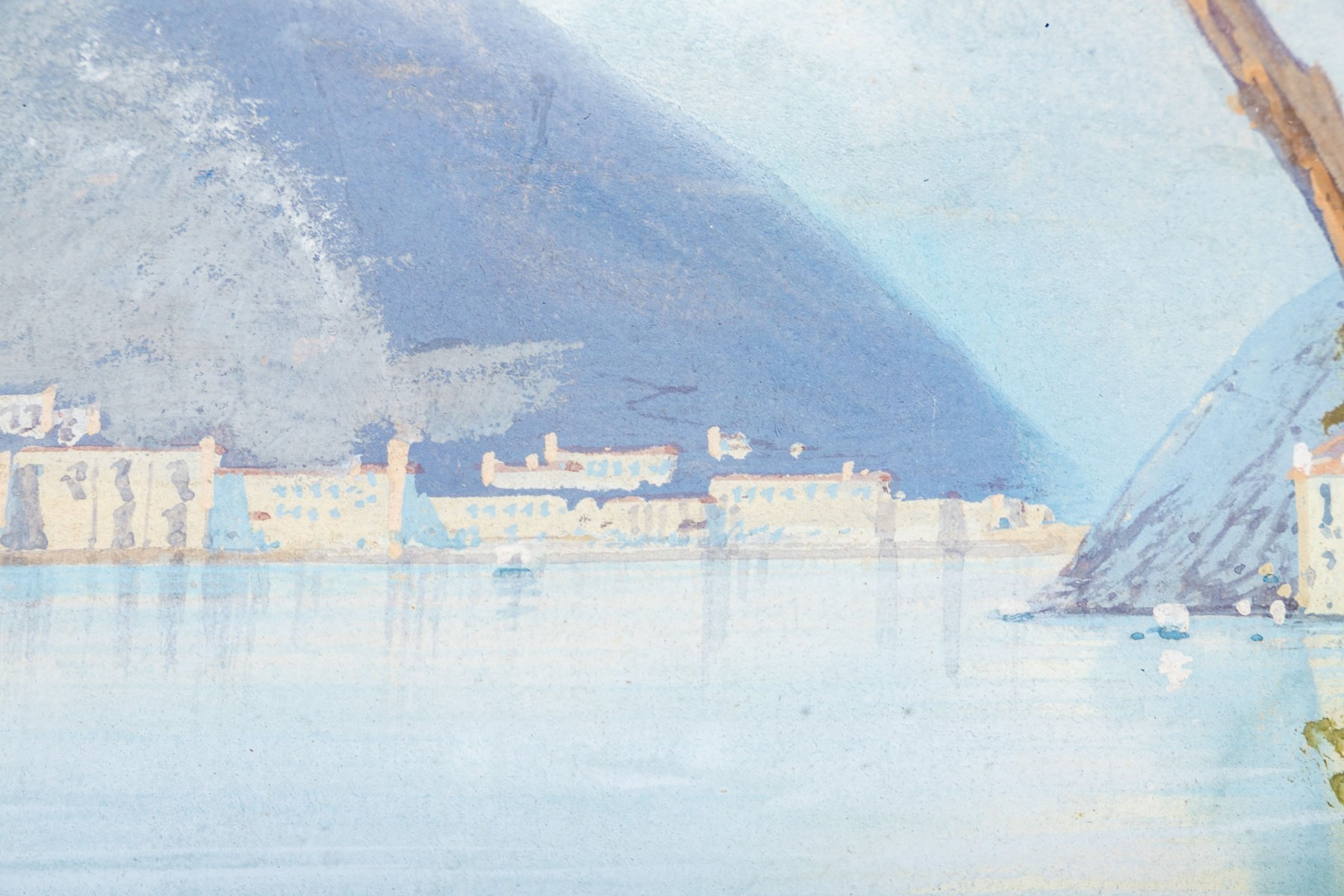 Signed lower right. Several large estates and a church line the pale blue waterway below the mauve mountains. A lone figure walks along the shore. Presented in a gilt frame with glass.