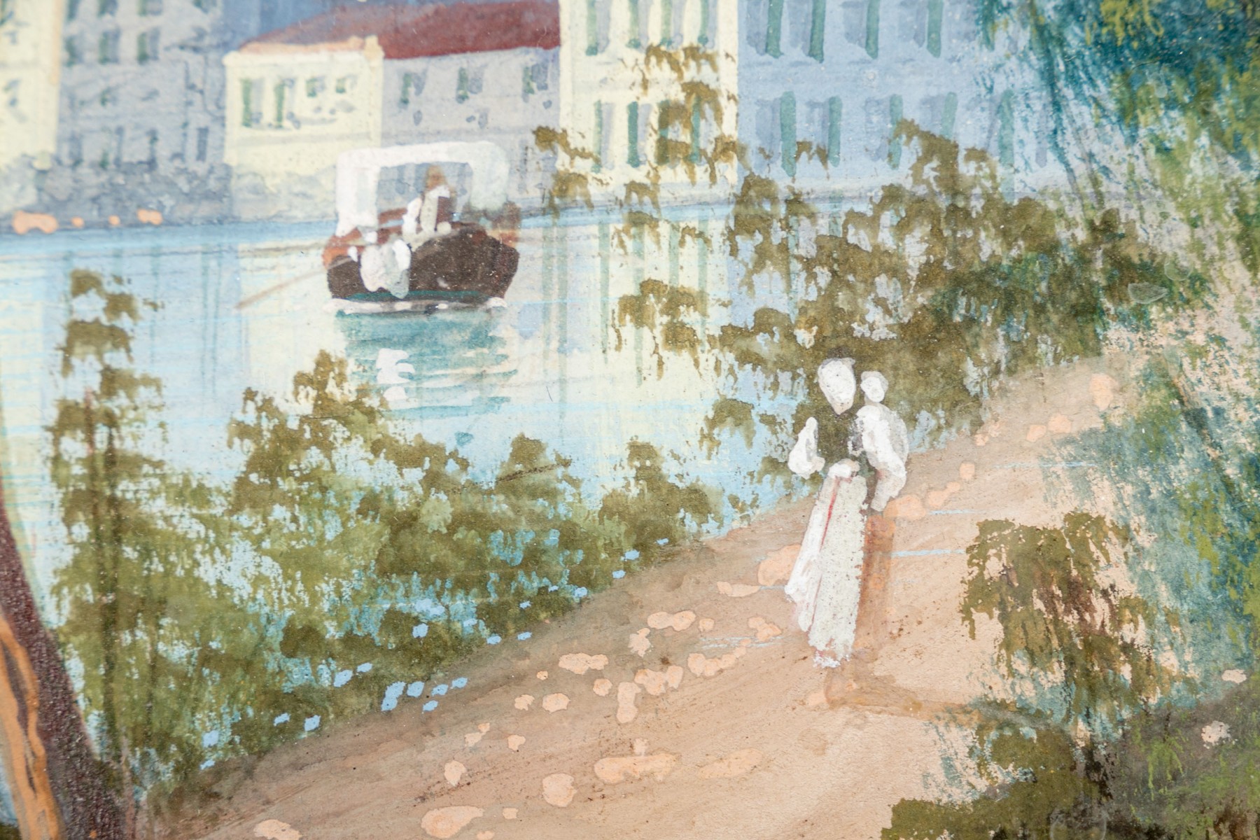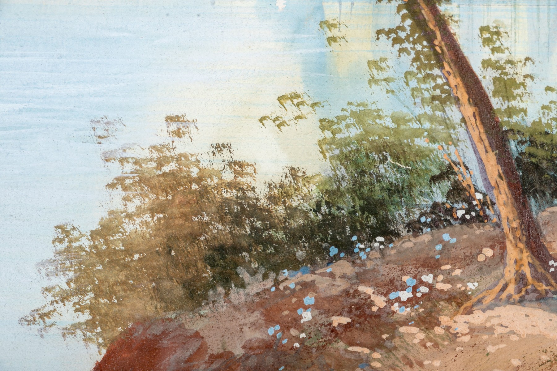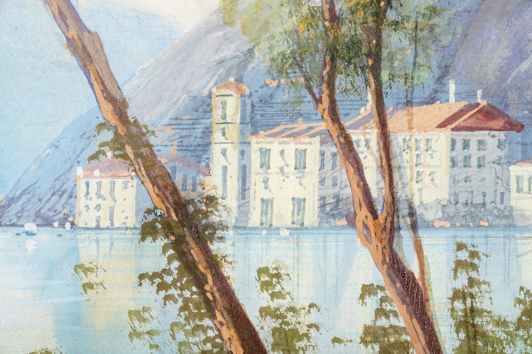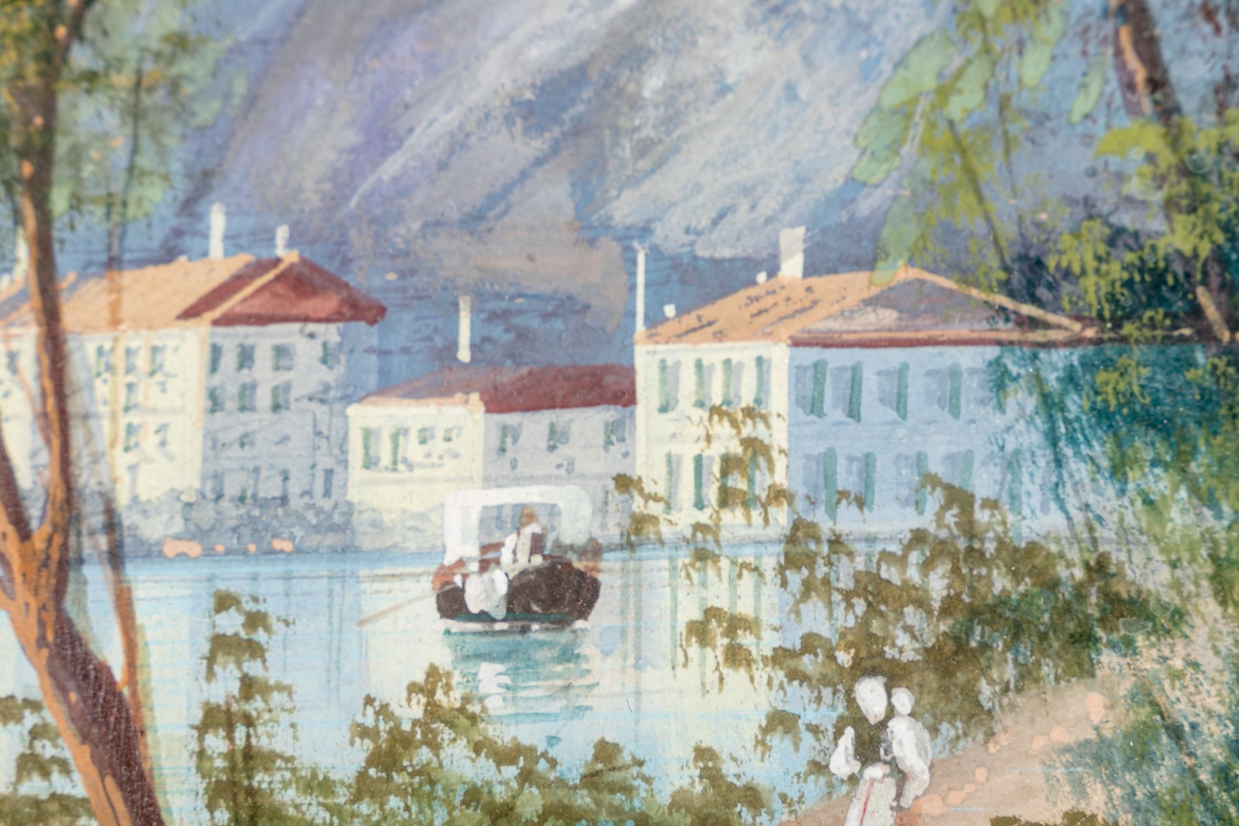 Signed lower right. Several large estates and a church line the pale blue waterway below the mauve mountains. A lone figure walks along the shore. Presented in a gilt frame with glass.
