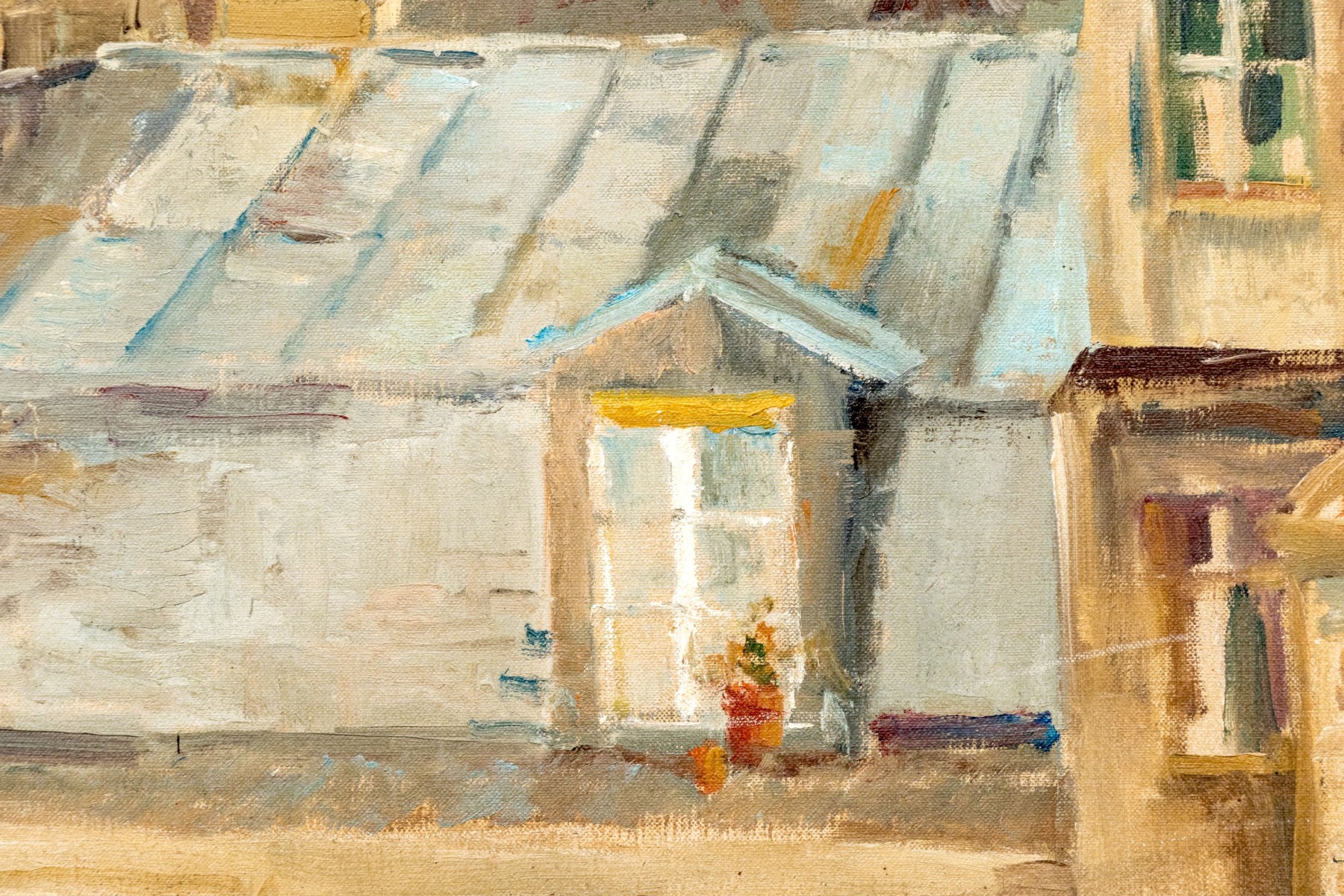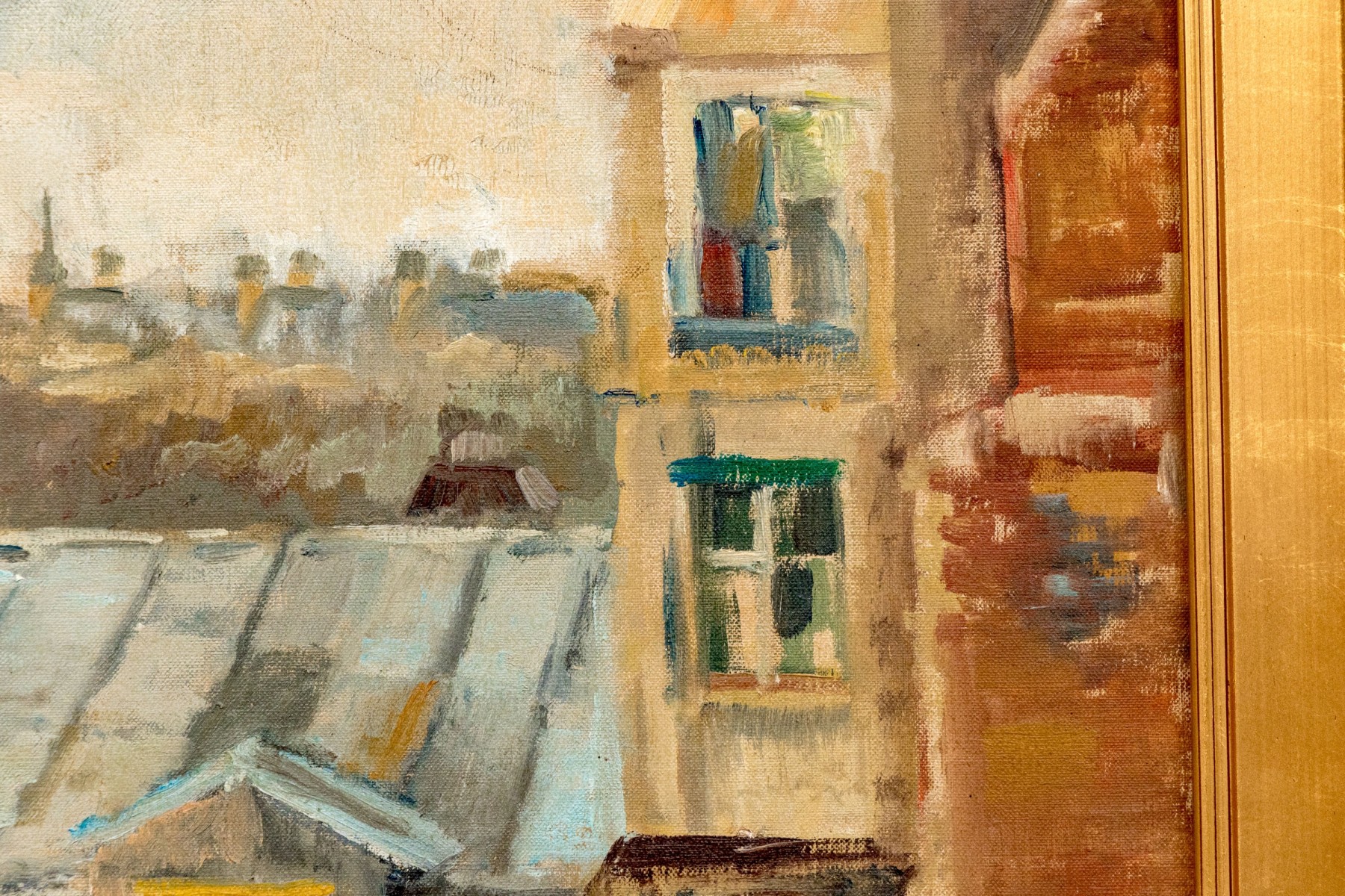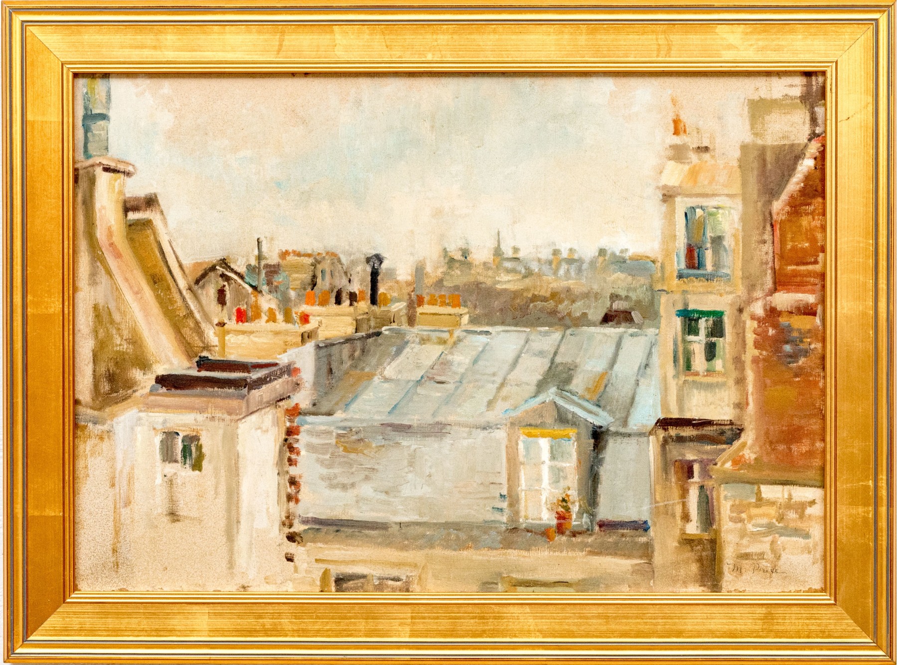 Signed lower right. A charming view of gray roof tops and windows overlooking a park and architecture in the distance. Presented in a fine gilt frame.