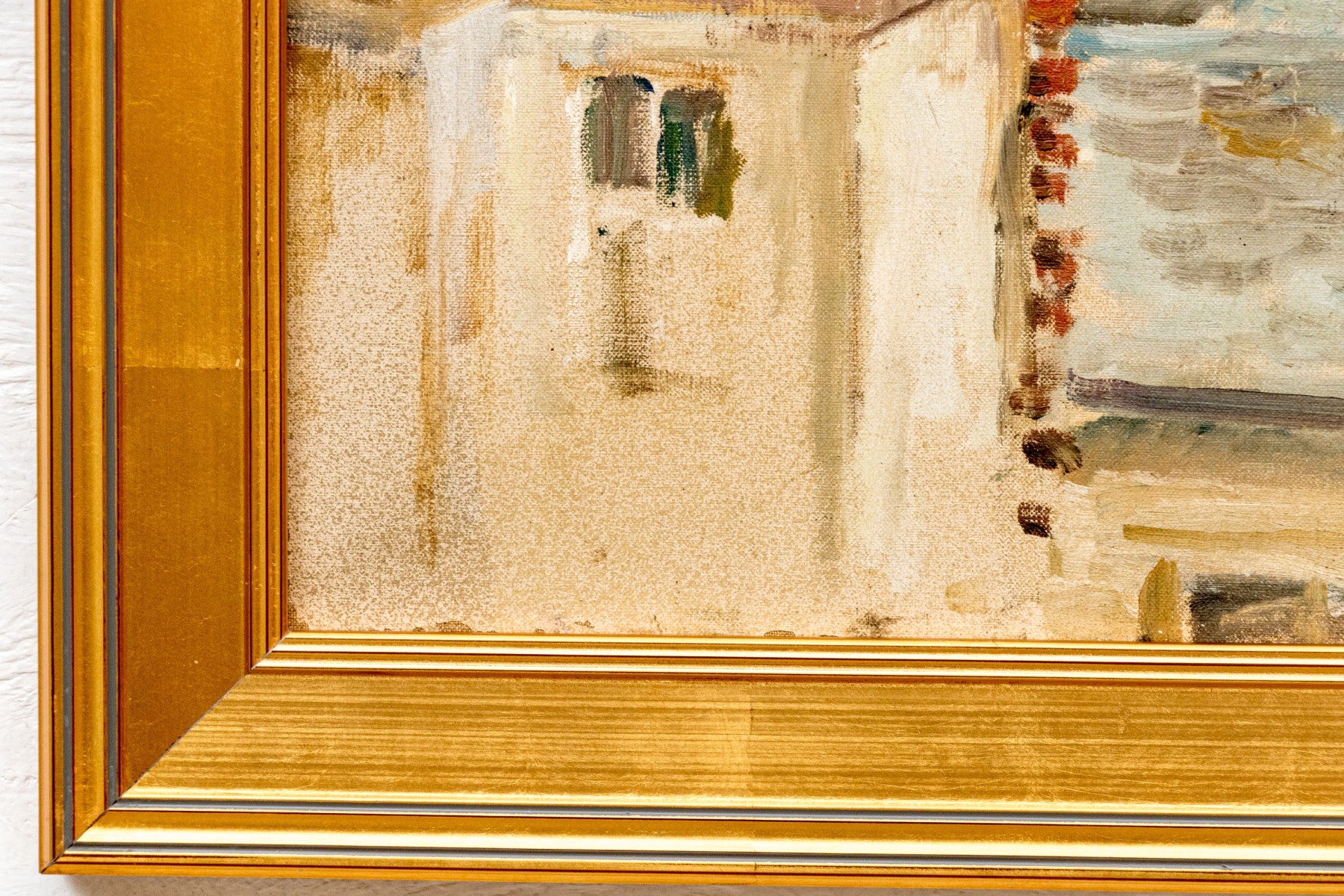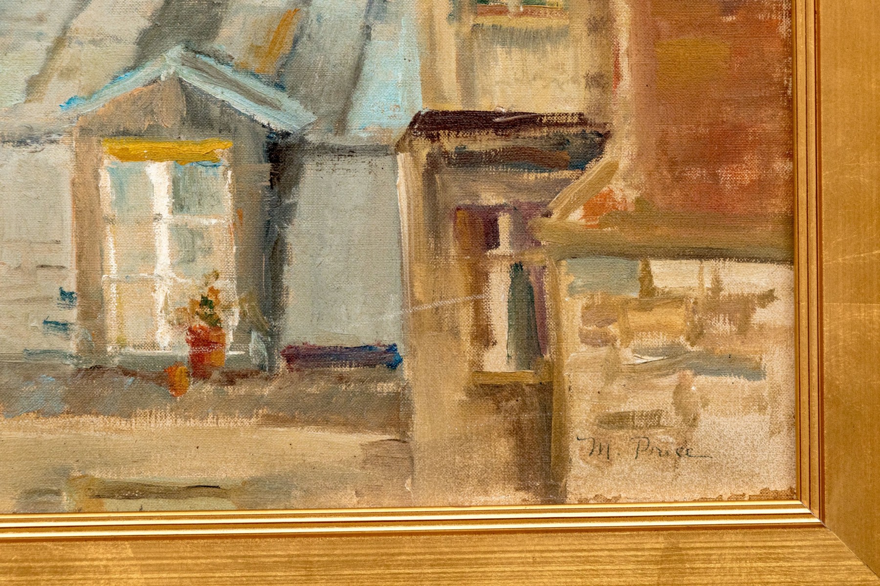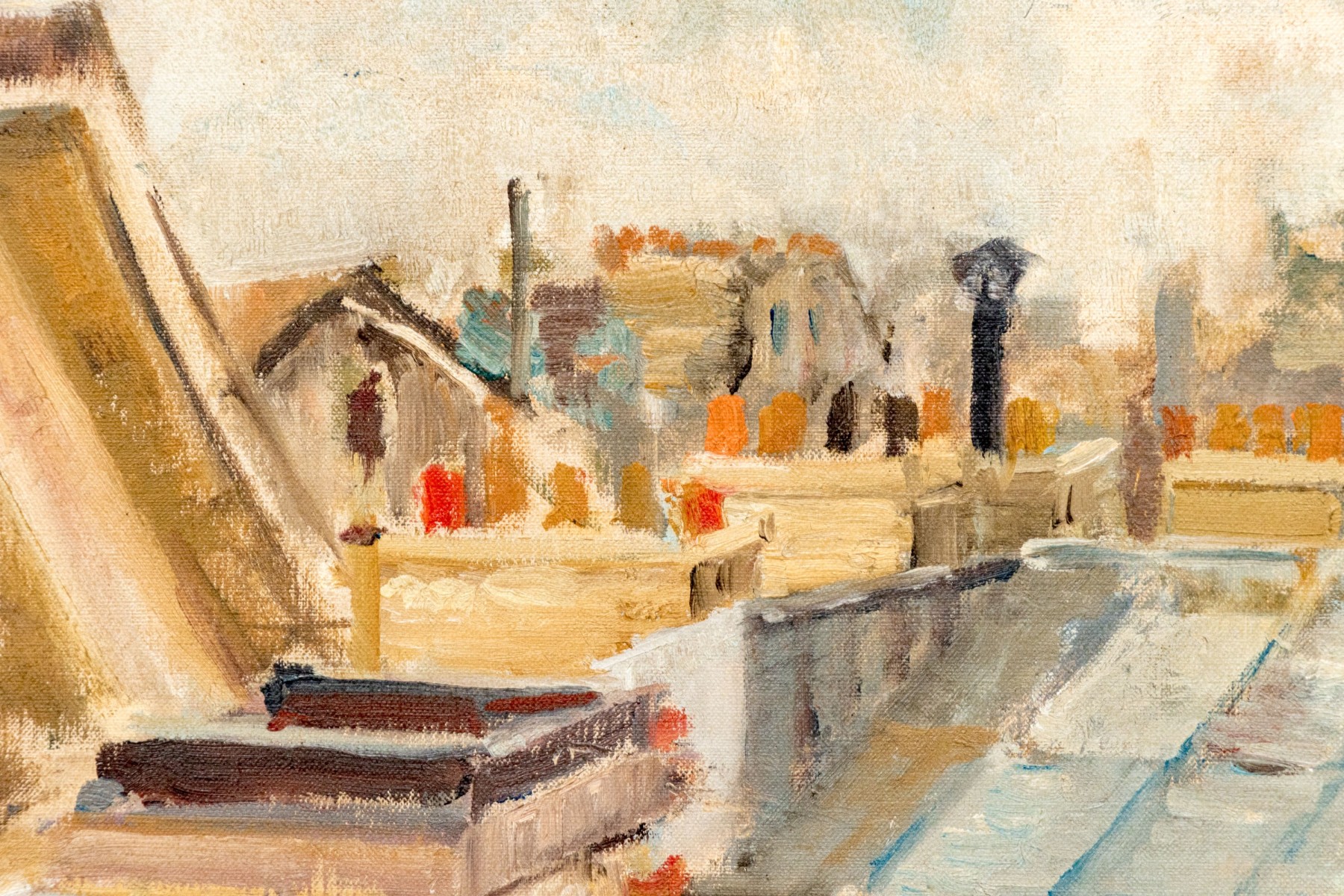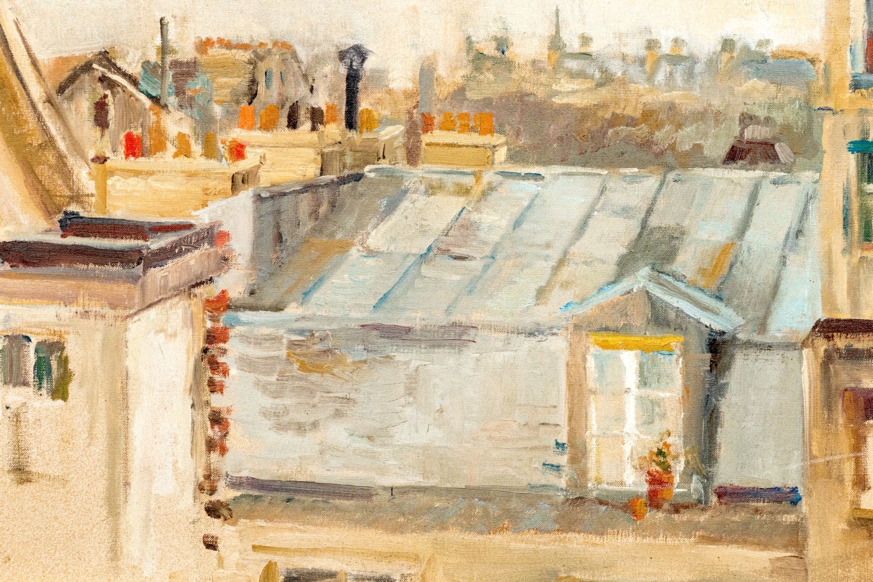 Signed lower right. A charming view of gray roof tops and windows overlooking a park and architecture in the distance. Presented in a fine gilt frame.