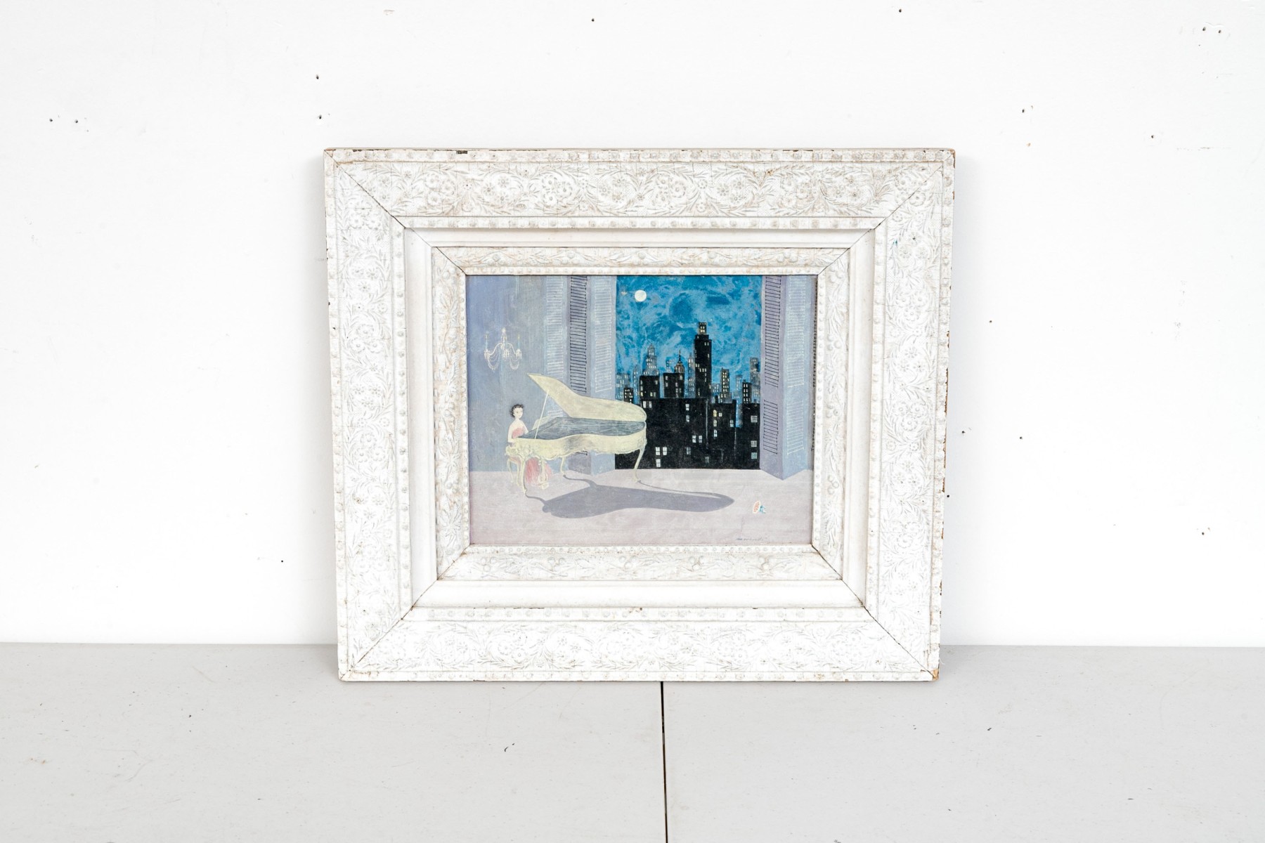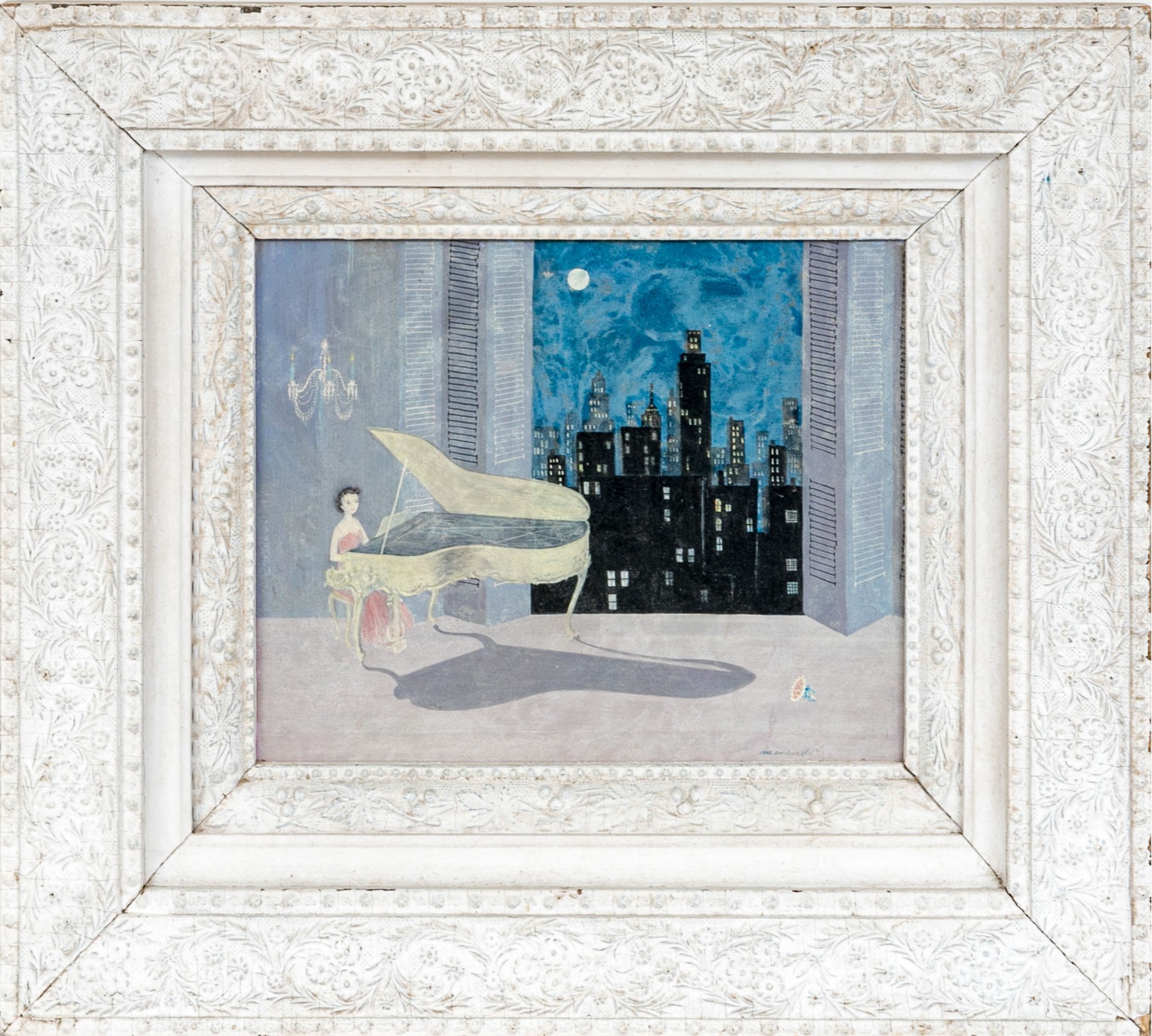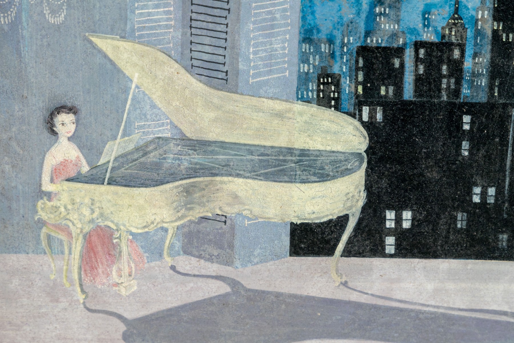 Lovely painting depicting a woman seated at a grand piano in a large space with city scene in background.