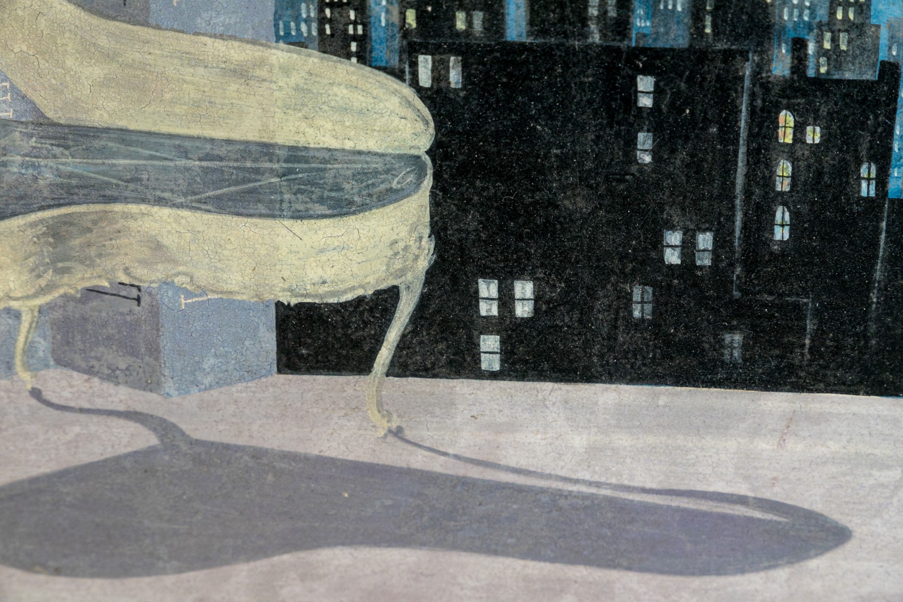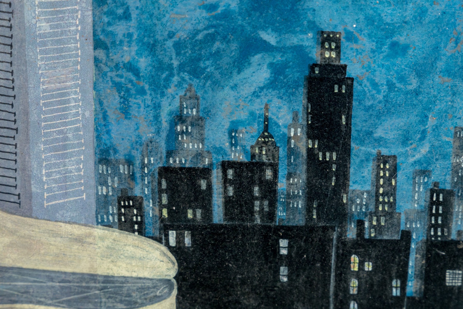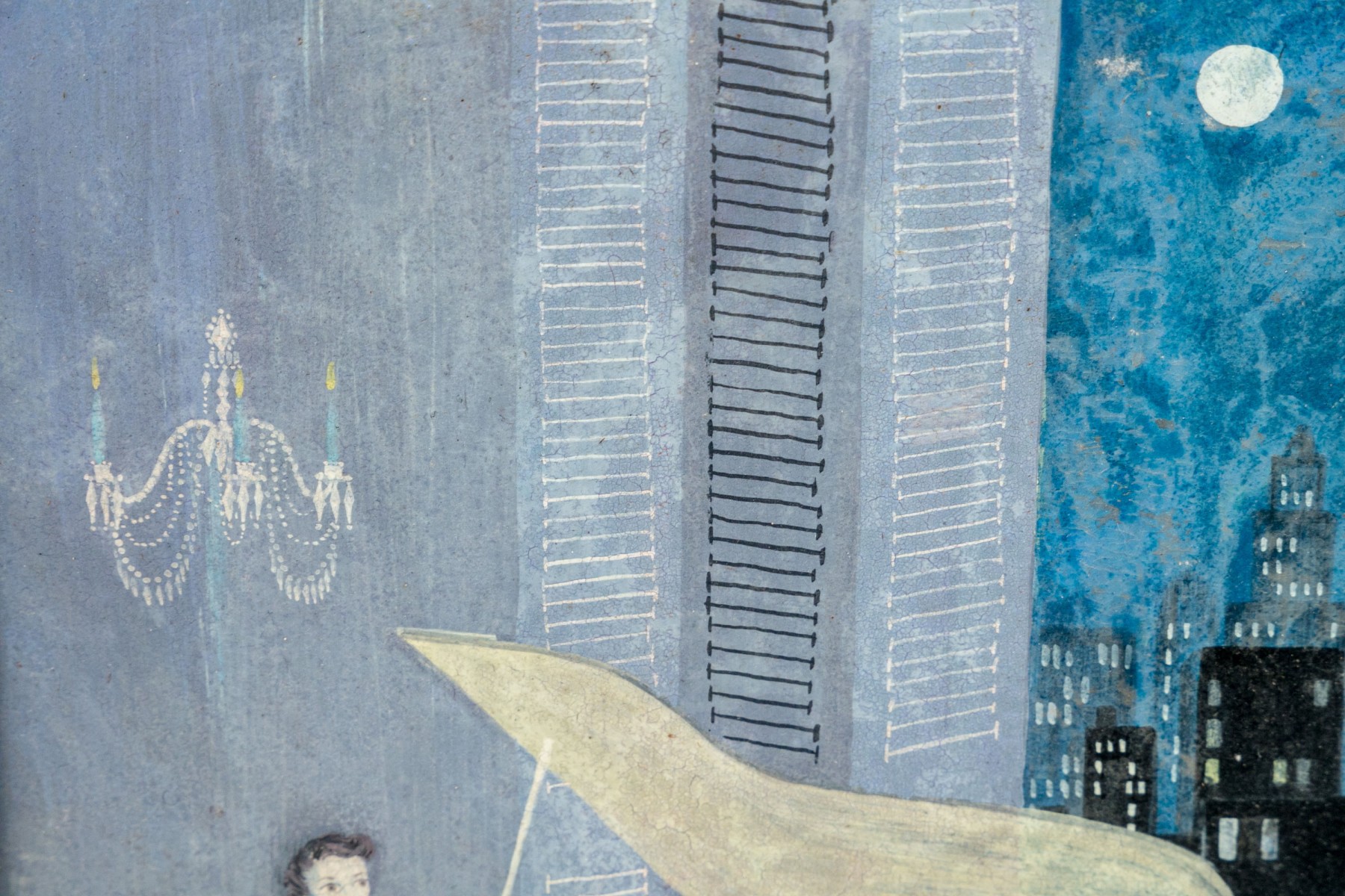 Lovely painting depicting a woman seated at a grand piano in a large space with city scene in background.