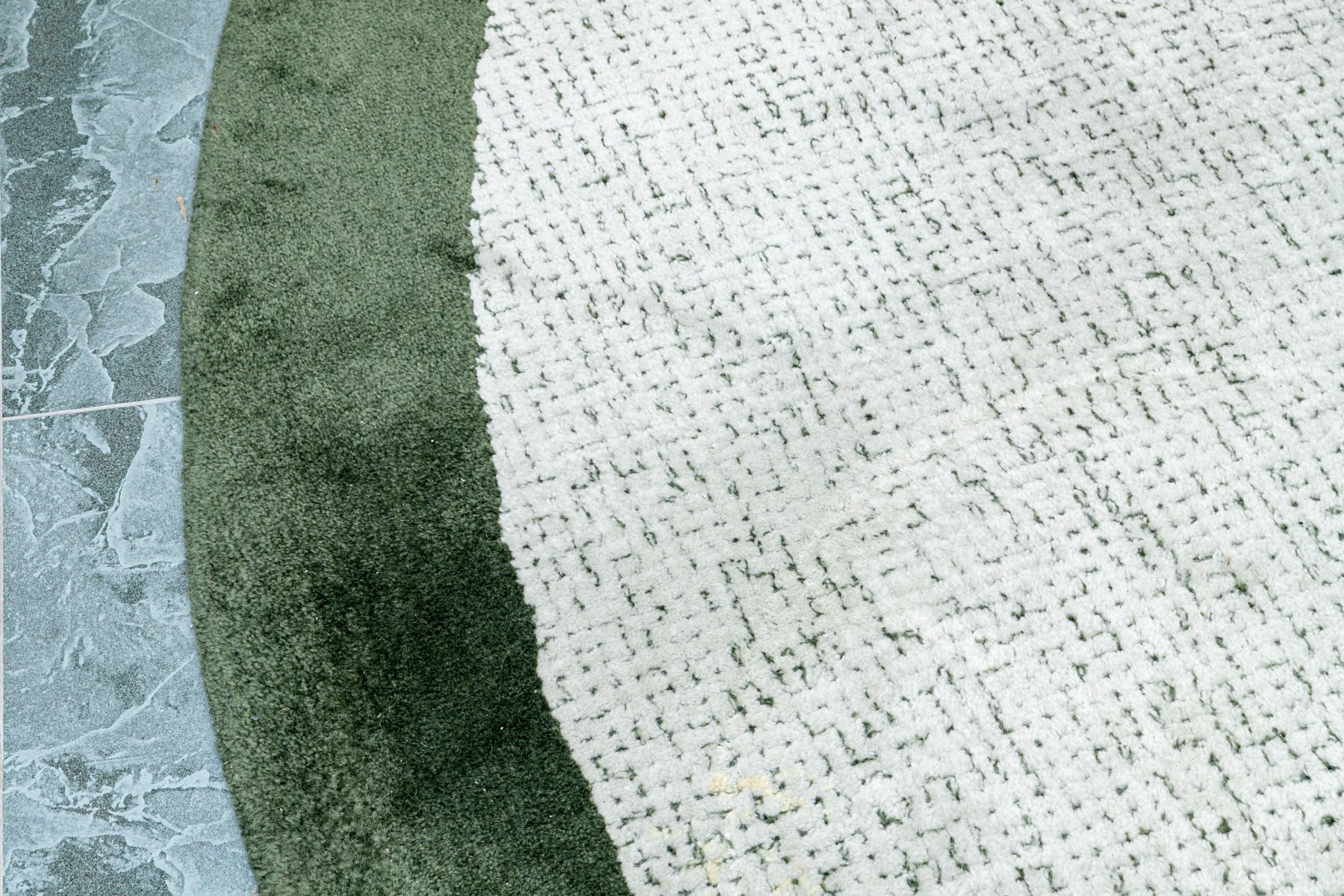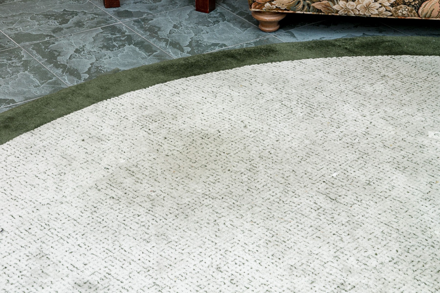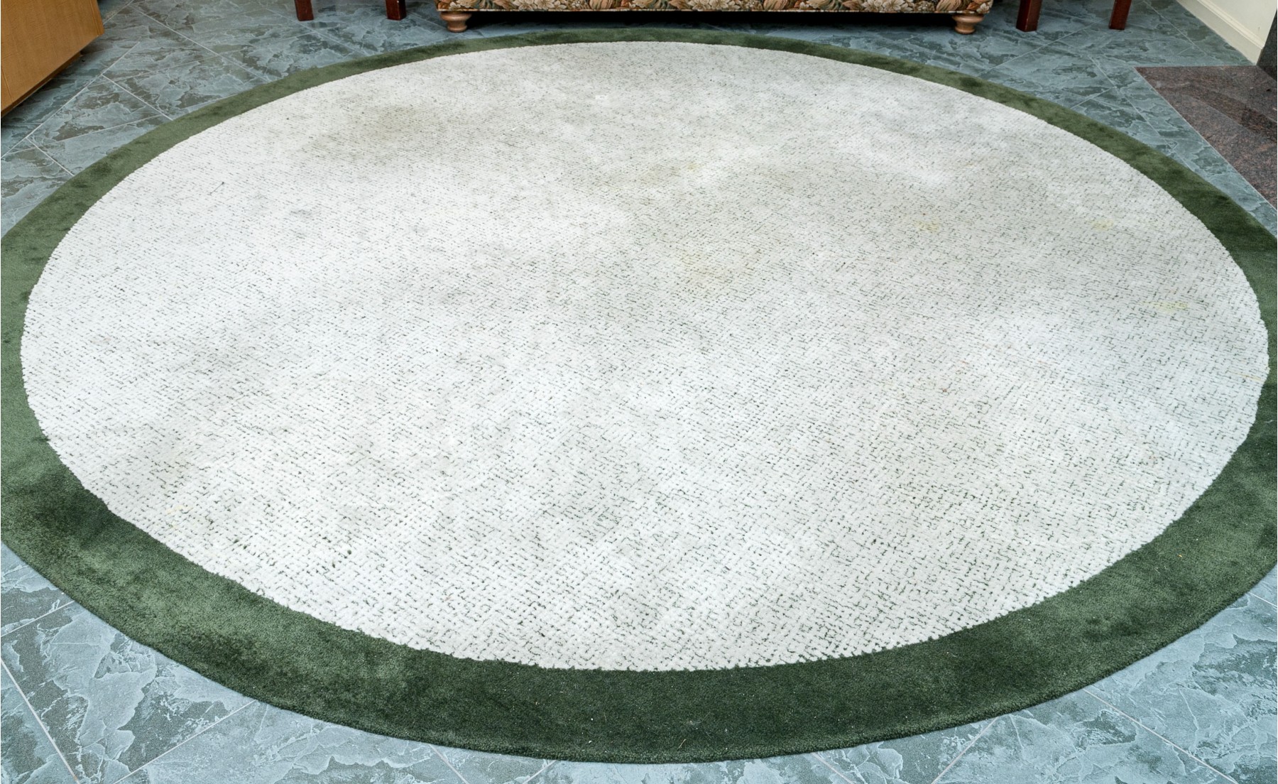 A wonderful circular machine made wool rug displaying a green border around a white field.