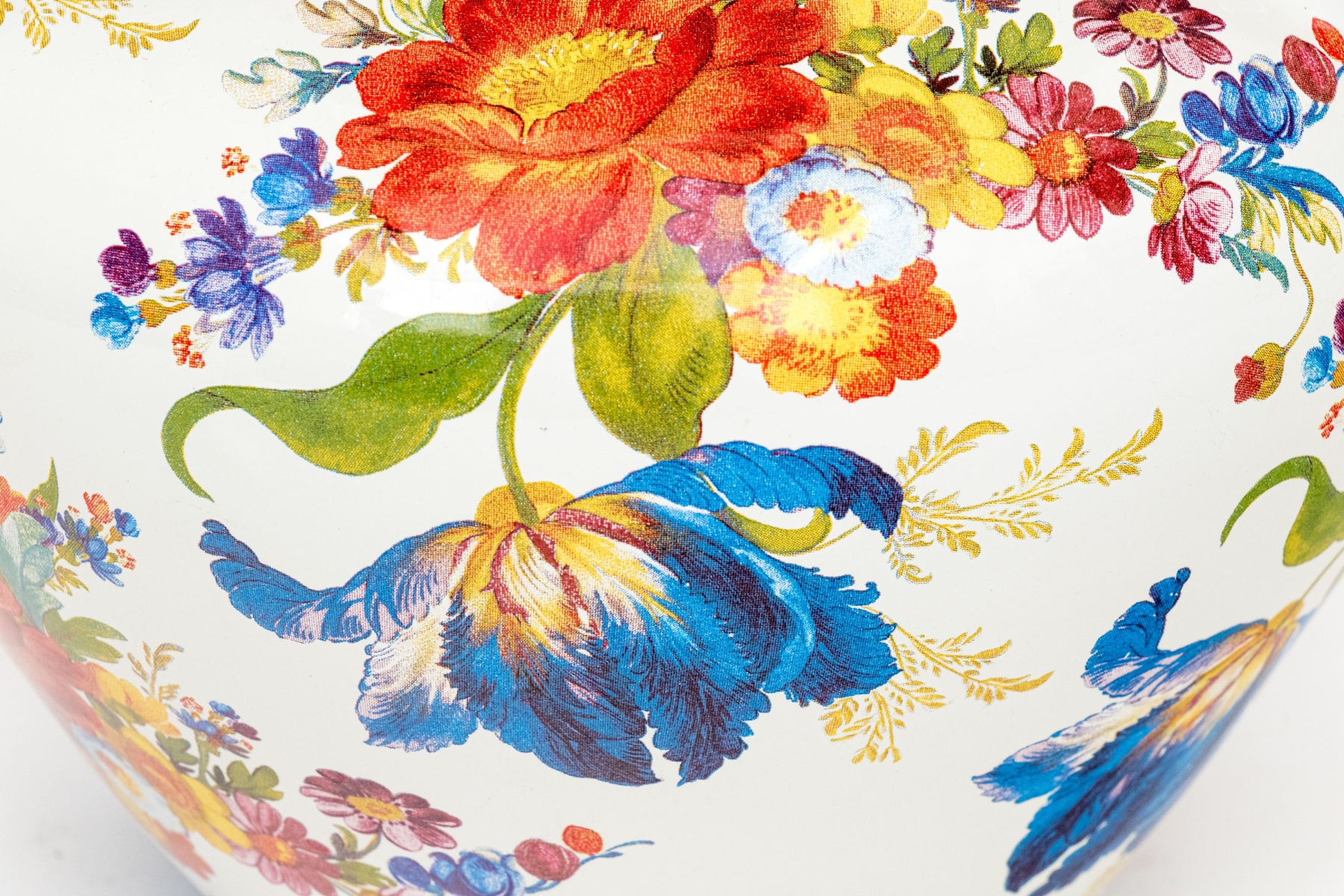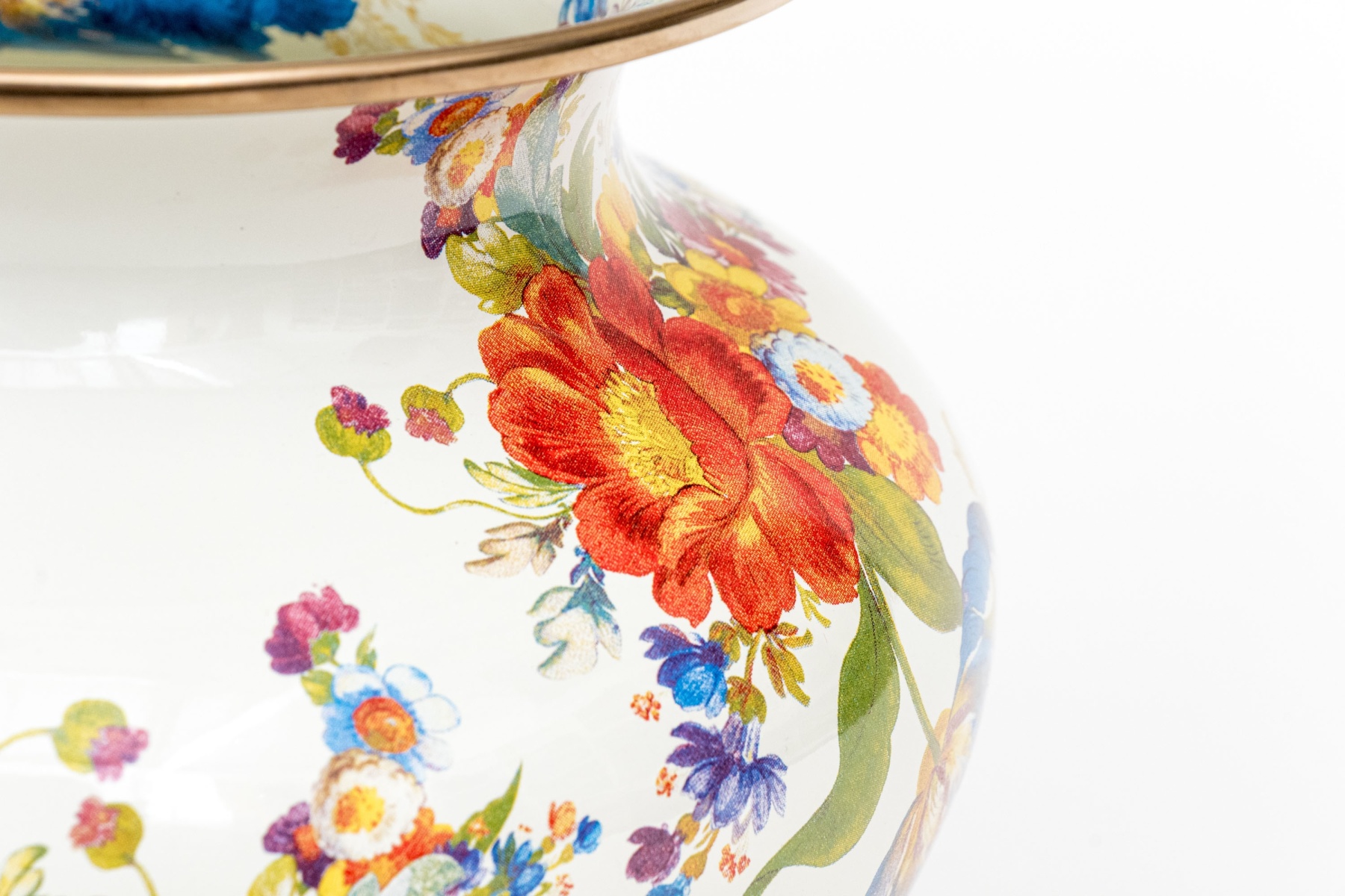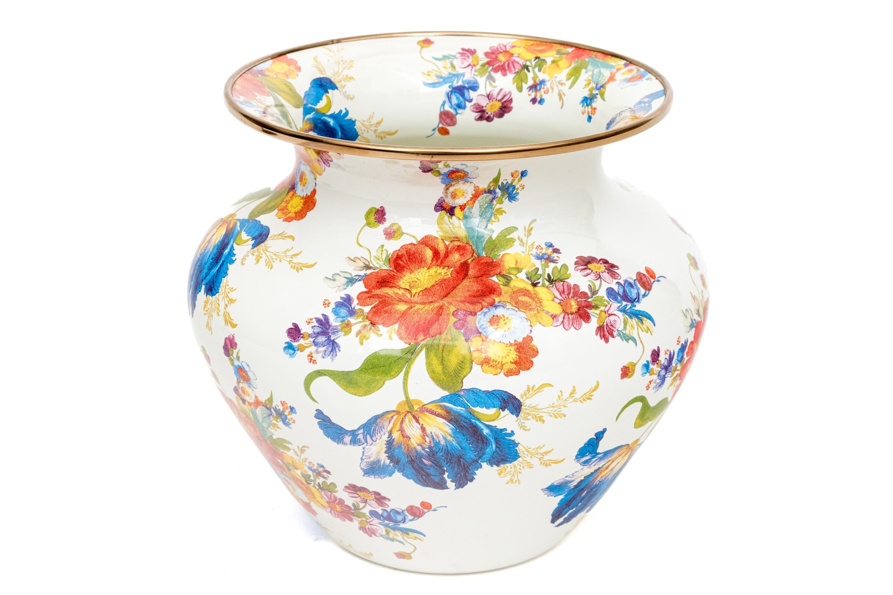 A charming MacKenzie-Childs "Flower Market" vase enameled white with pretty painterly floral sprays in vibrant red, blue, yellow, purple, and green. The vasse sports a wide flared rim, short neck, and rotund apple form body. Marked underfoot.