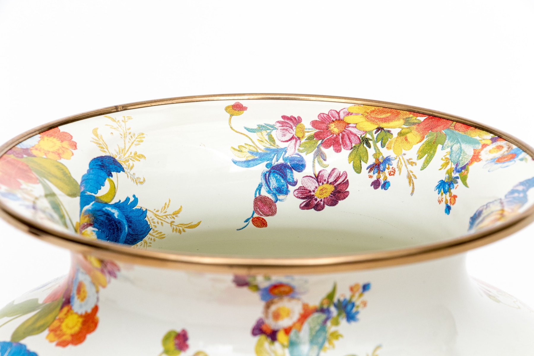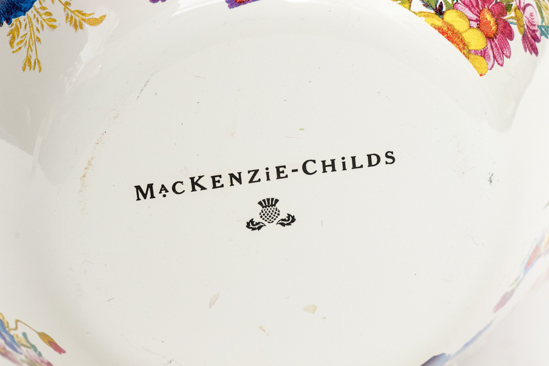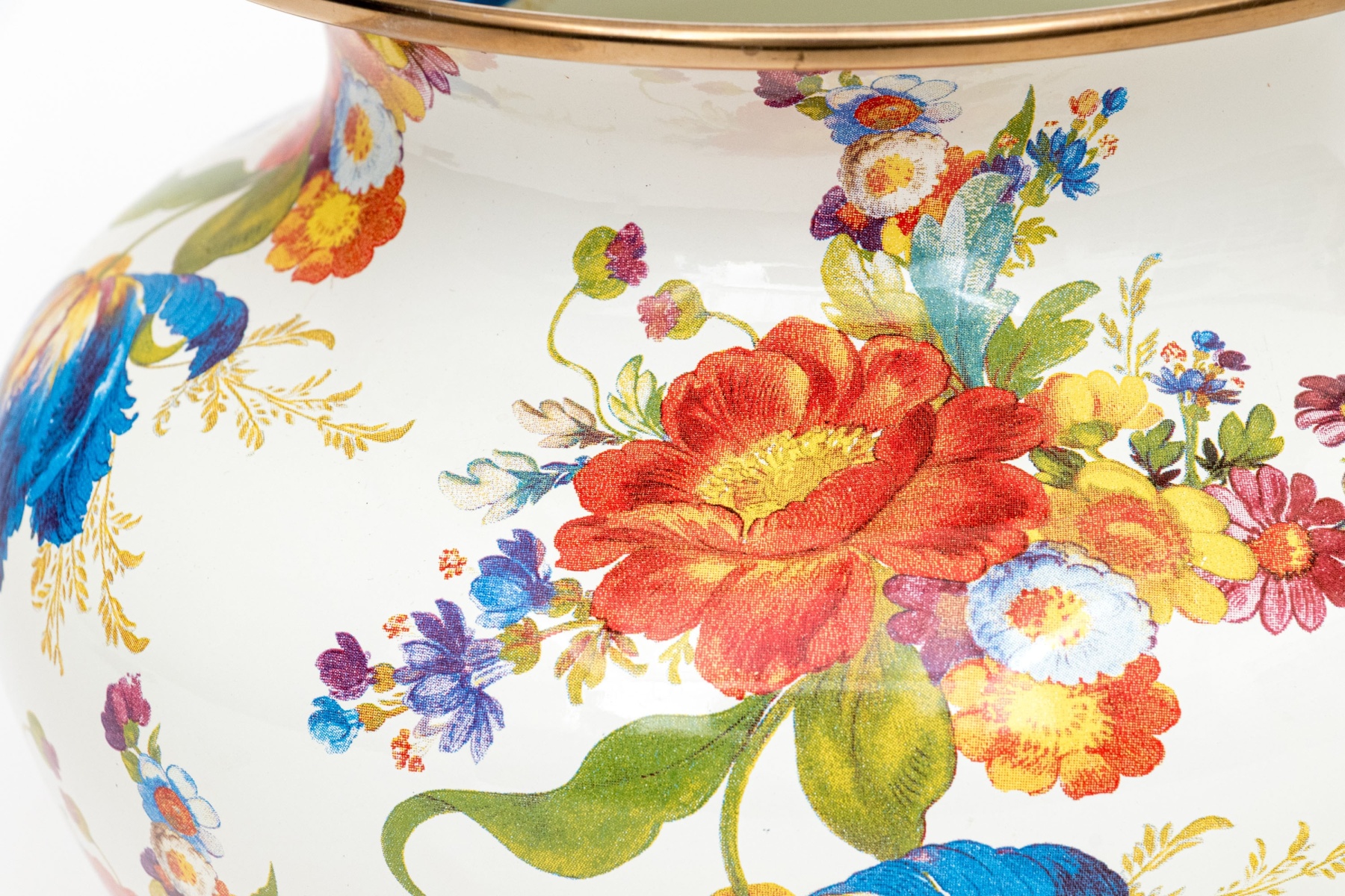 A charming MacKenzie-Childs "Flower Market" vase enameled white with pretty painterly floral sprays in vibrant red, blue, yellow, purple, and green. The vasse sports a wide flared rim, short neck, and rotund apple form body. Marked underfoot.