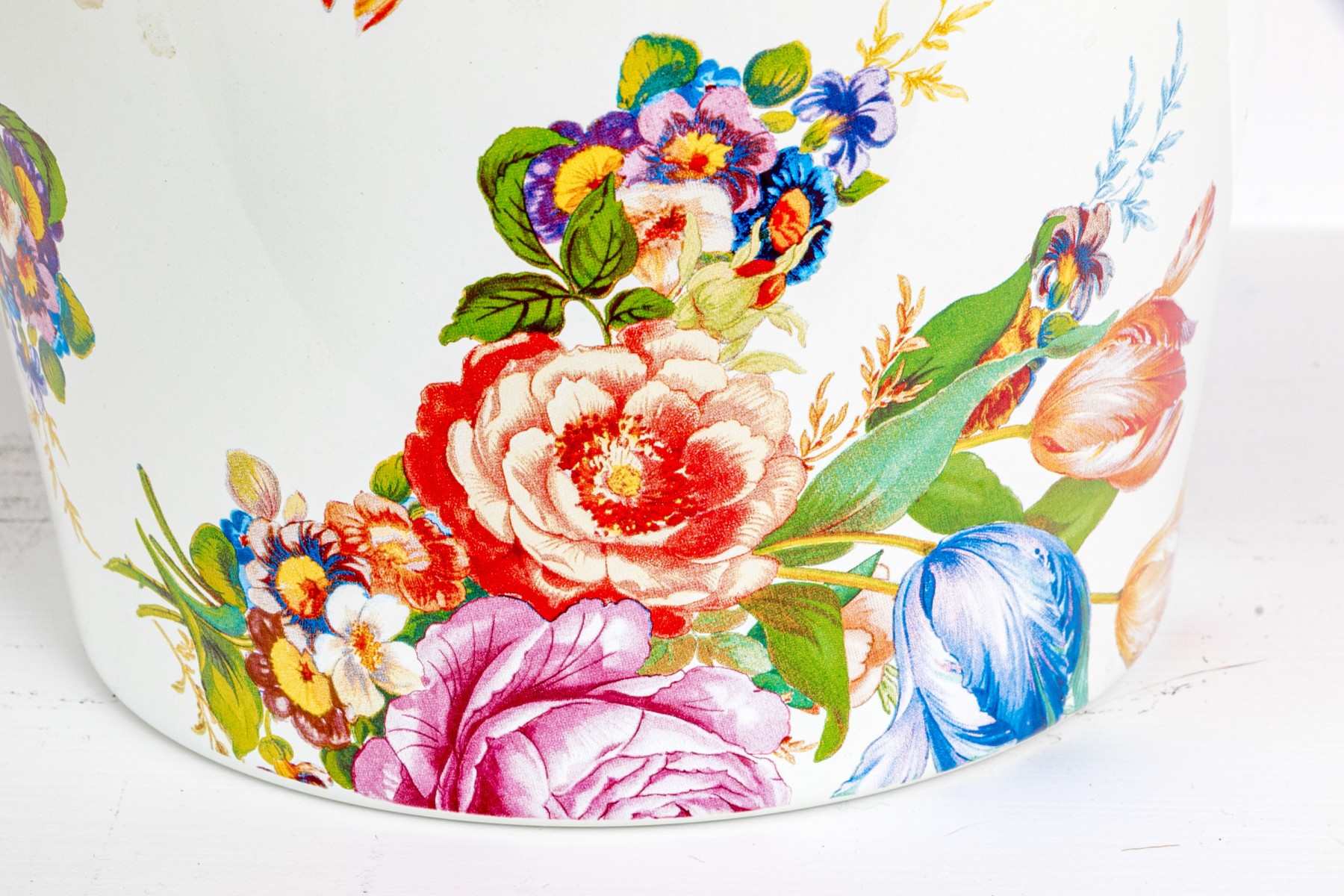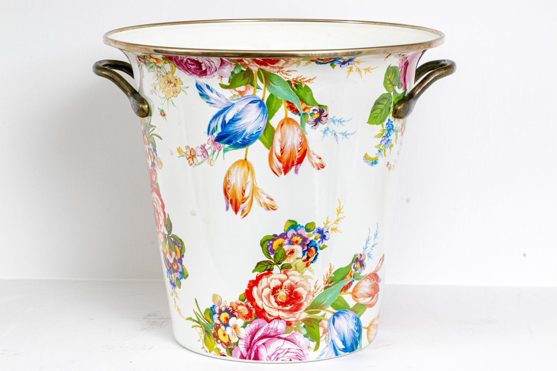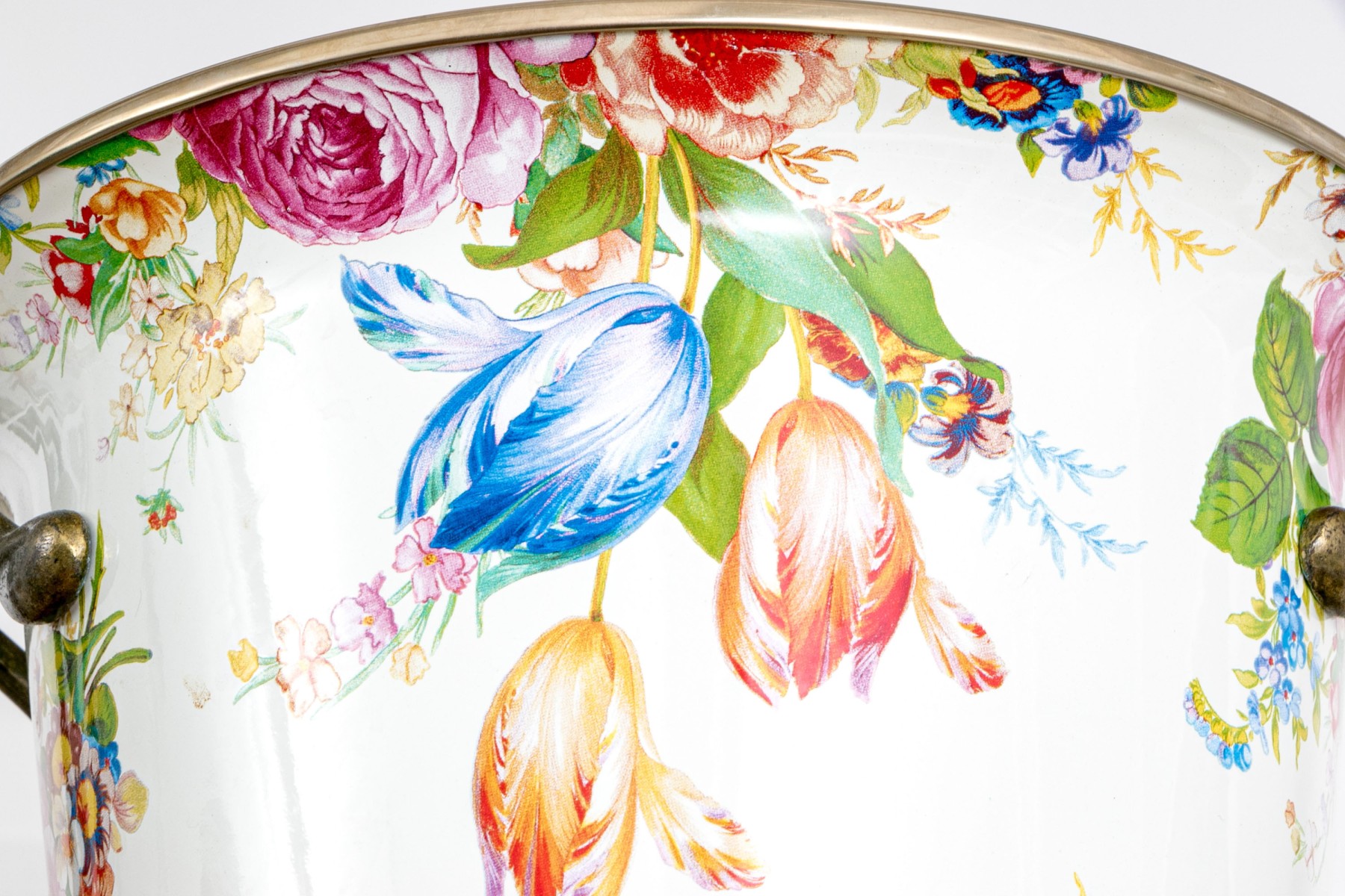 MacKenzie-Childs "Flower Market" wine cooler in tapered cylindrical form with a flared rim flanked by patinaed double handles. Enameled white throughout with pretty, vibrant floral sprays around the exterior in blue, orange, red, purple, and green. Marked underfoot.