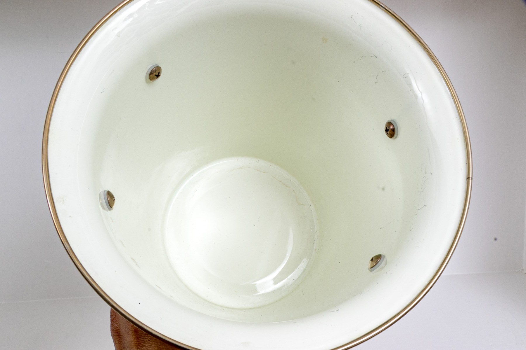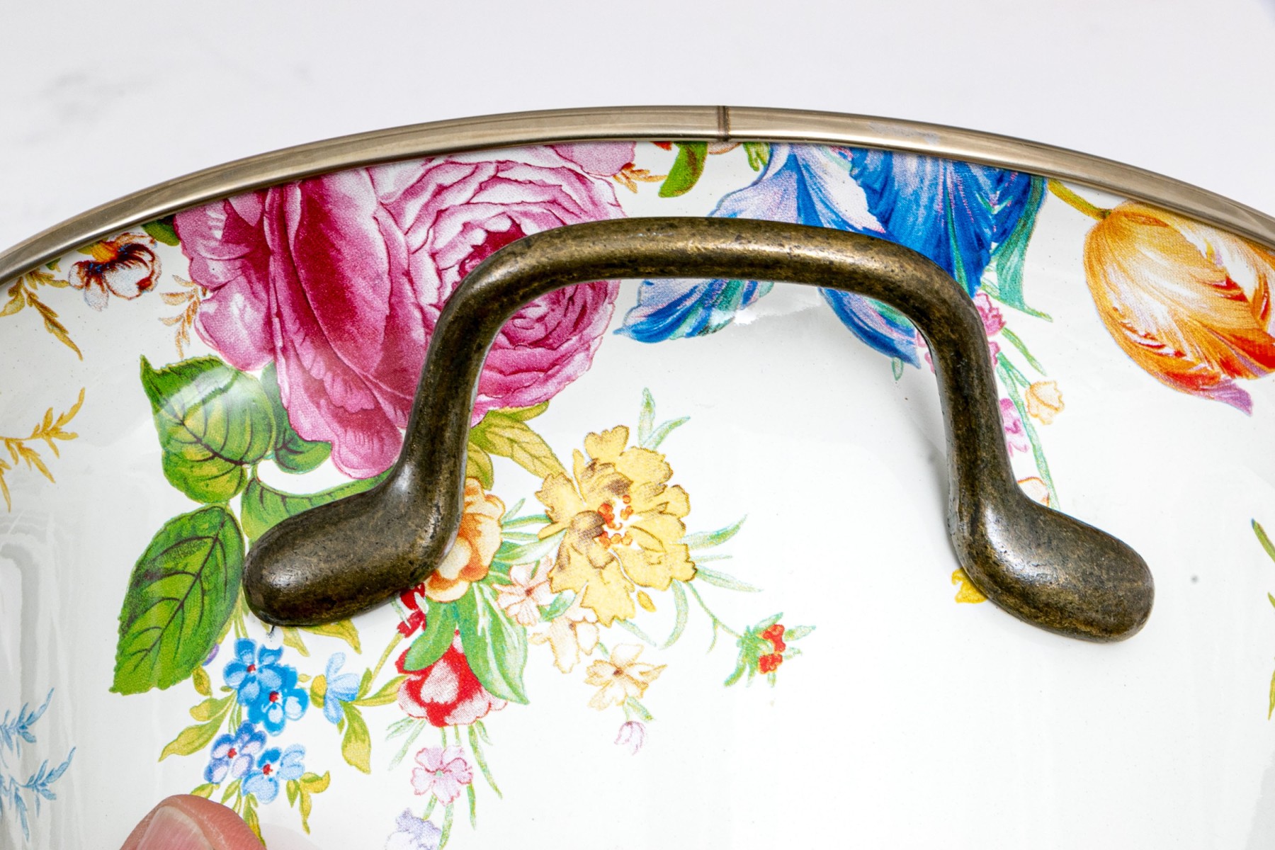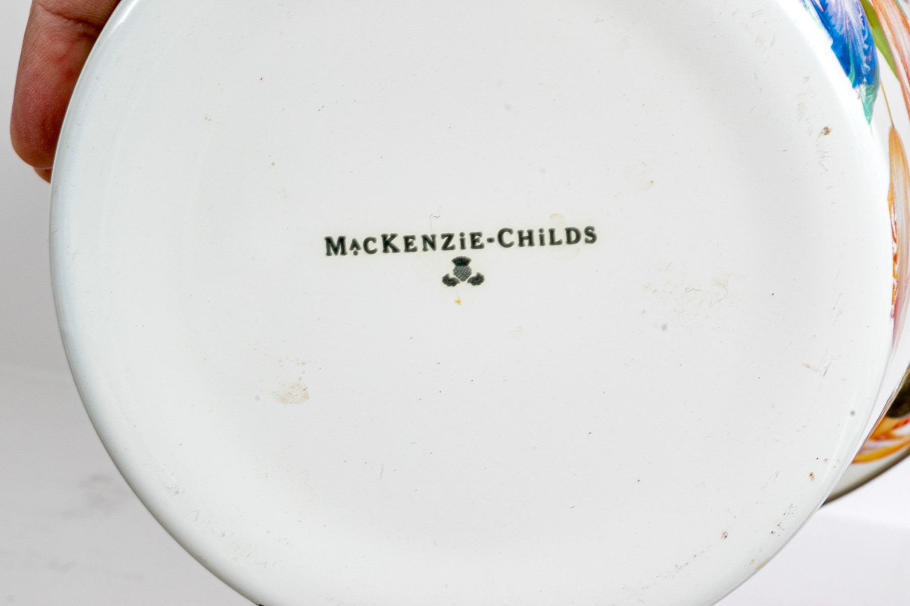 MacKenzie-Childs "Flower Market" wine cooler in tapered cylindrical form with a flared rim flanked by patinaed double handles. Enameled white throughout with pretty, vibrant floral sprays around the exterior in blue, orange, red, purple, and green. Marked underfoot.