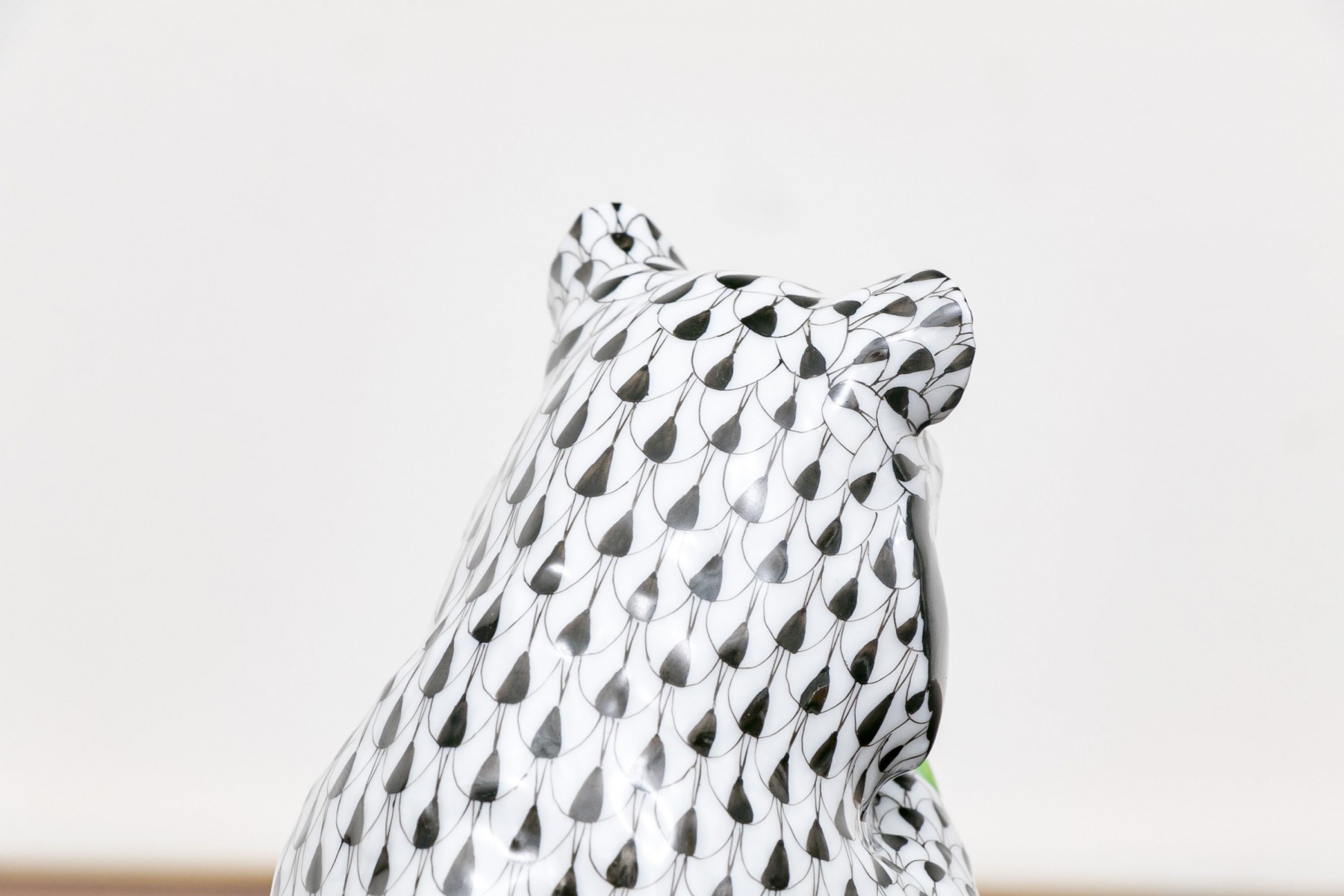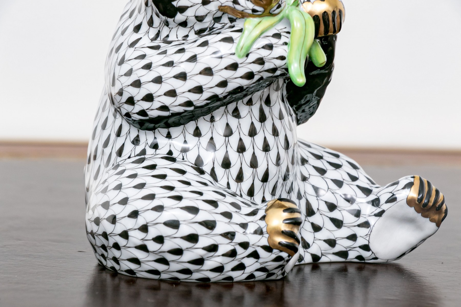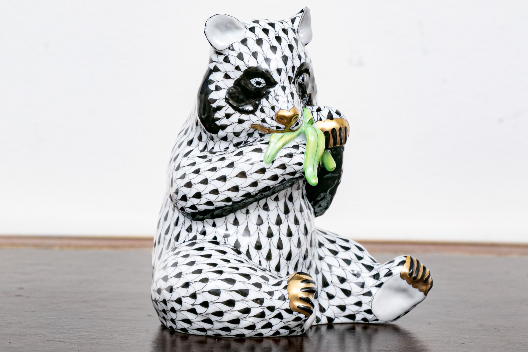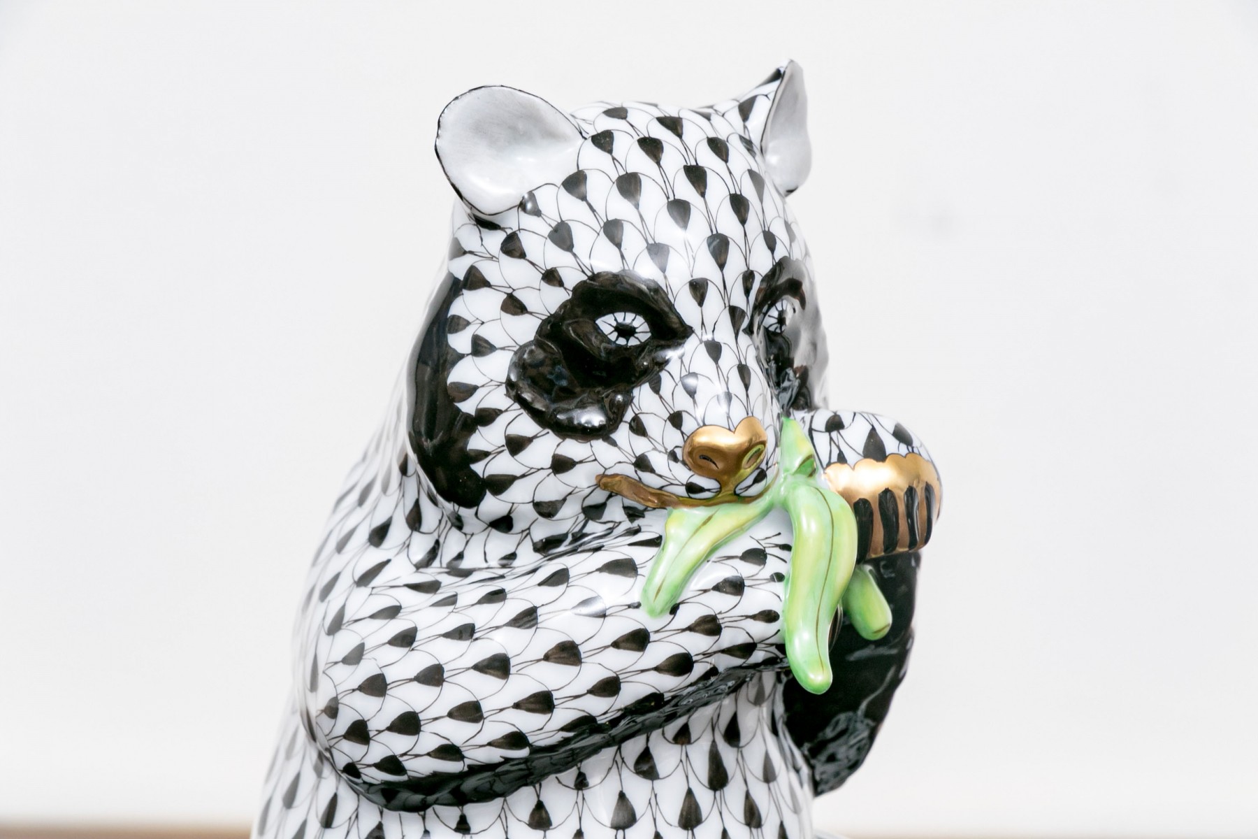 The bear features an elegant black and white classic fishnet motif with black finish around the eyes with delightfully gilt finished nose and paws with a green finished bamboo branch clutched within its paws that the bear can be seen eating in a seated position.