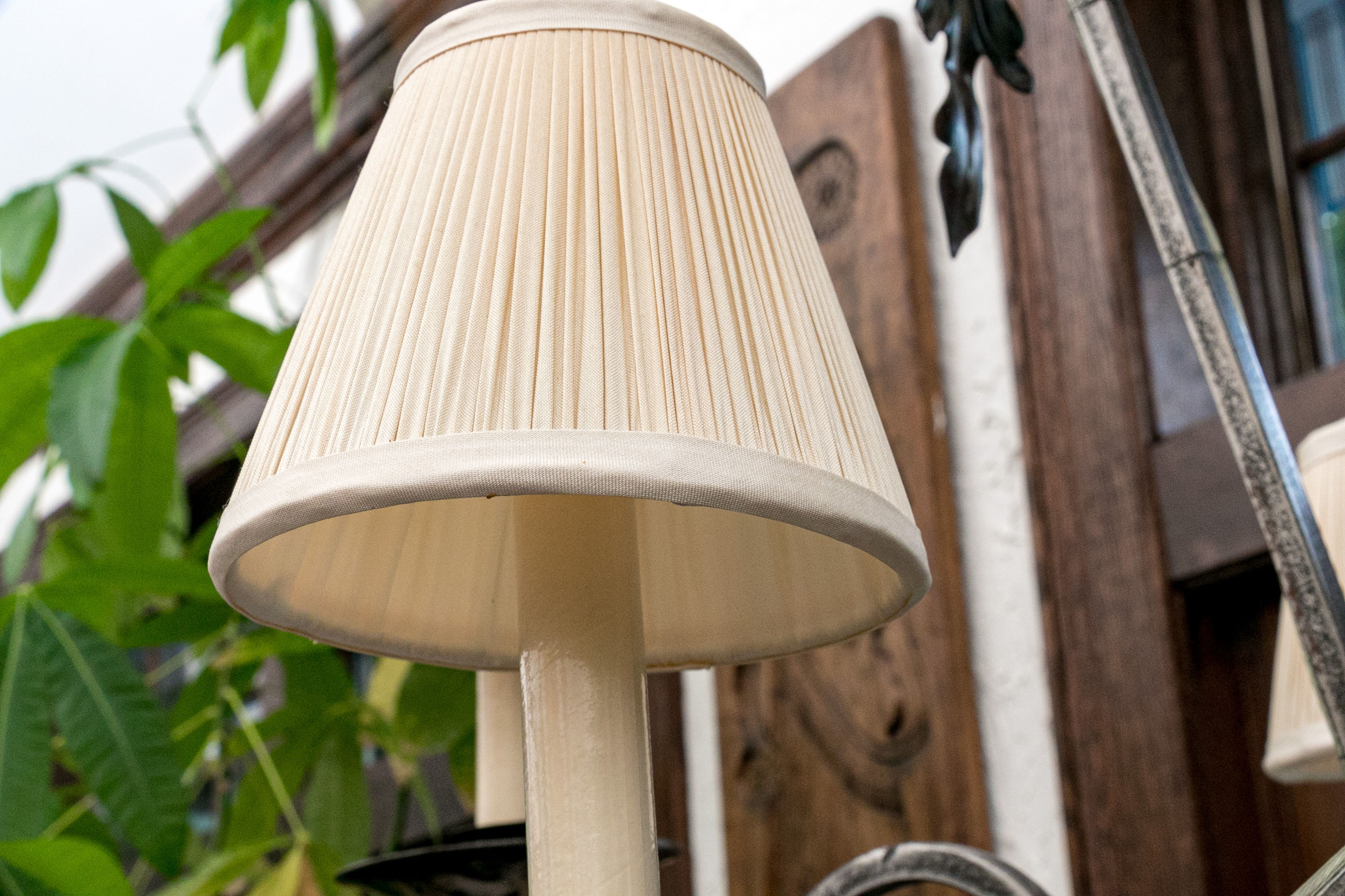 Fabulously decorative with ornate scrolled and feathered motifs. Six candle sleeves with shades. The whole has a ceiling cap with chain link that holds the chandelier. Dimensions: 72 total height from ceiling to bottom of chandelier.