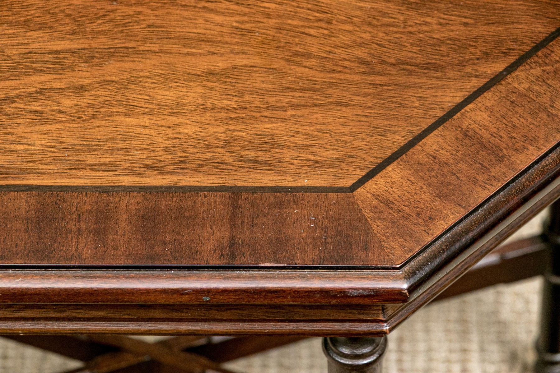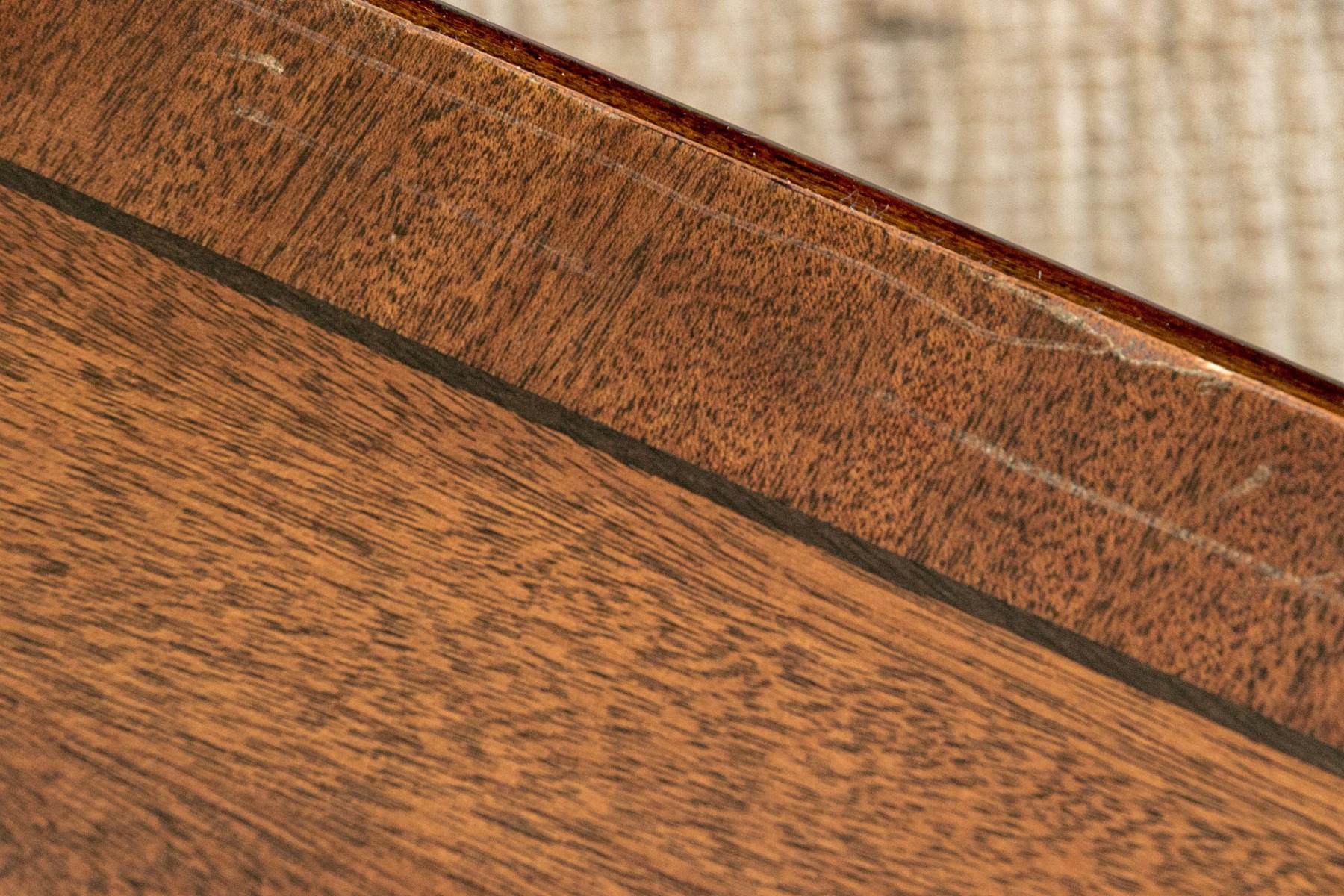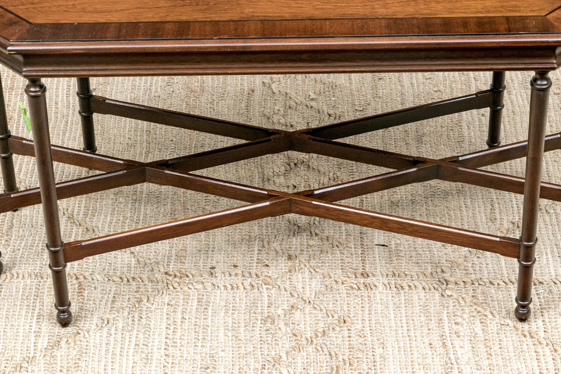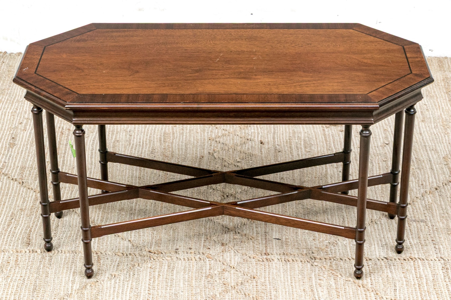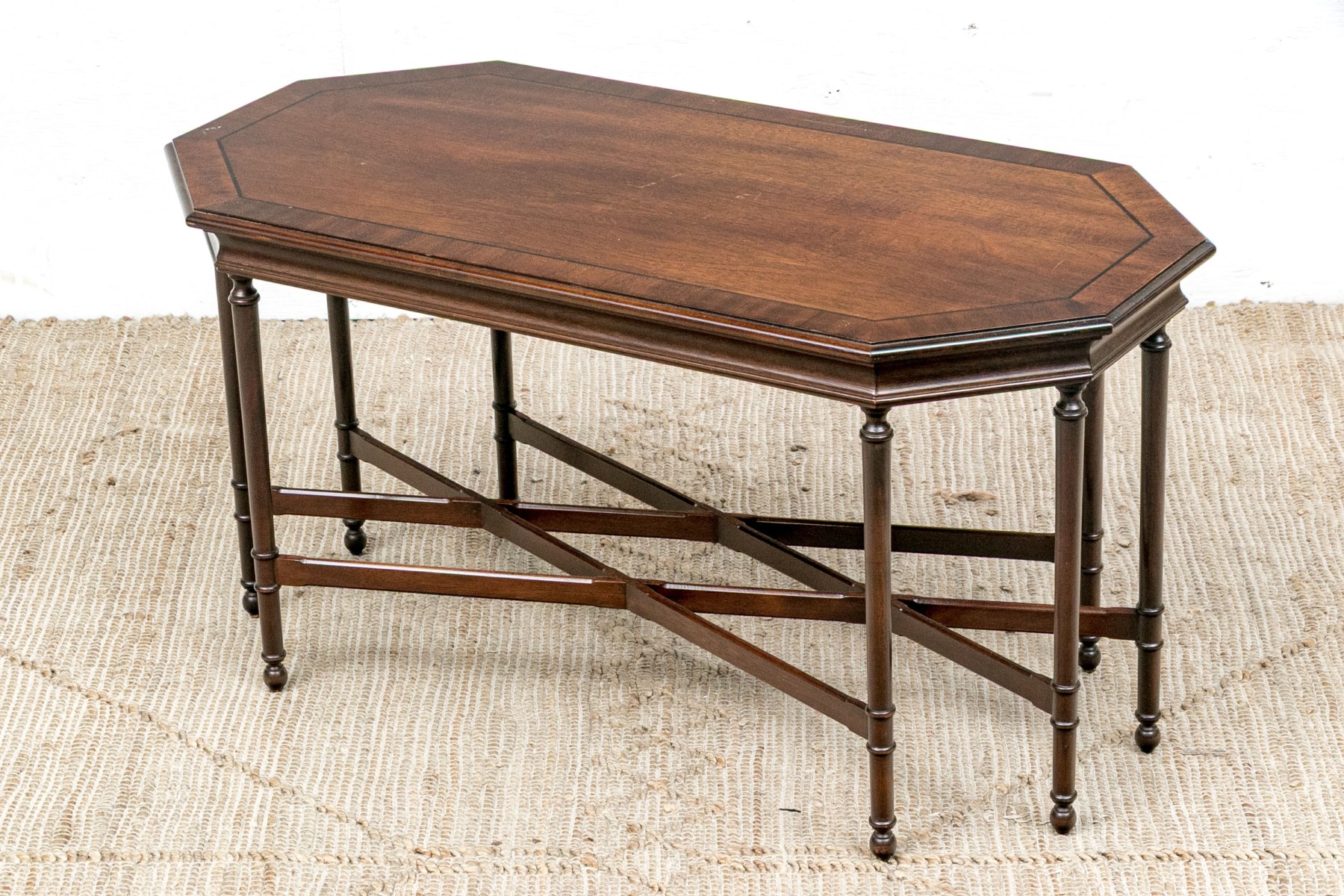 An elegant coffee table featuring a rich mahogany frame accented with satinwood inlay, showcasing fine craftsmanship and timeless design. The rectangular top is bordered with contrasting veneer, resting on tapered legs for a refined silhouette.