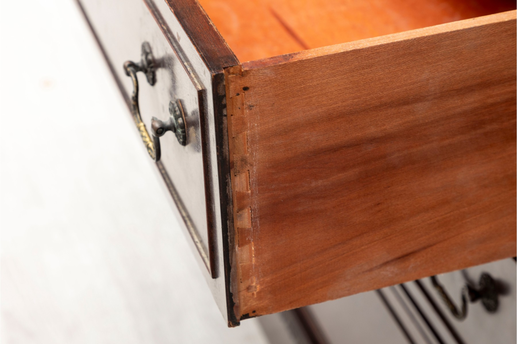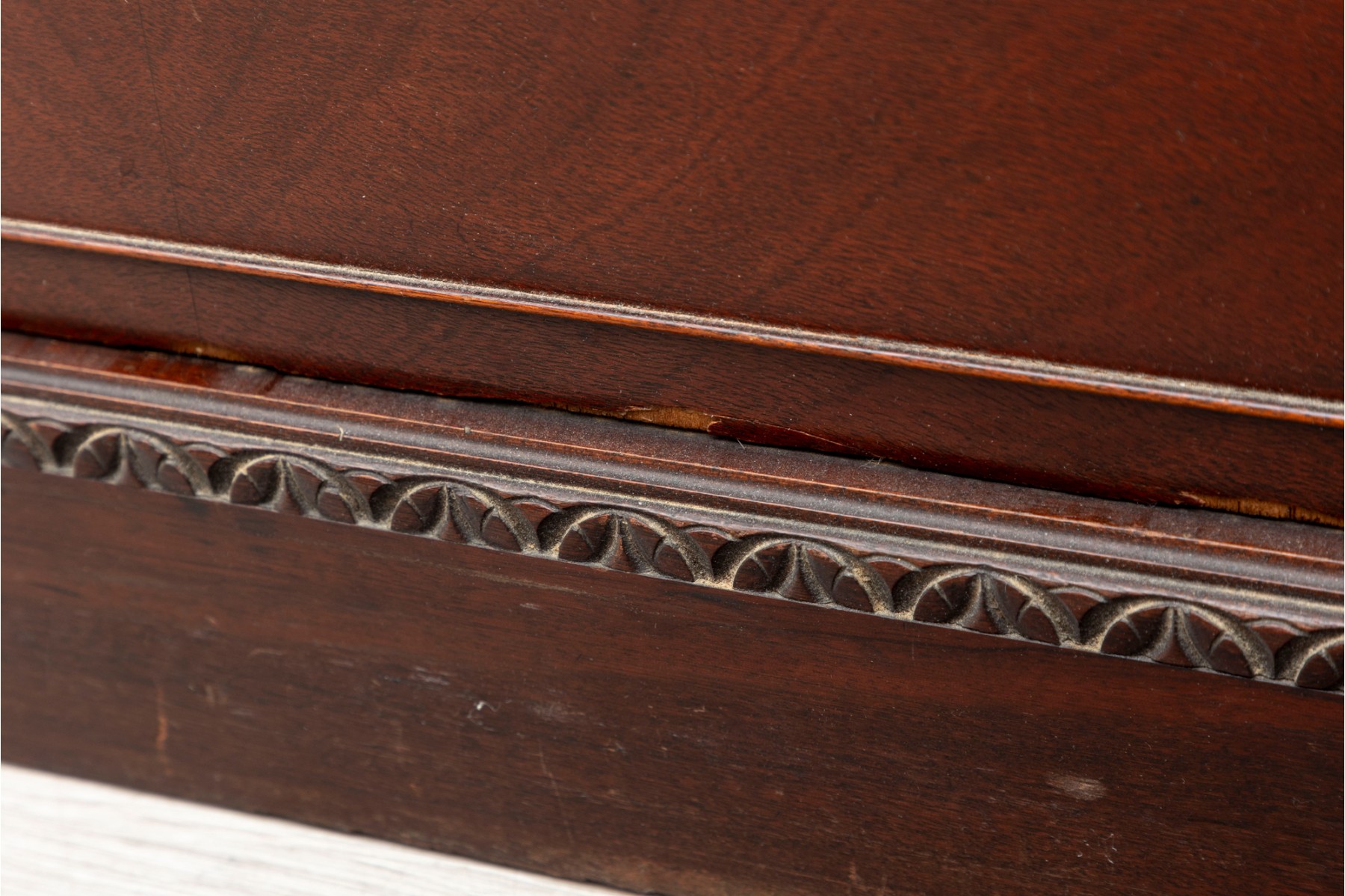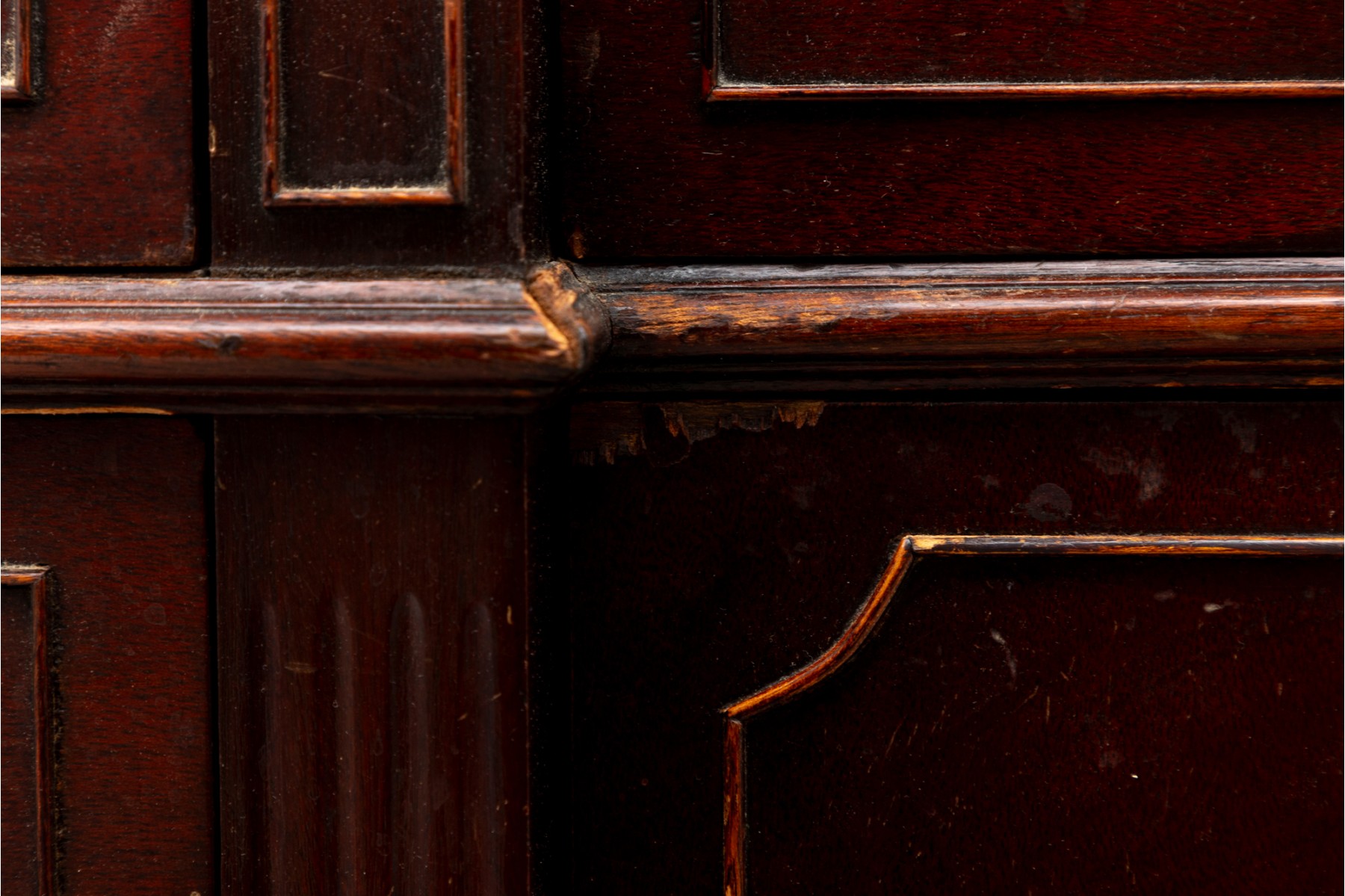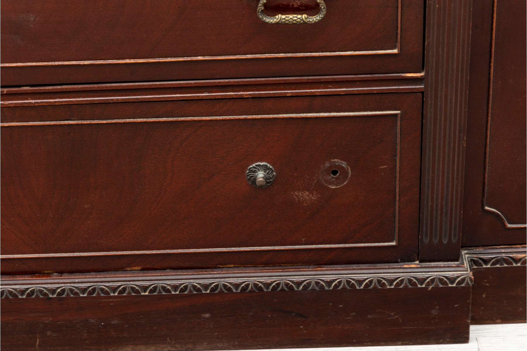 Restoration project. Missing/loose trim to drawers, losses to veneers, scuffs and scratches to surfaces. See photos for details.