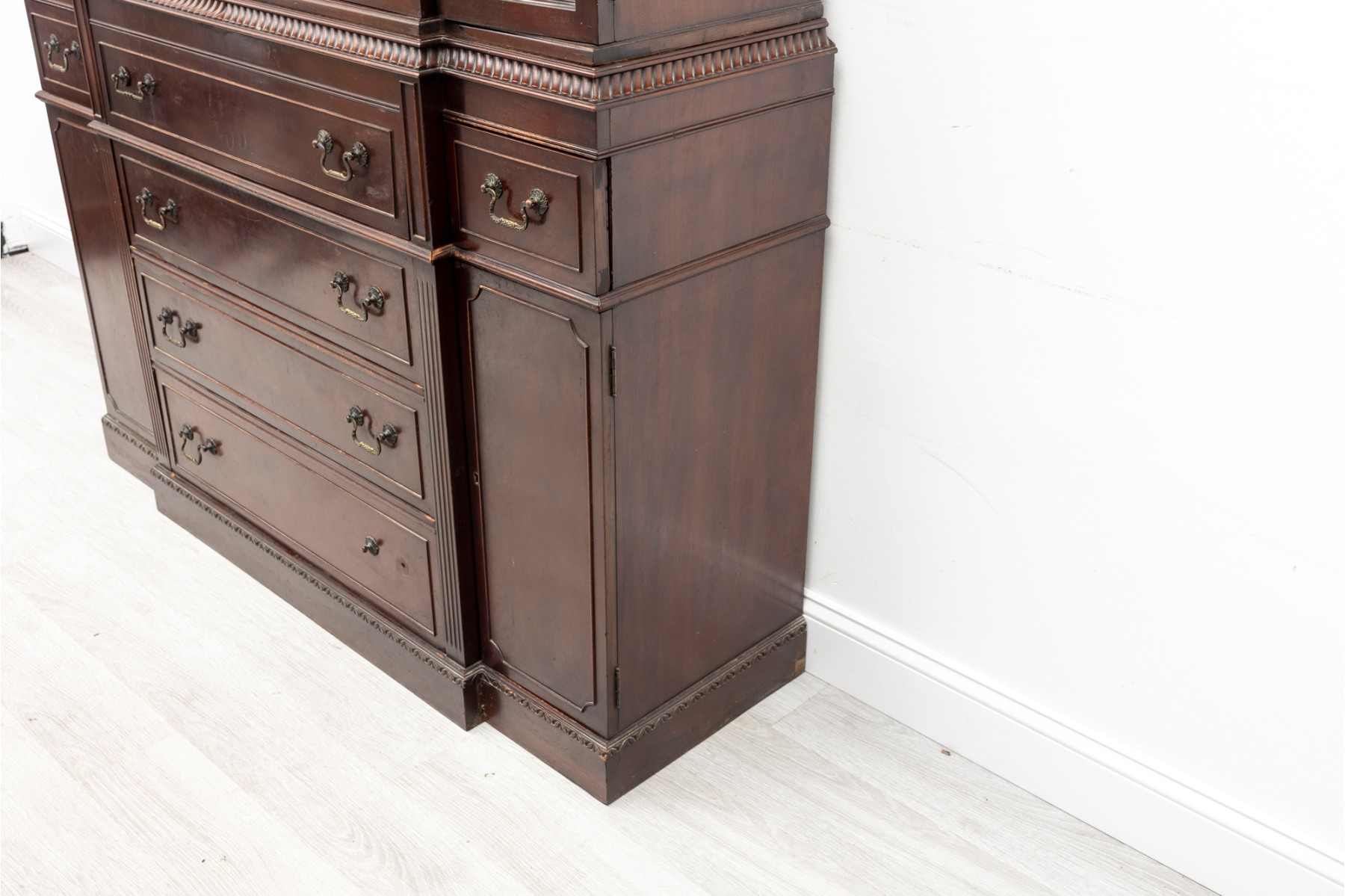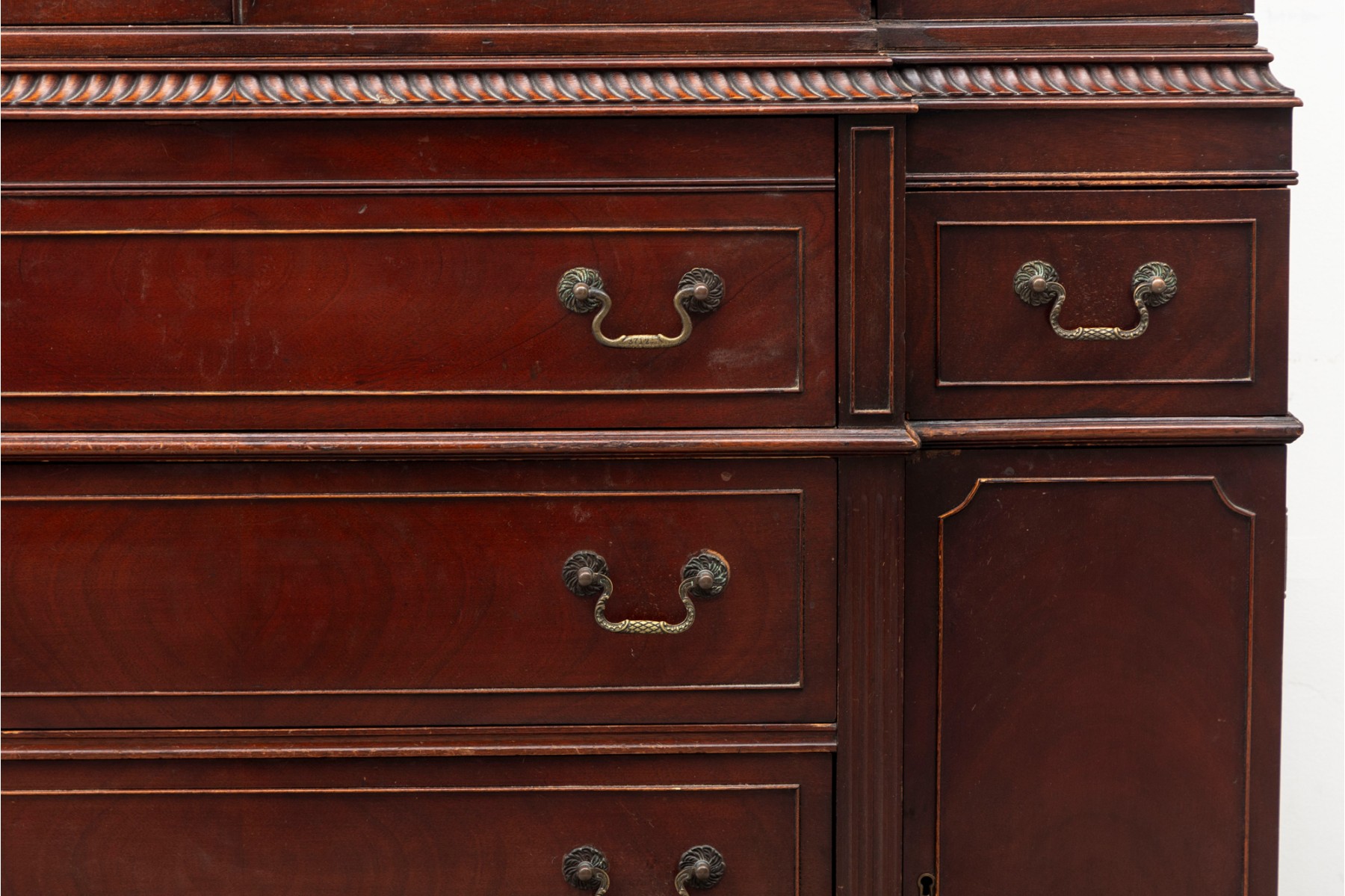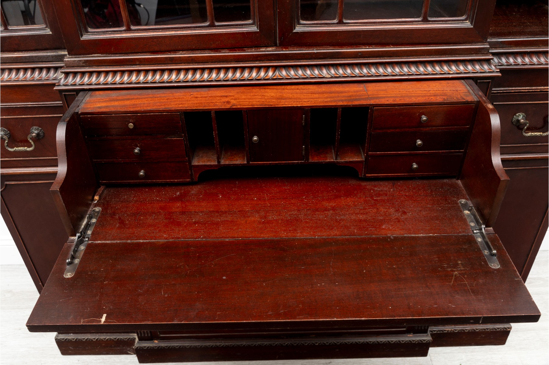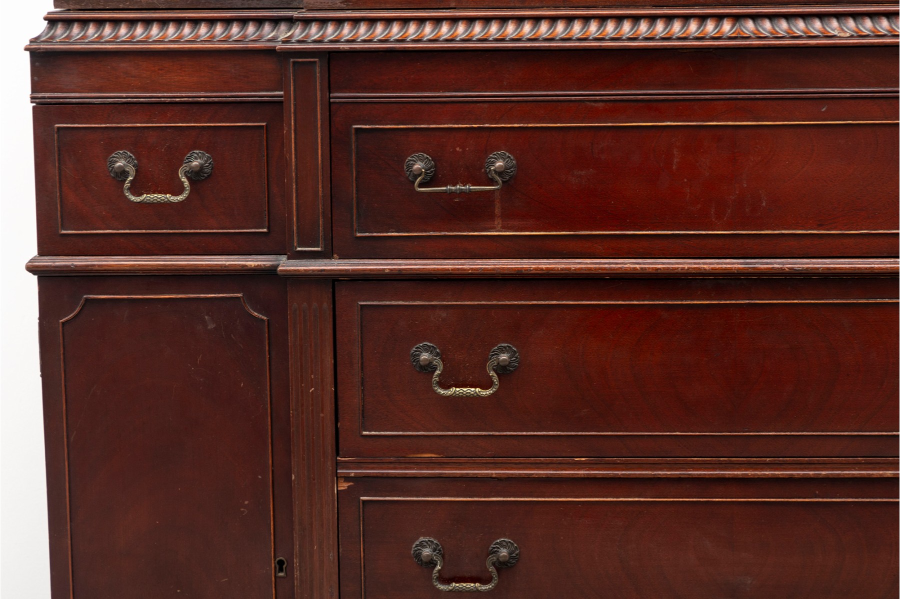 A large two-piece China Cabinet, Georgian inspired with a flip-down secretary desk complete with miniature drawers set above three dovetailed drawers. Two additional drawers flank the sides along with two cabinets. The top hutch portion has four cabinet doors with six removable shelves in total.