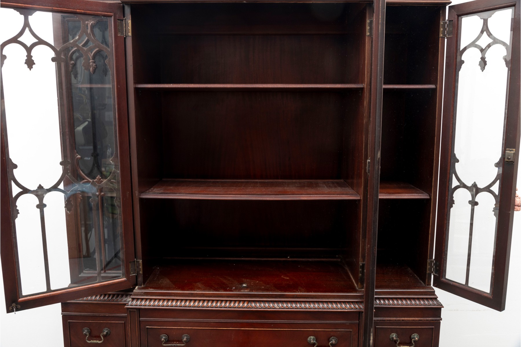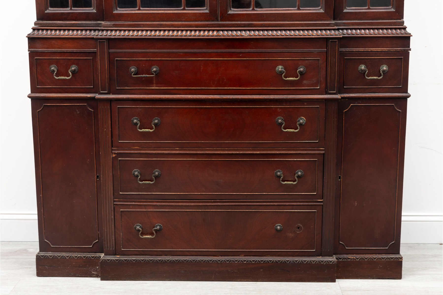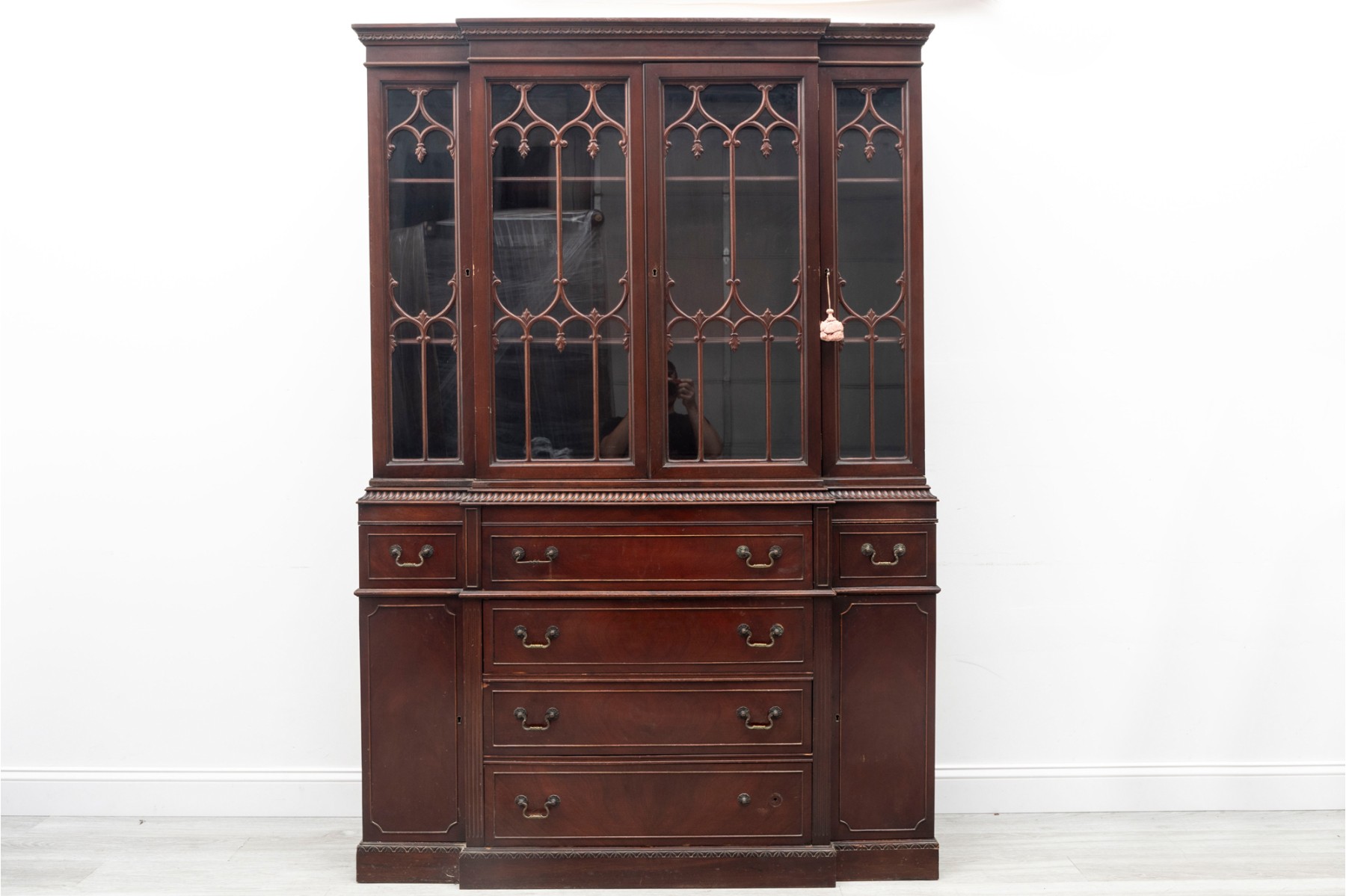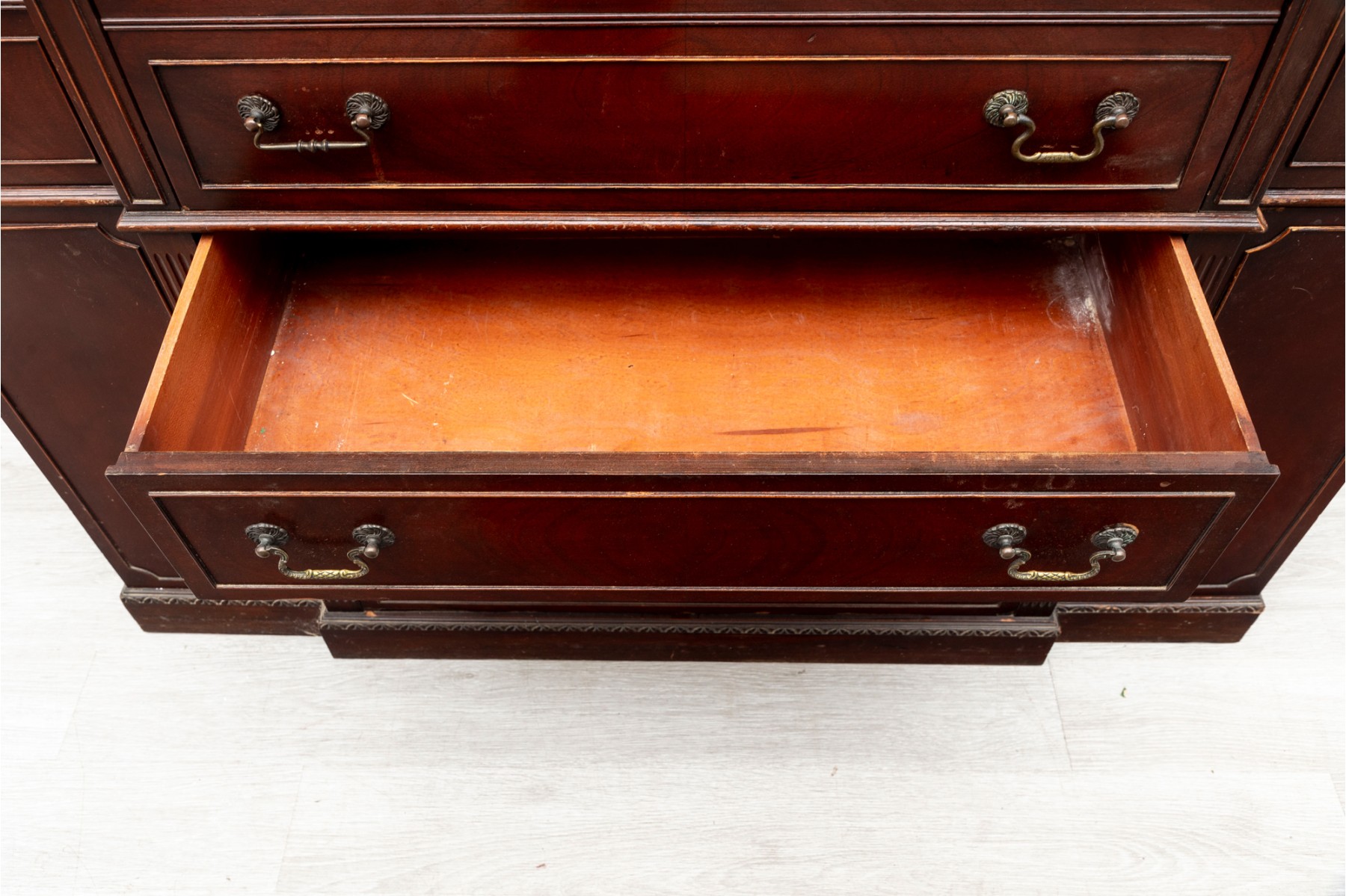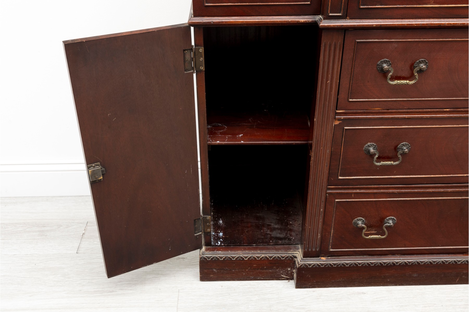 A large two-piece China Cabinet, Georgian inspired with a flip-down secretary desk complete with miniature drawers set above three dovetailed drawers. Two additional drawers flank the sides along with two cabinets. The top hutch portion has four cabinet doors with six removable shelves in total.
