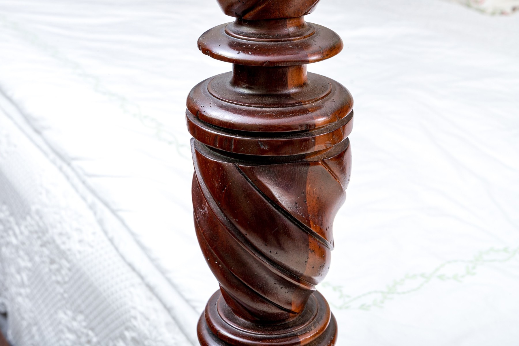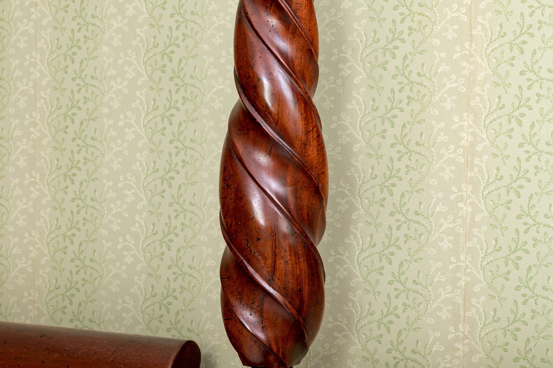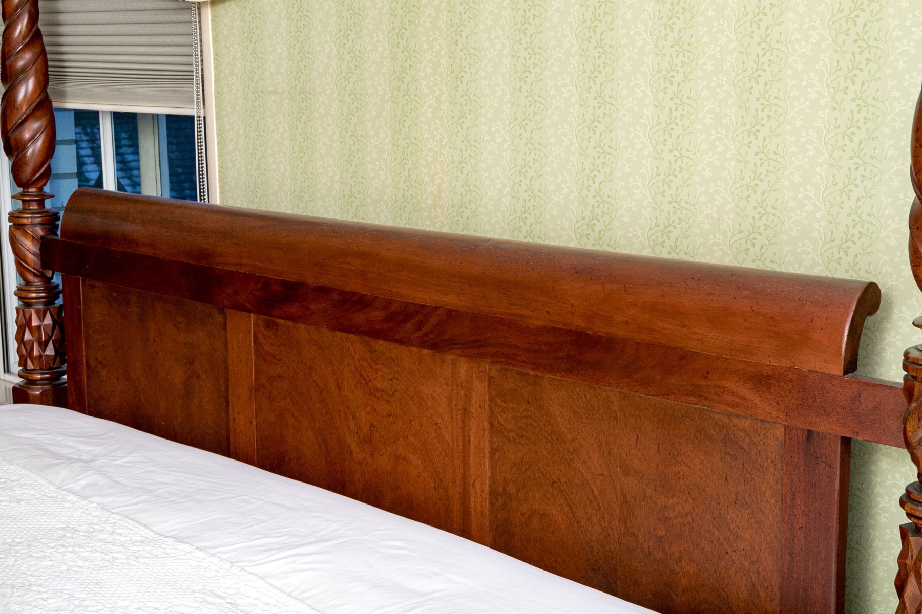 An excellent king size poster bed frame in rich, dark red-brown mahogany, showcasing an elegant Philippe III style headboard with a gently rolled top rail and strong horizontal rail complimenting vertical borders along three beautifully figured panels. Tall, tapered posts lend a traditional plantation aesthetic, handsomely carved with spiraling balusters over urn shaped knops that herald eye-catching cylindrical details with beveled diamond lattice textures. The side rails are simple and sleek in form, raised over stately onion form feet with stylized banded accents.