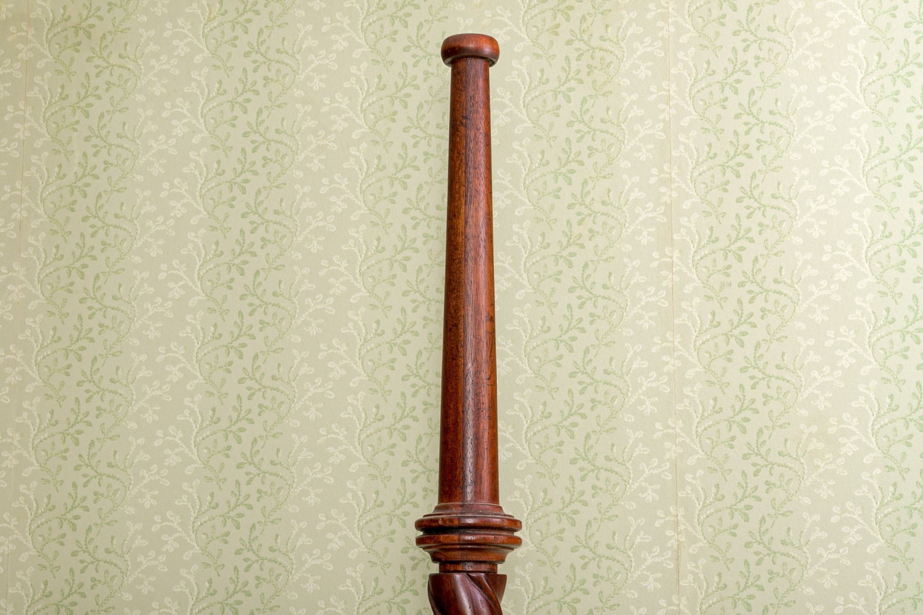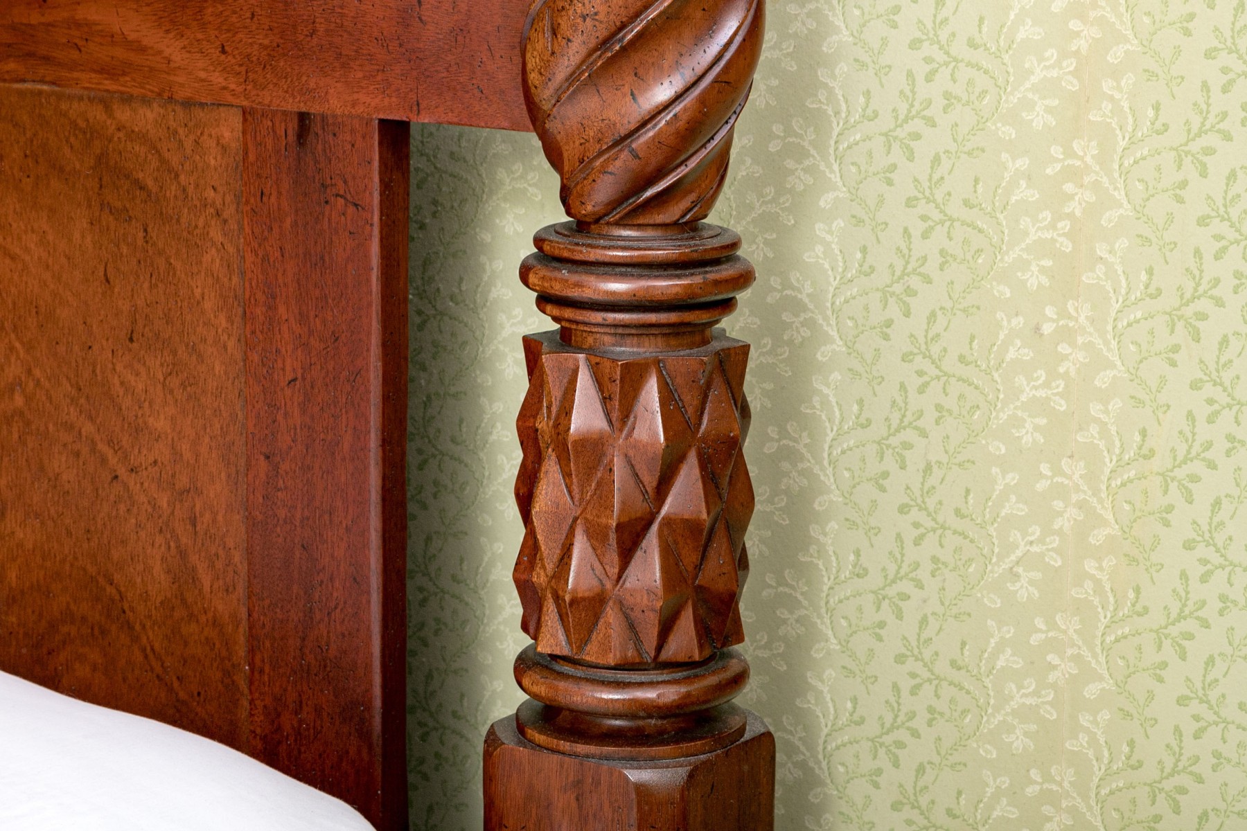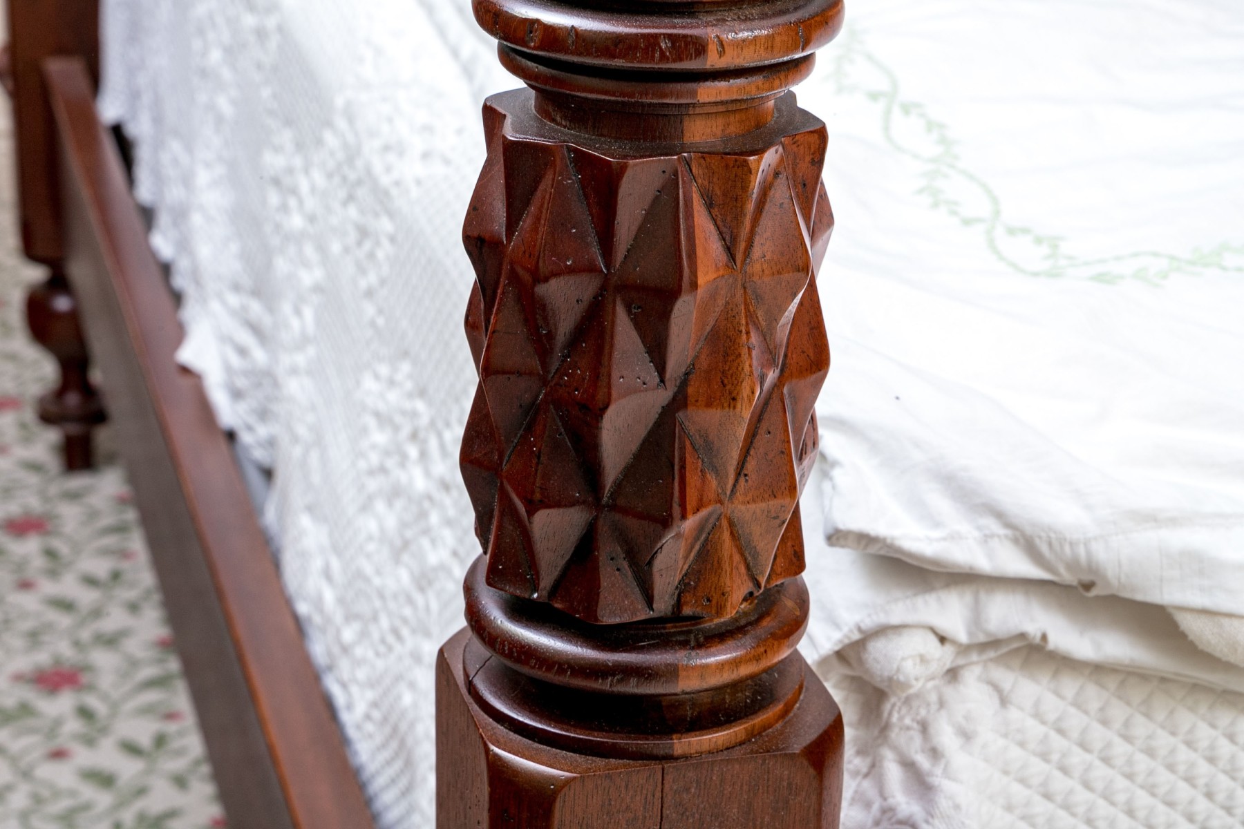 An excellent king size poster bed frame in rich, dark red-brown mahogany, showcasing an elegant Philippe III style headboard with a gently rolled top rail and strong horizontal rail complimenting vertical borders along three beautifully figured panels. Tall, tapered posts lend a traditional plantation aesthetic, handsomely carved with spiraling balusters over urn shaped knops that herald eye-catching cylindrical details with beveled diamond lattice textures. The side rails are simple and sleek in form, raised over stately onion form feet with stylized banded accents.