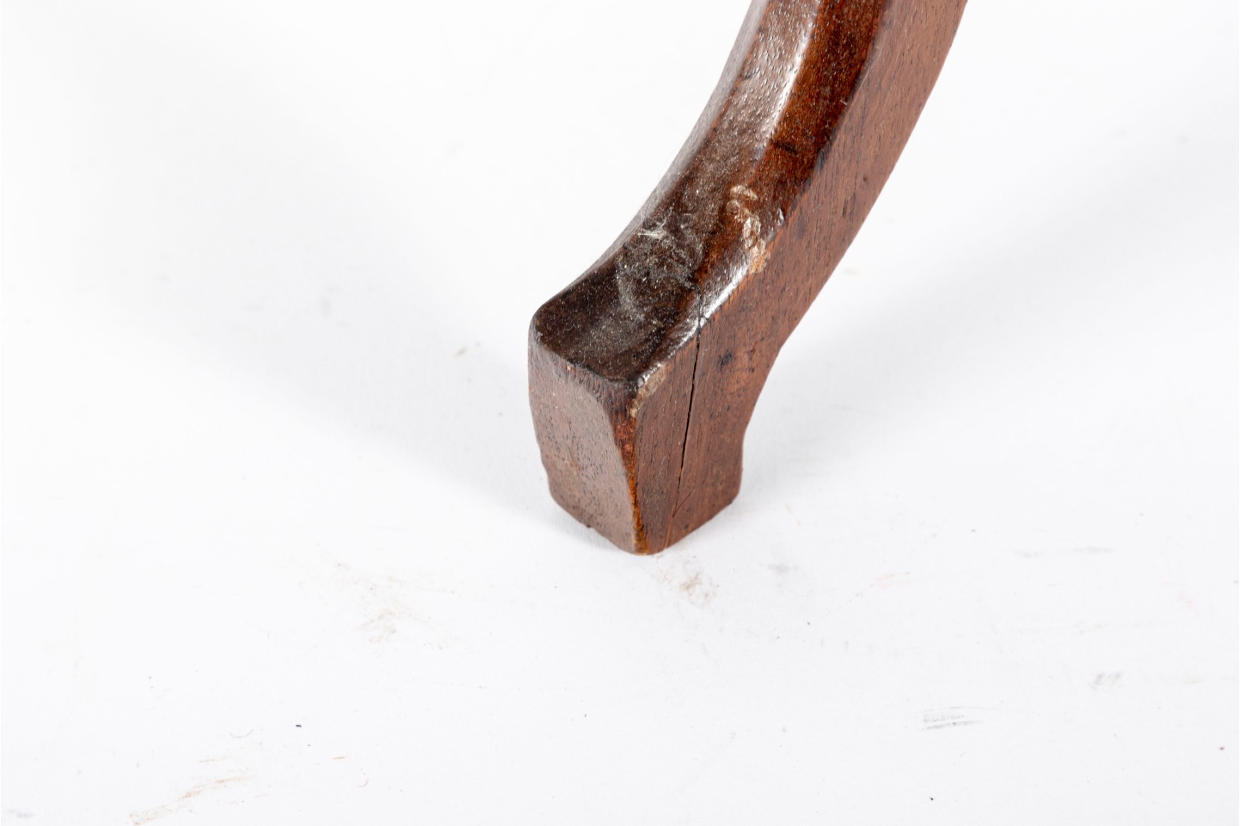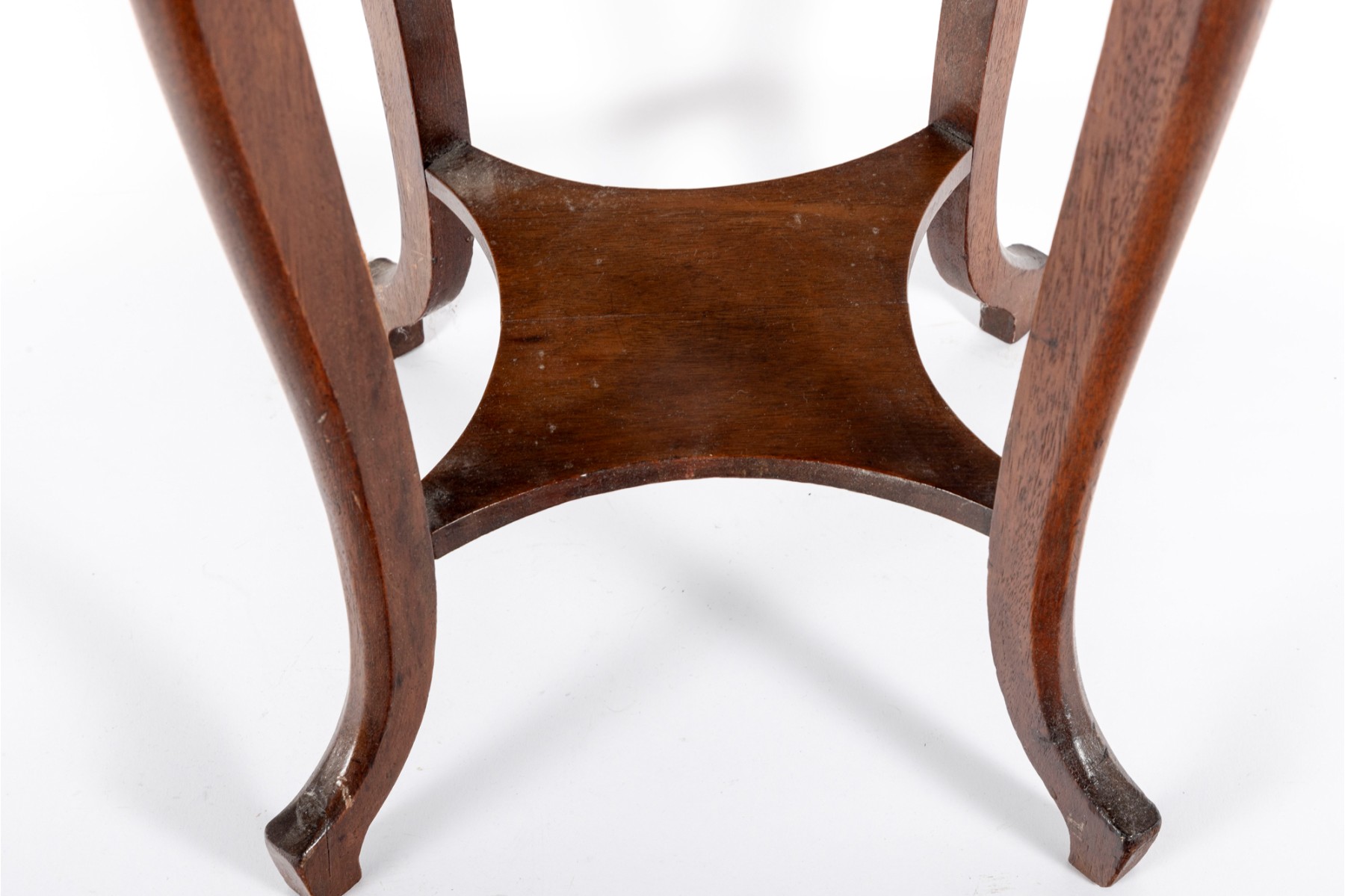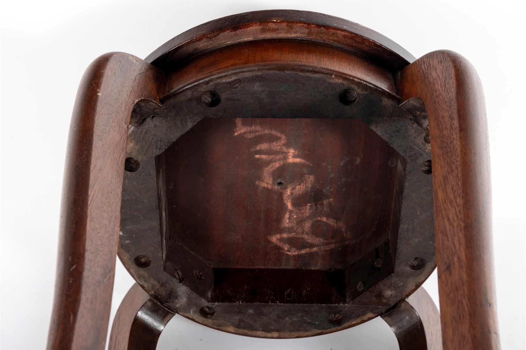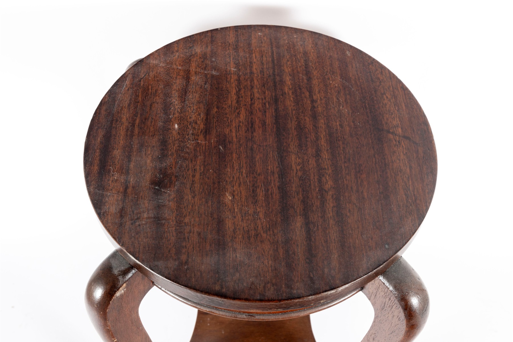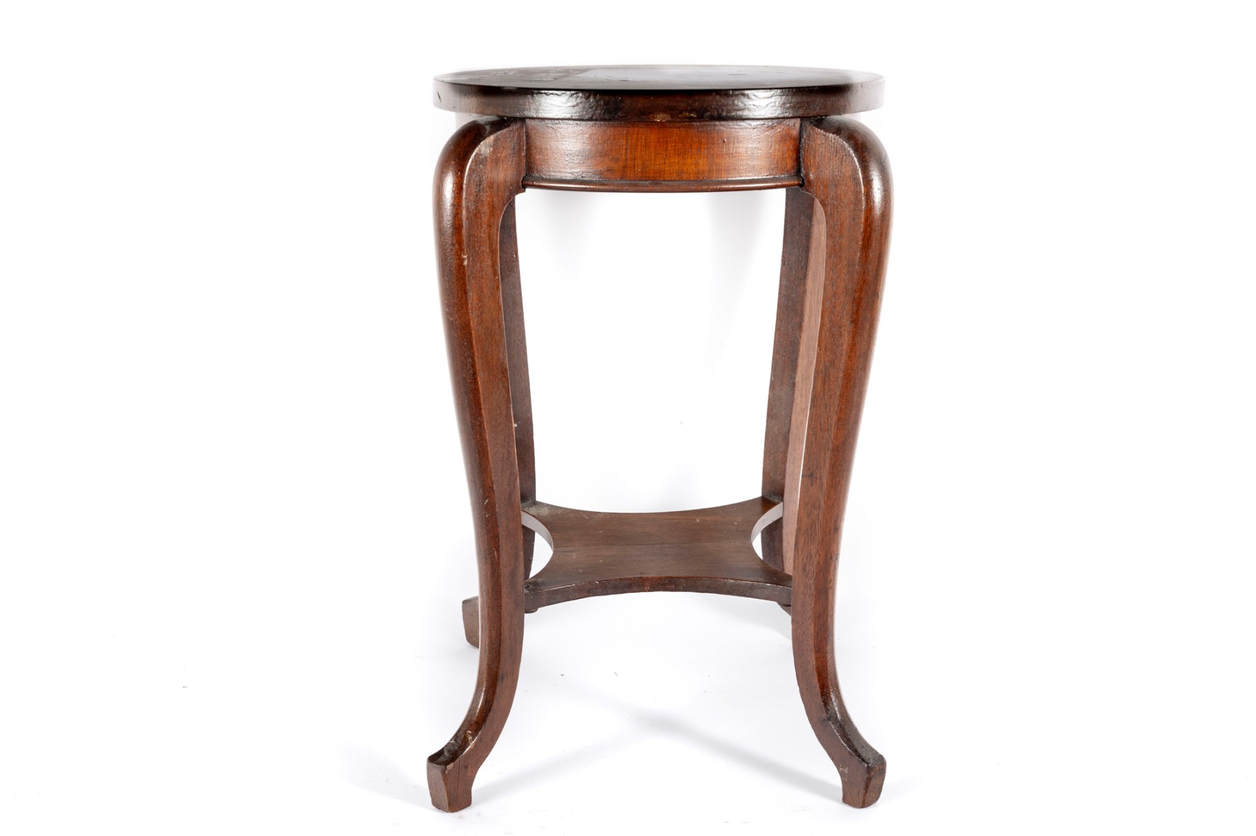A vintage plant stand or round accent table crafted from mahogany. Features winding French style legs interlinked by a small bottom shelf doubling as a support stretcher.