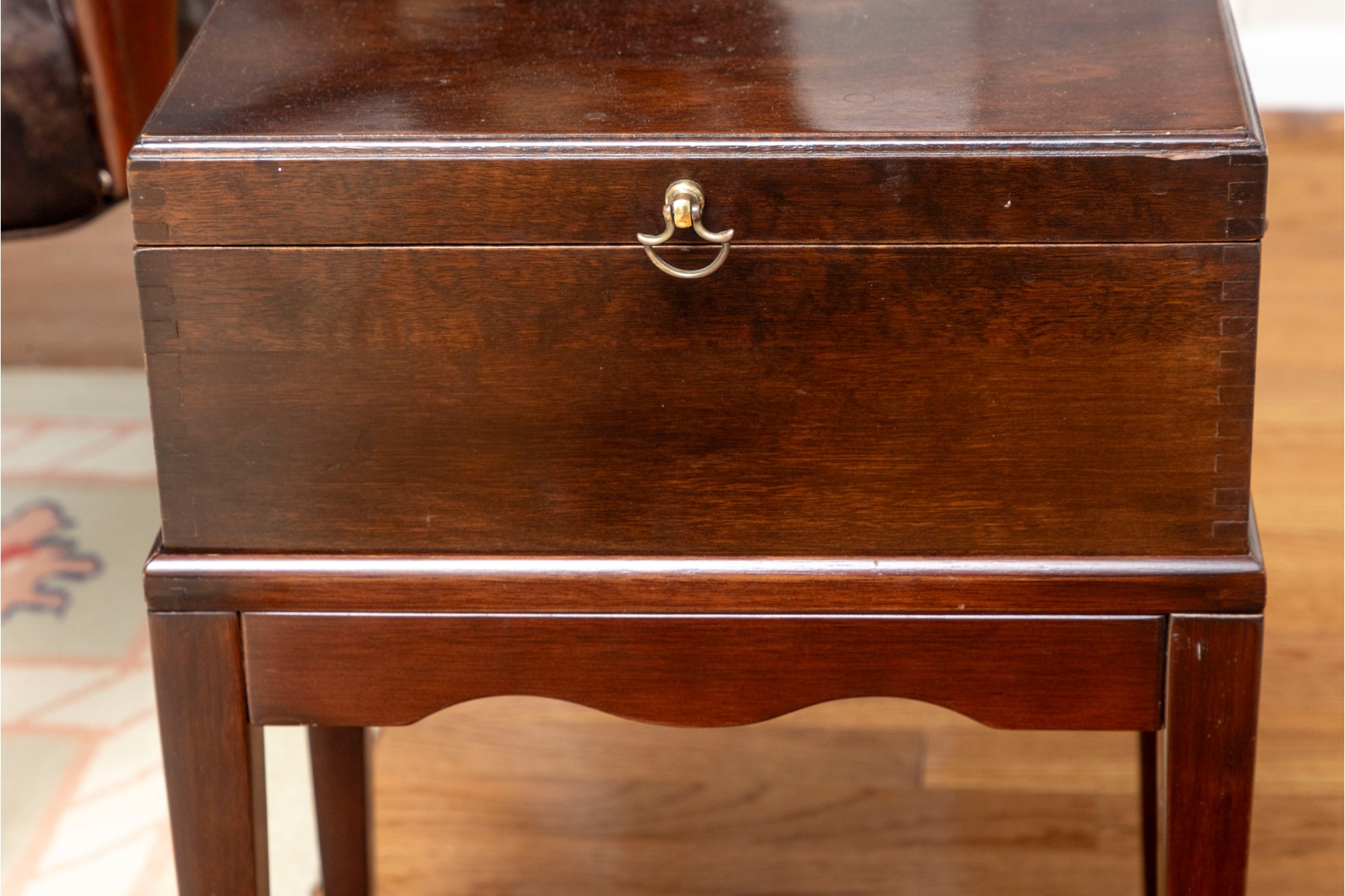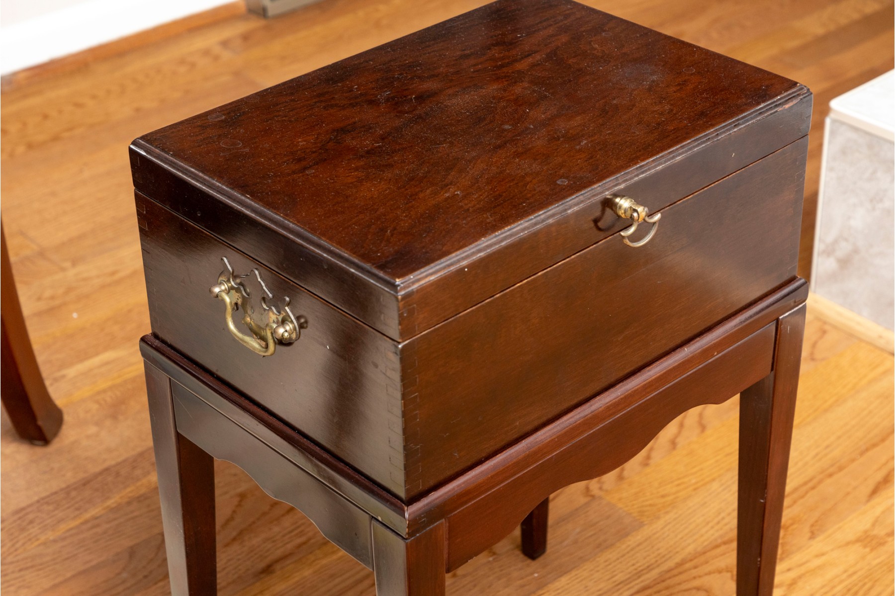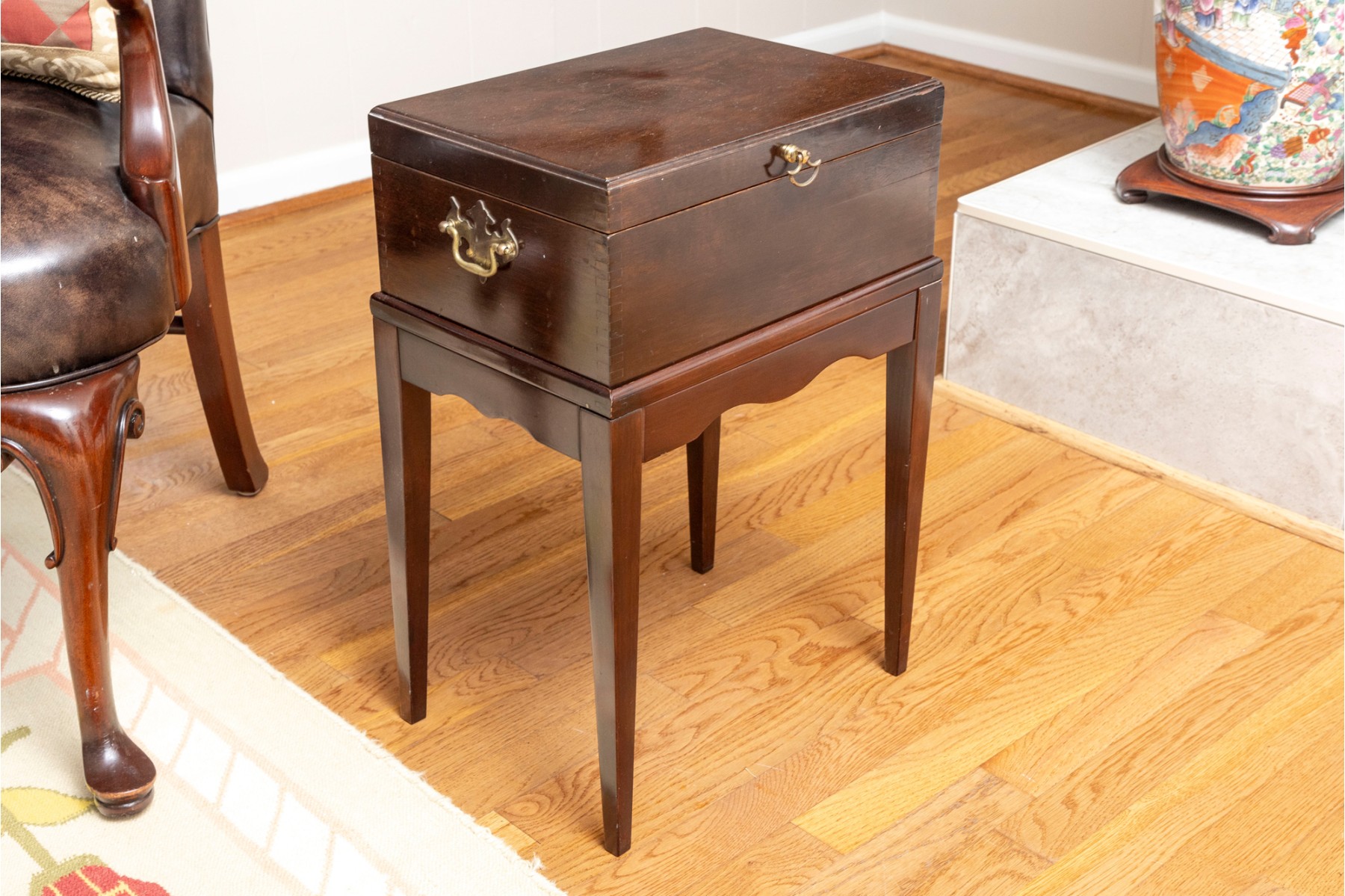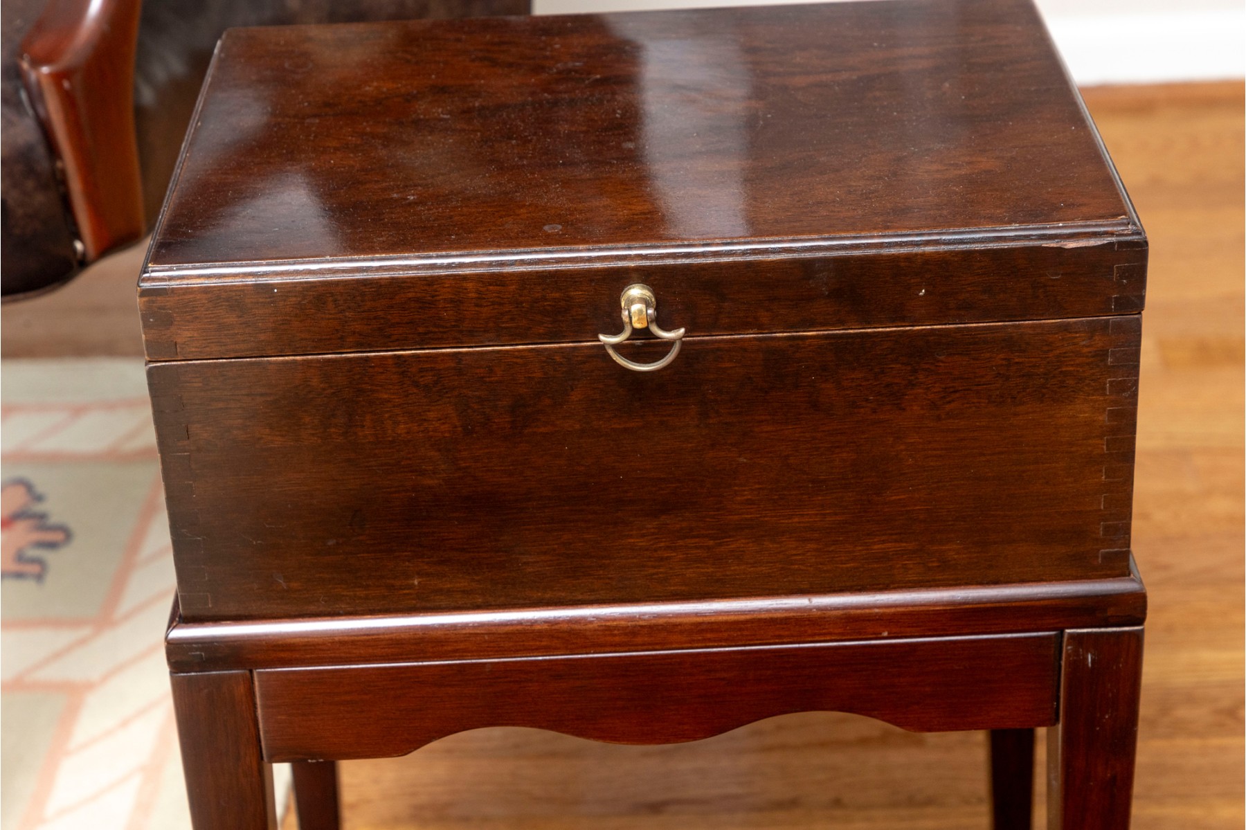 A wonderful Regency style cellarette or humidor in medium-dark brown mahogany. Features a rectangular box with a hinged lid and brass handles about the sides, set atop a simple stand with a serpentine apron.