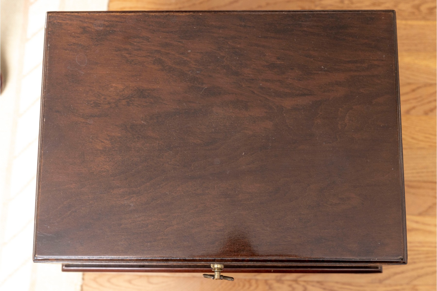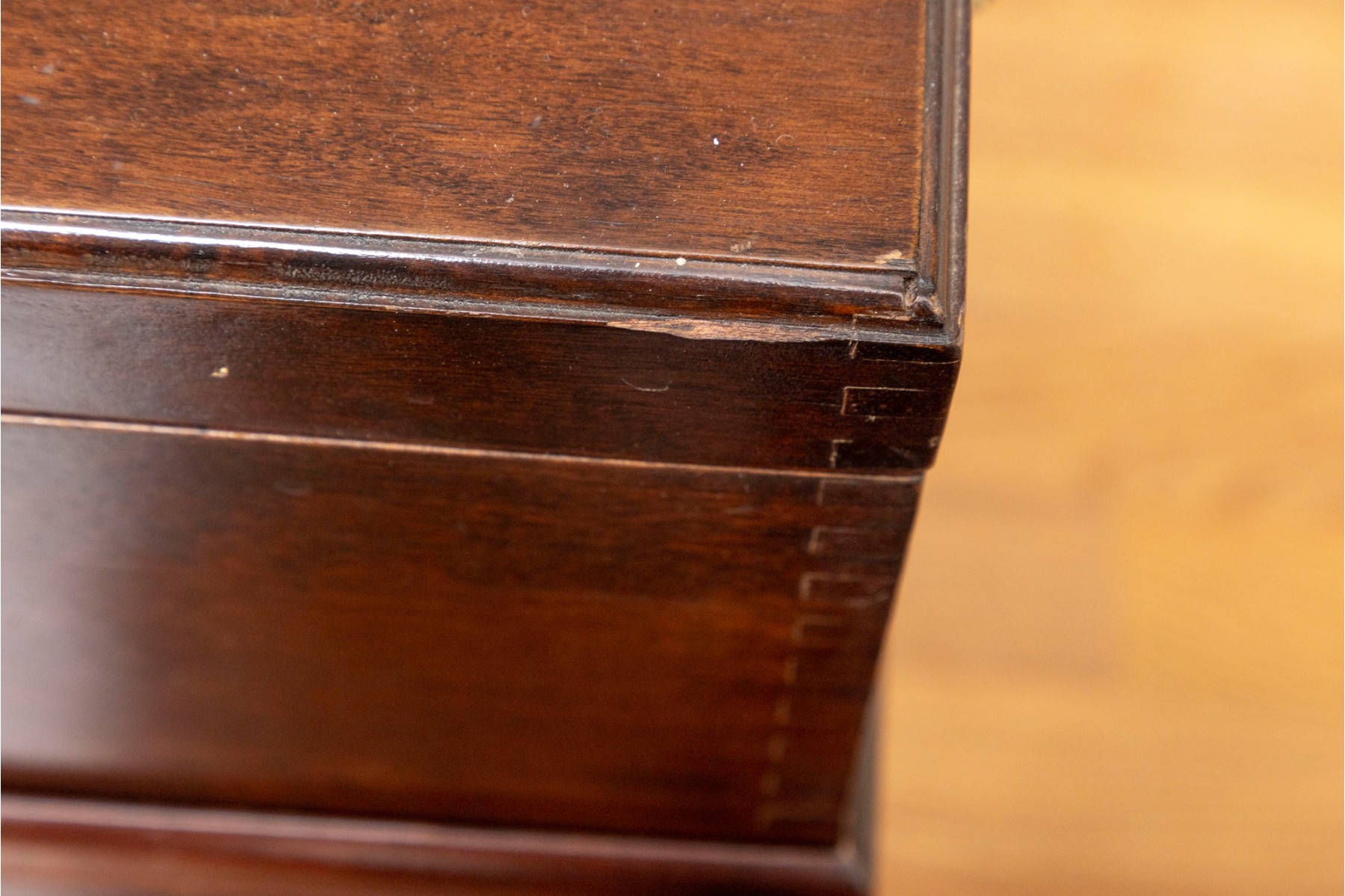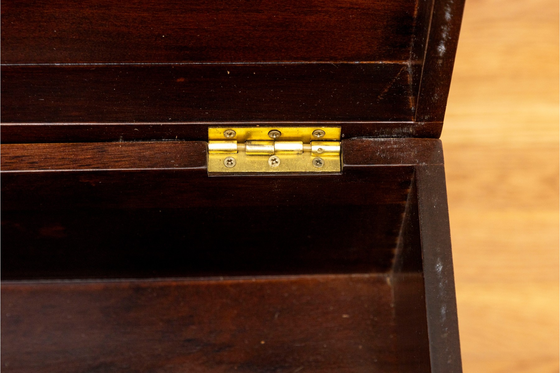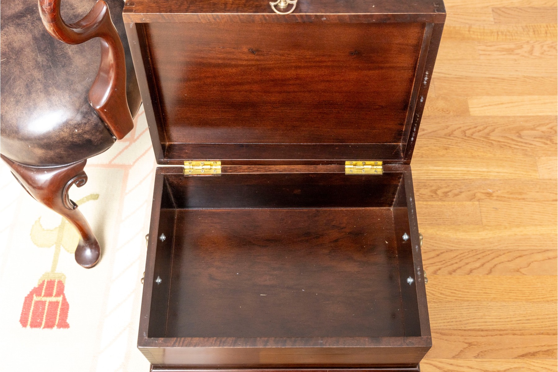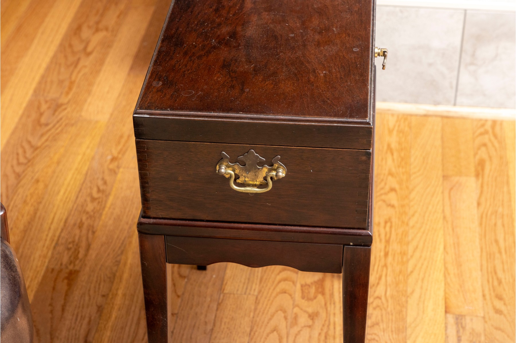 A wonderful Regency style cellarette or humidor in medium-dark brown mahogany. Features a rectangular box with a hinged lid and brass handles about the sides, set atop a simple stand with a serpentine apron.