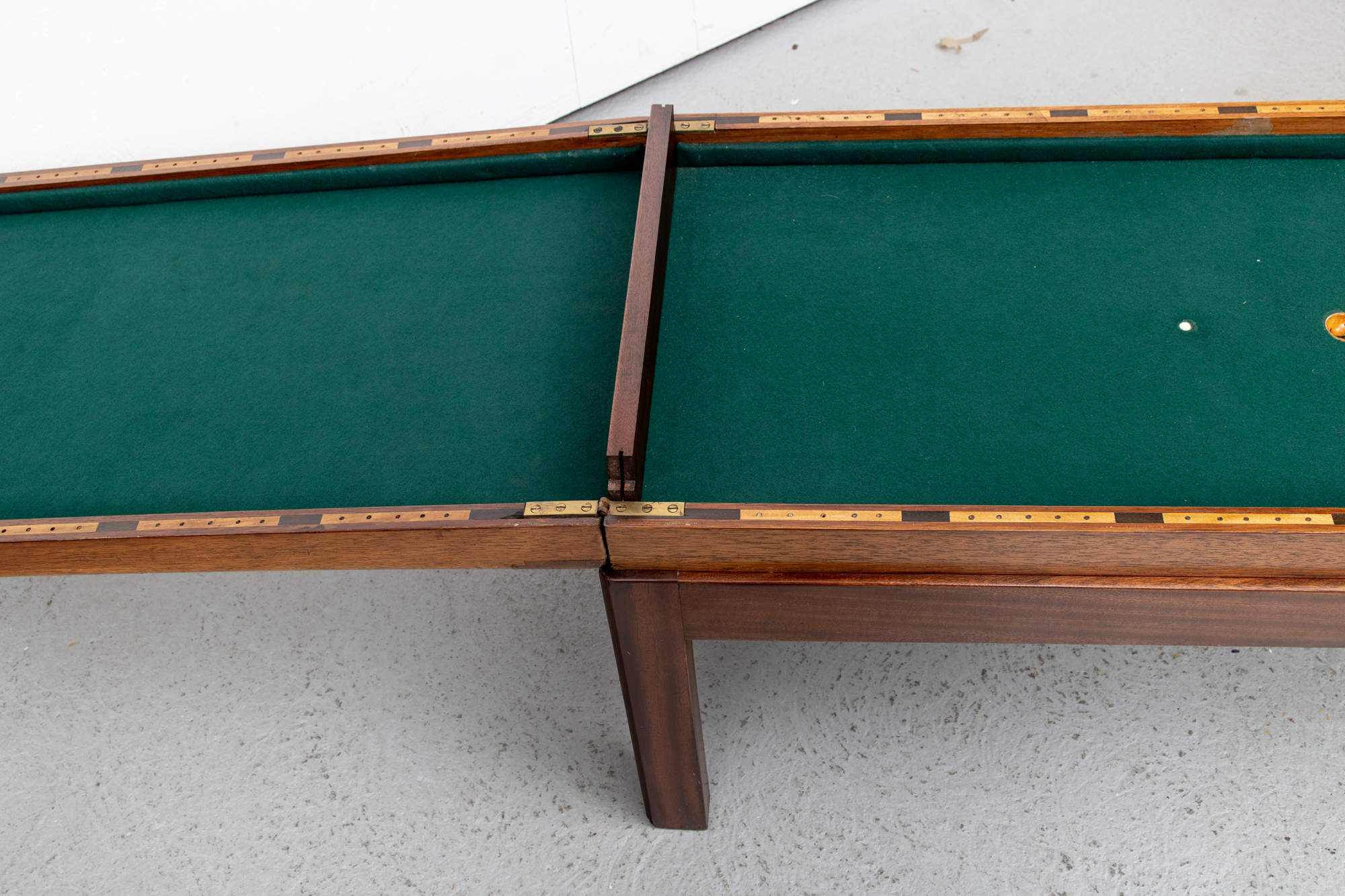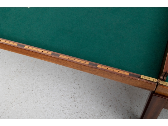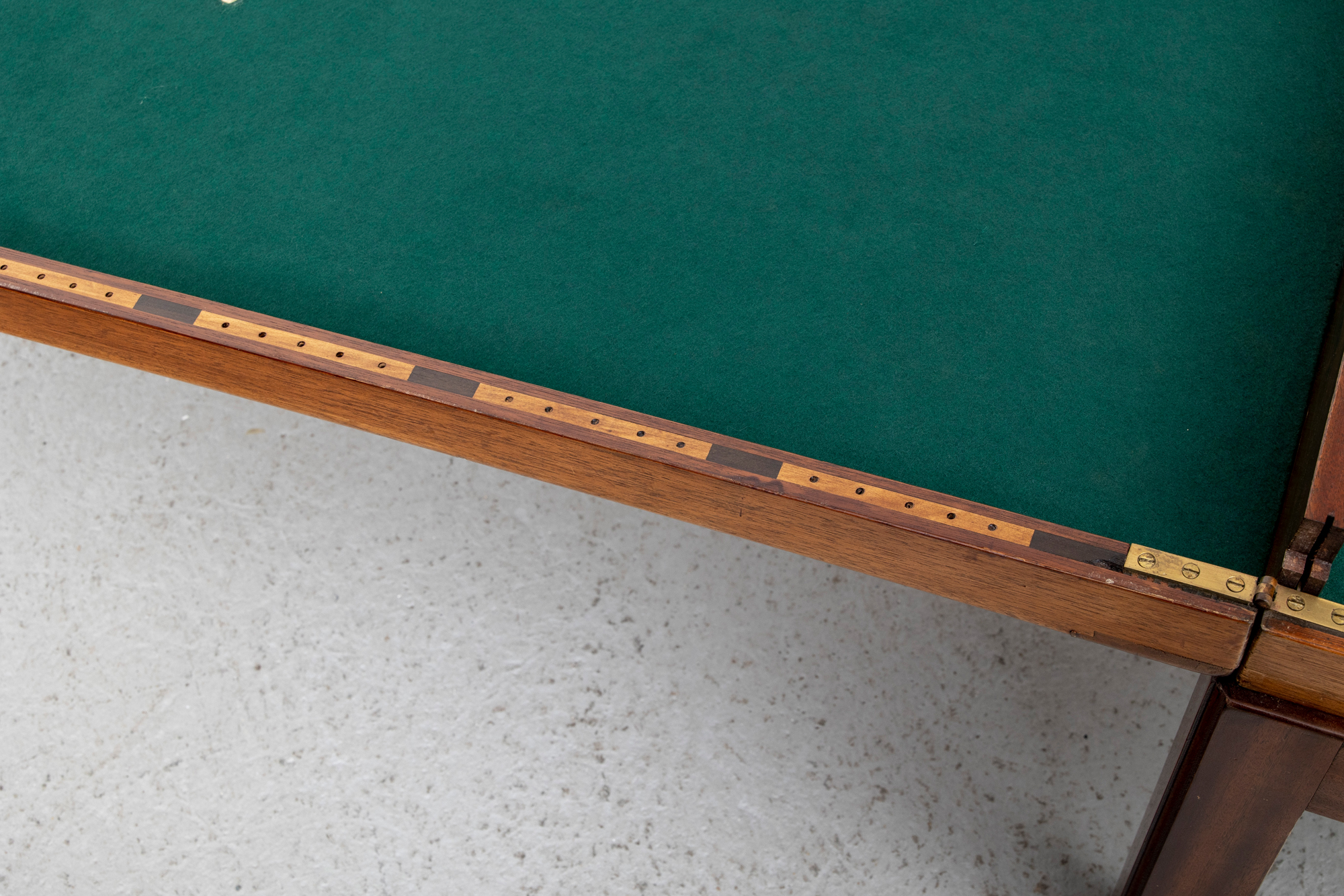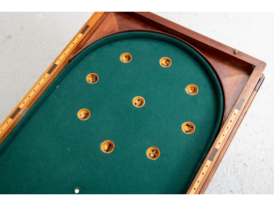 With a hinged top and brass hooks and eyes. The interior lined in green felt with wood numbered depressions. Lacking gaming pieces. On a separate stand with carved legs.