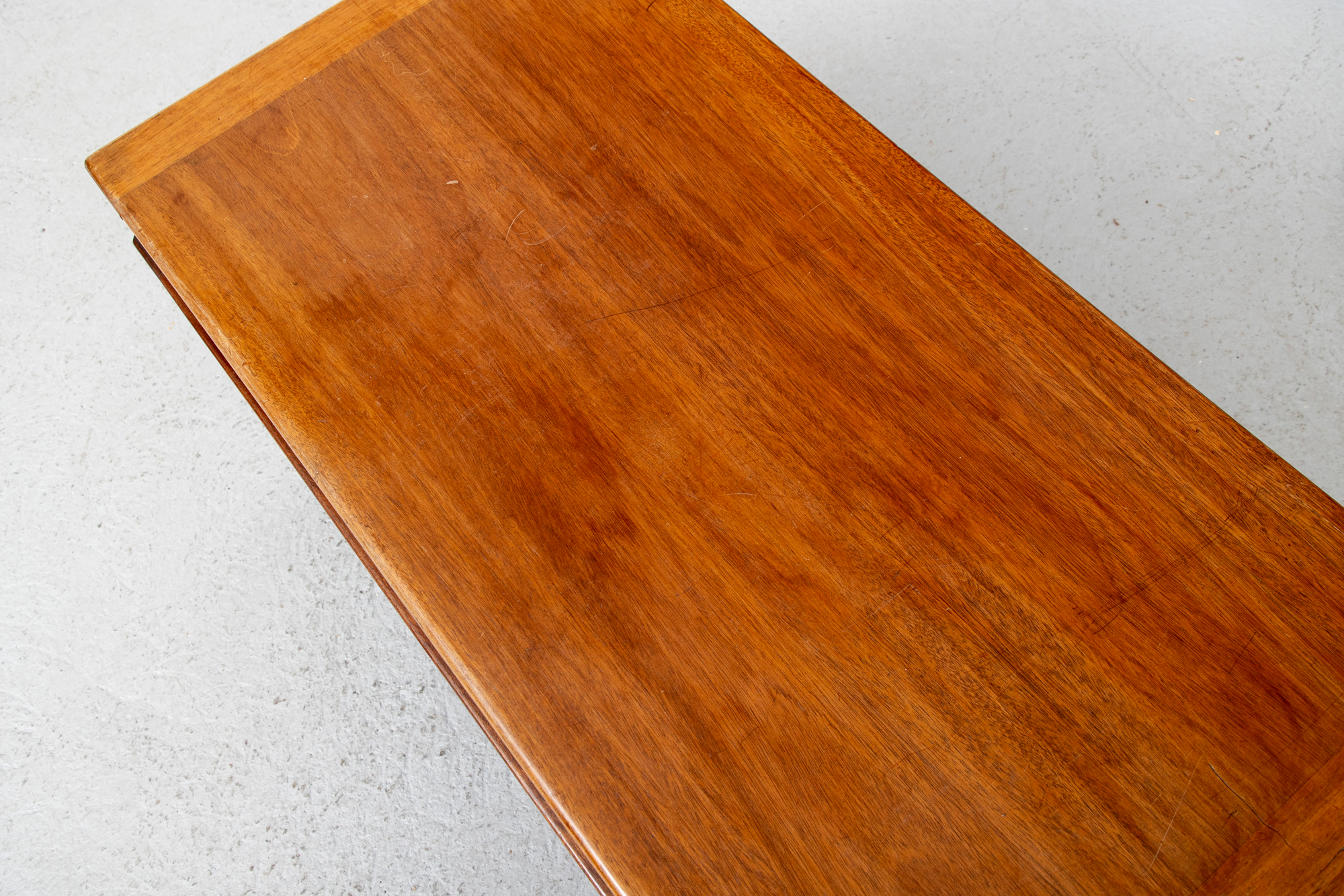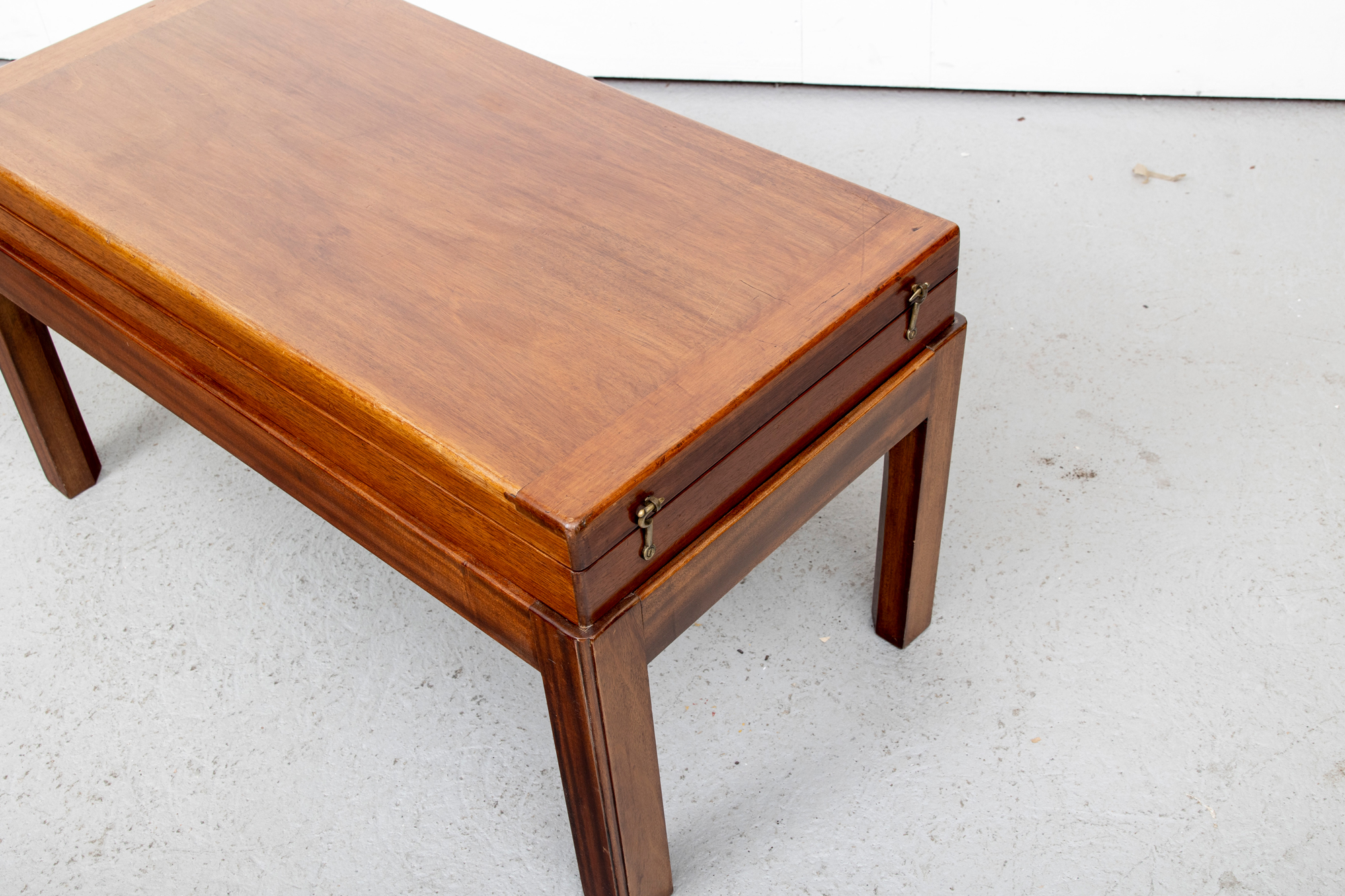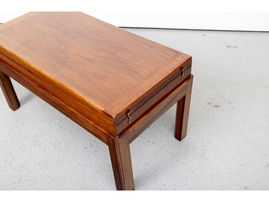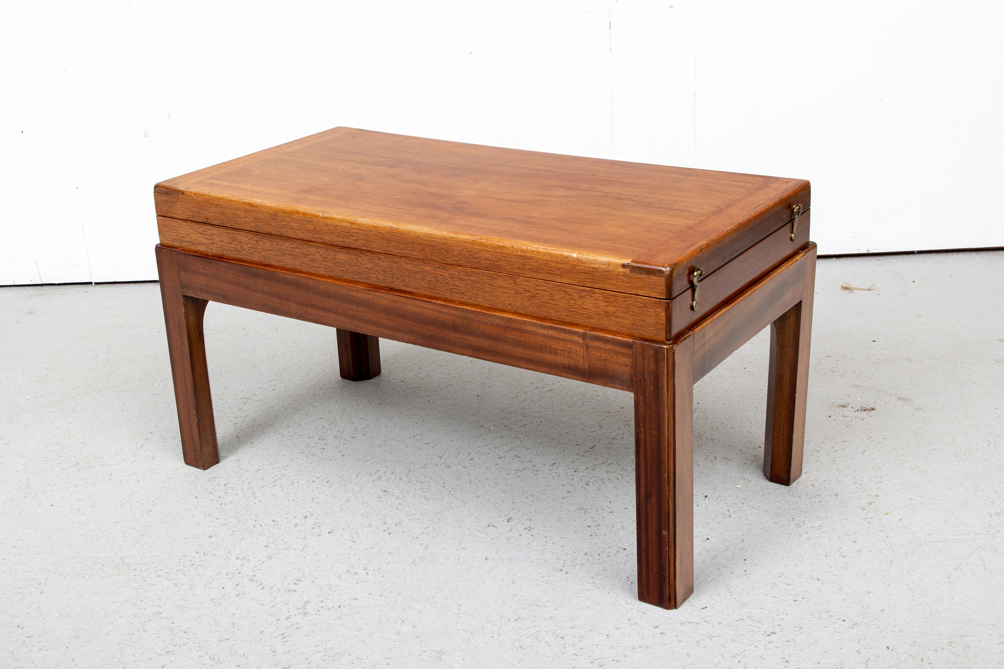 With a hinged top and brass hooks and eyes. The interior lined in green felt with wood numbered depressions. Lacking gaming pieces. On a separate stand with carved legs.