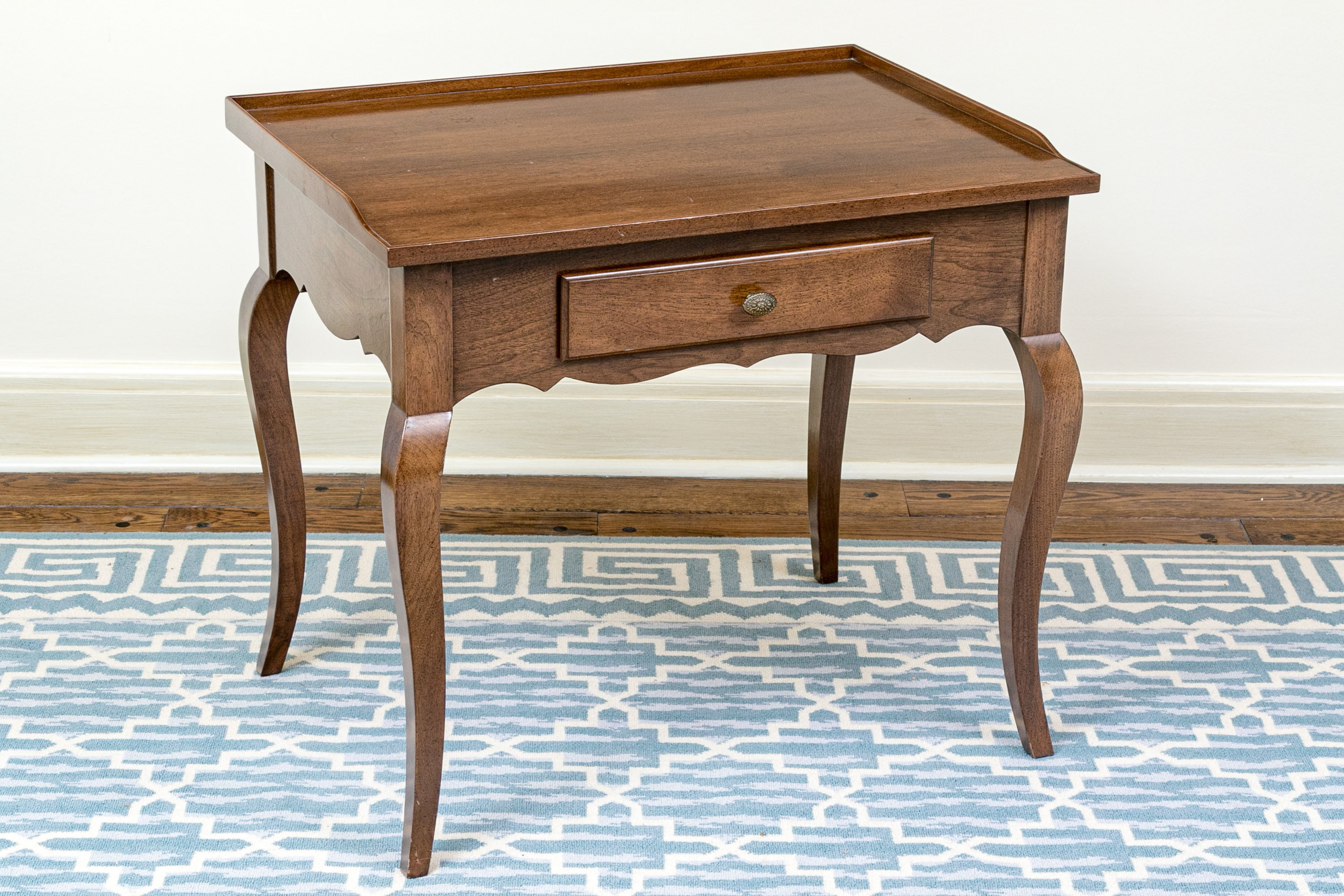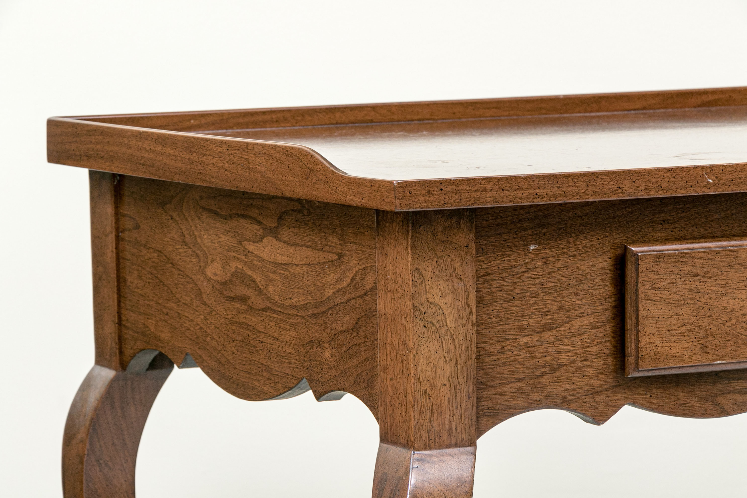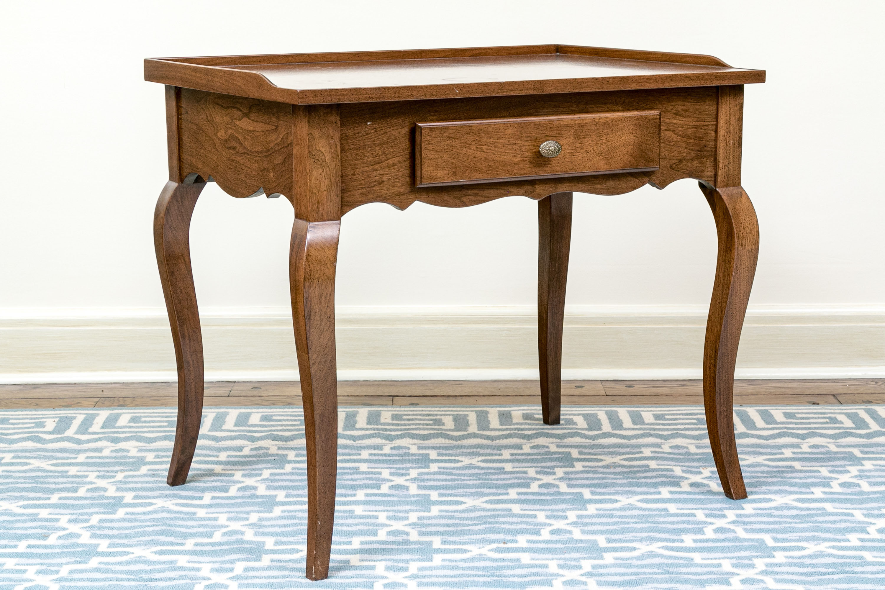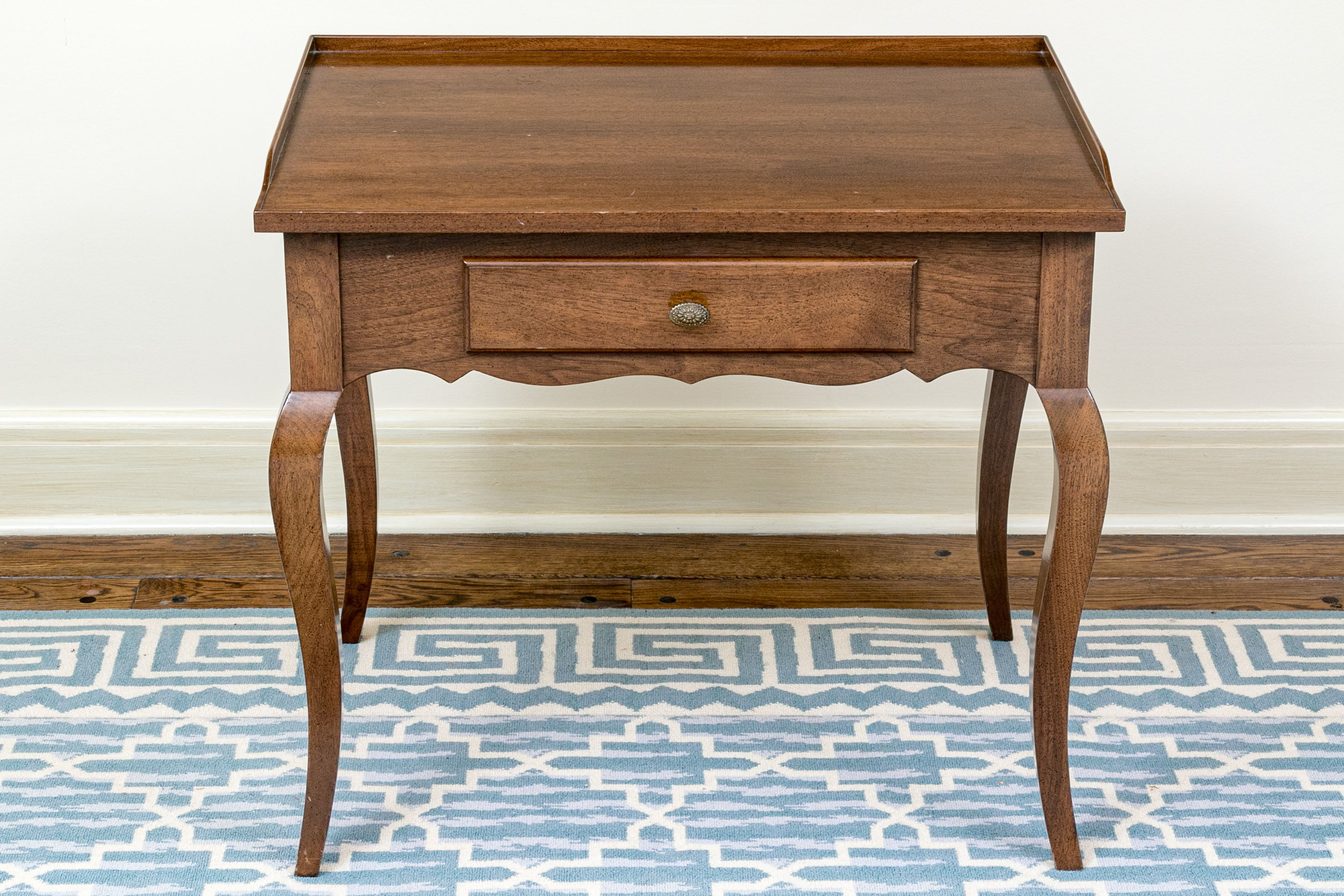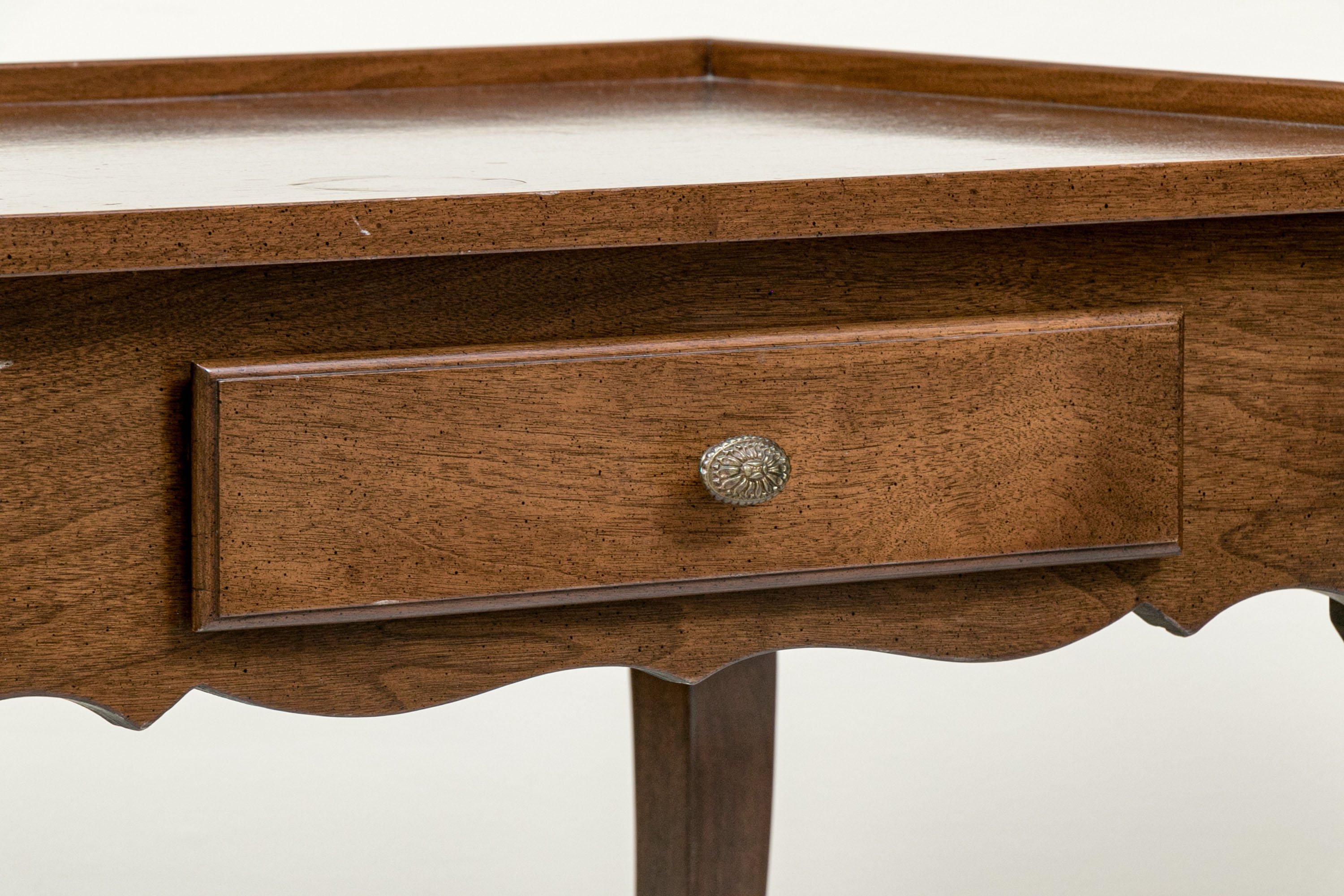 Standing on four cabriole legs with a single drawer with oval brass pull with the tabletop having a low three fourths gallery.