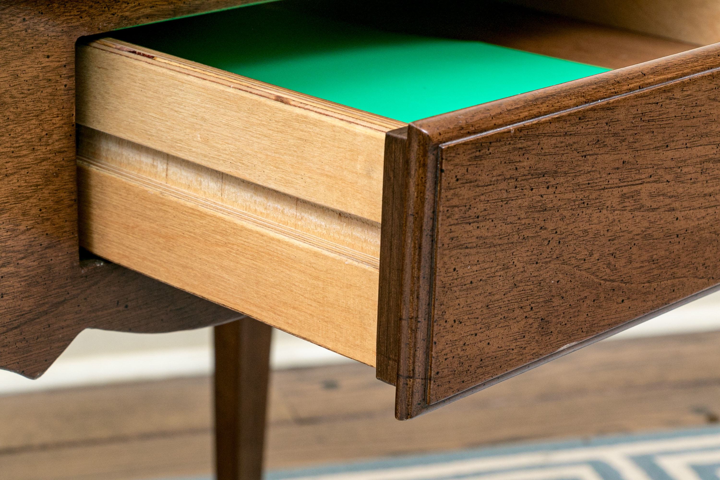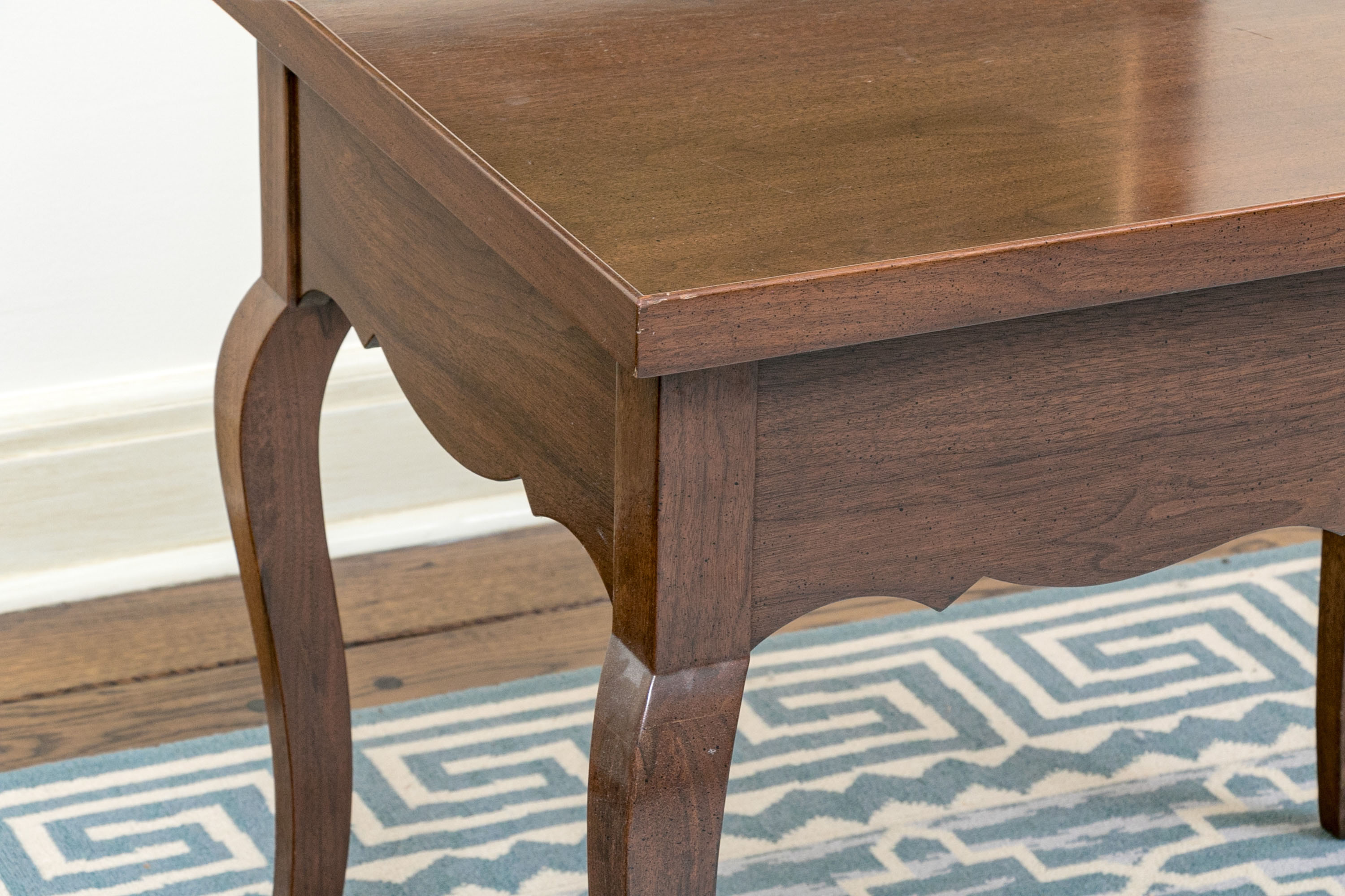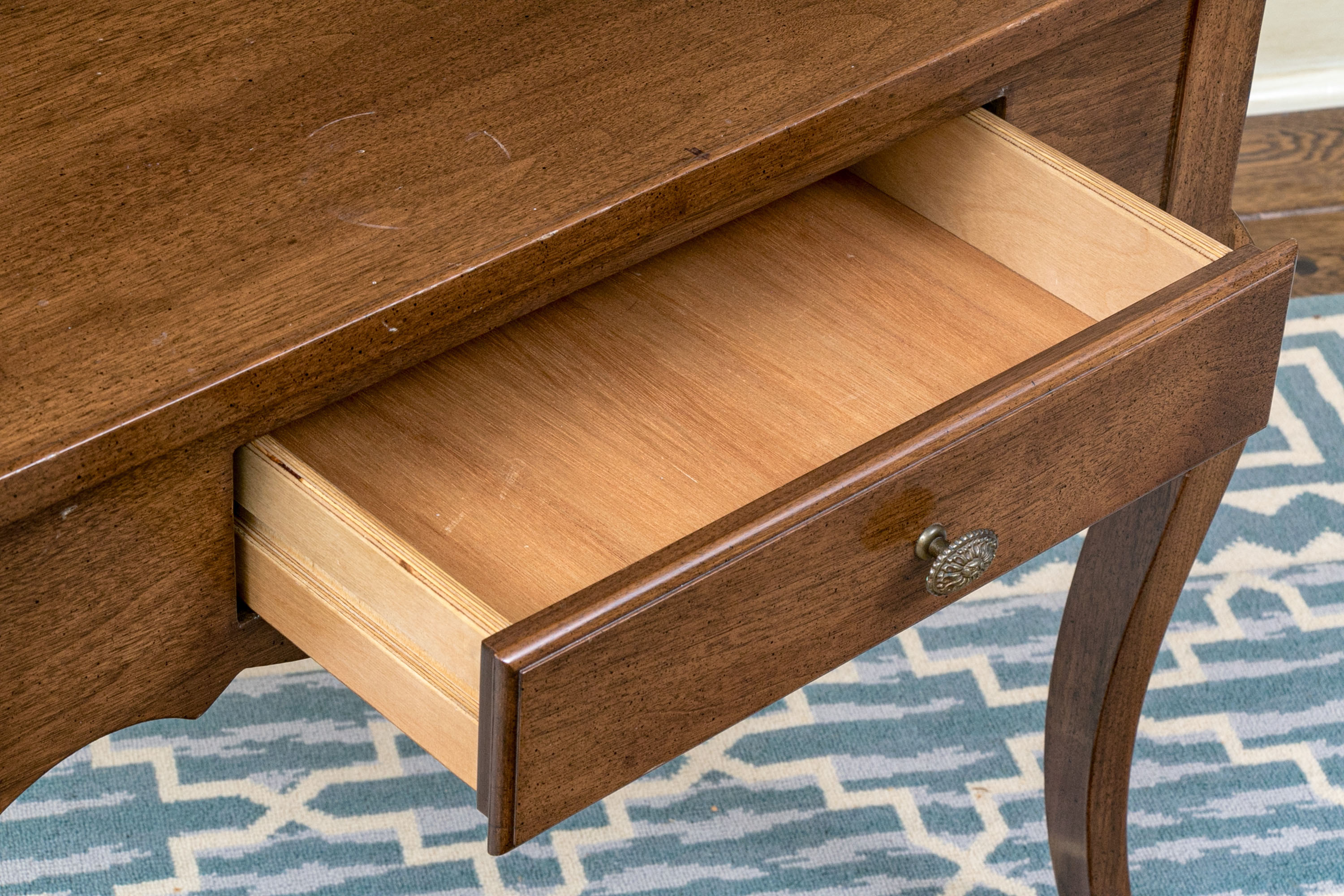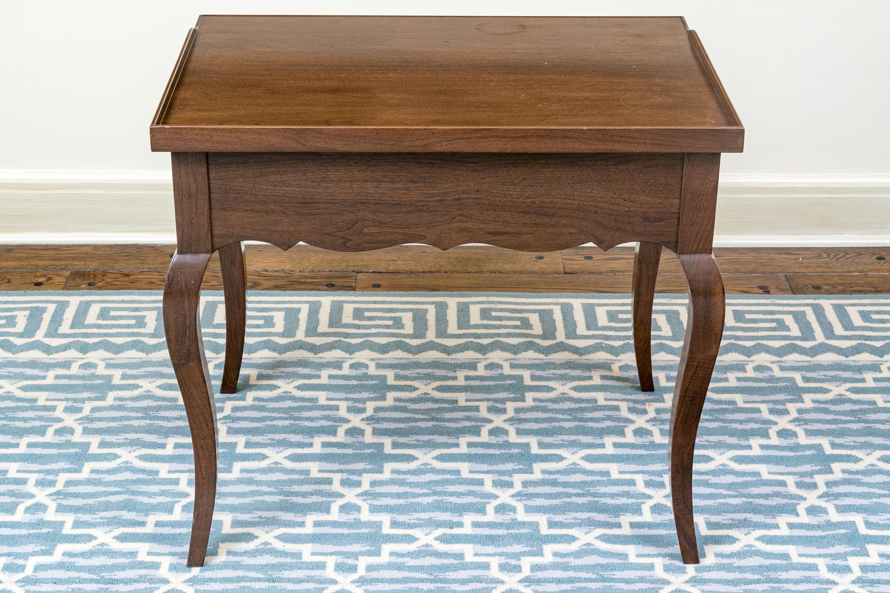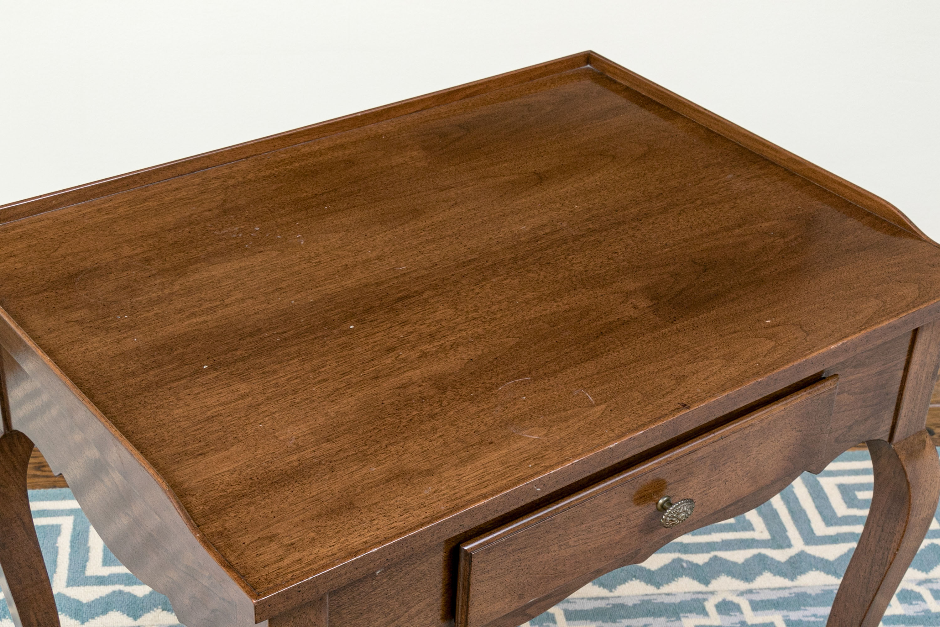 Standing on four cabriole legs with a single drawer with oval brass pull with the tabletop having a low three fourths gallery.