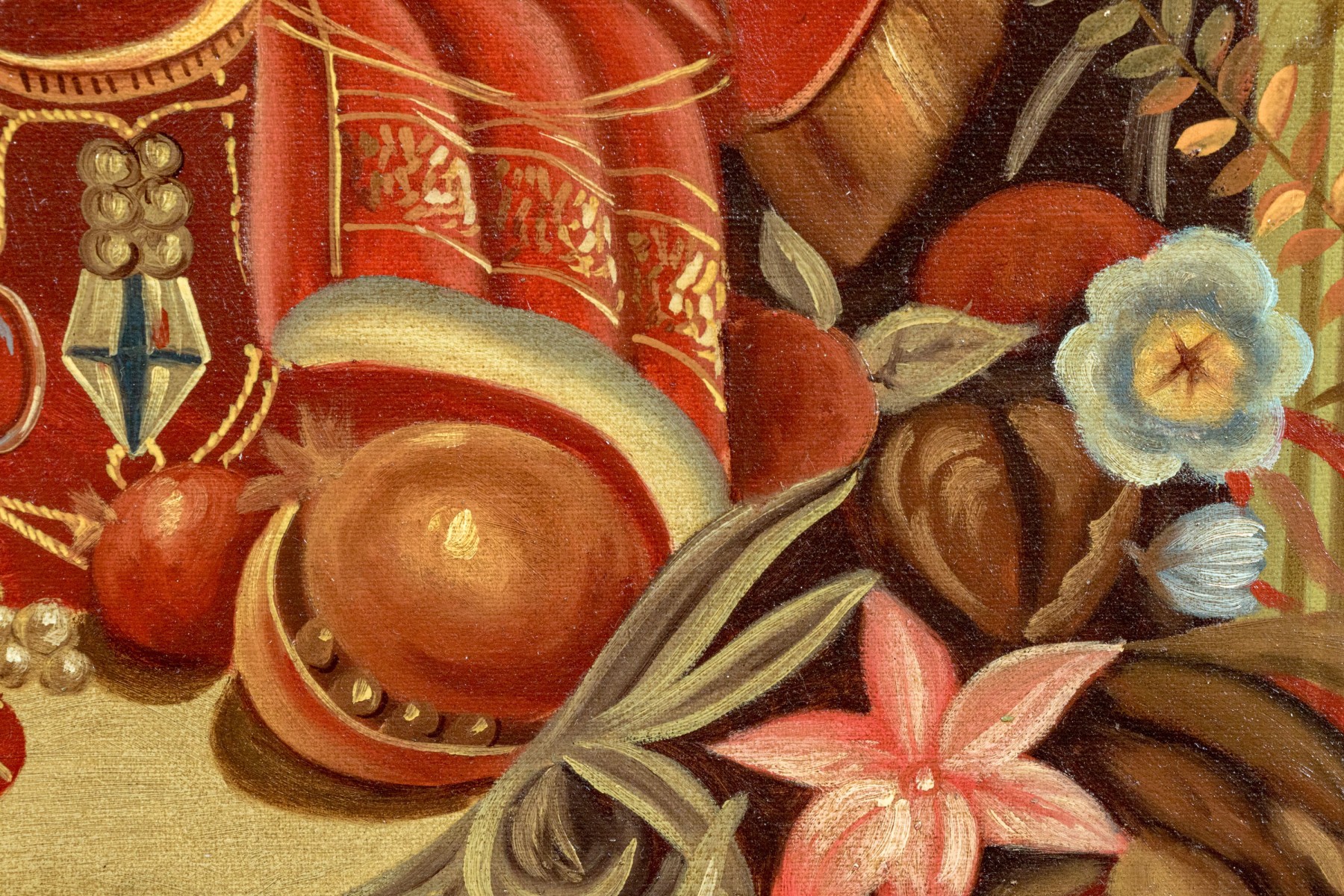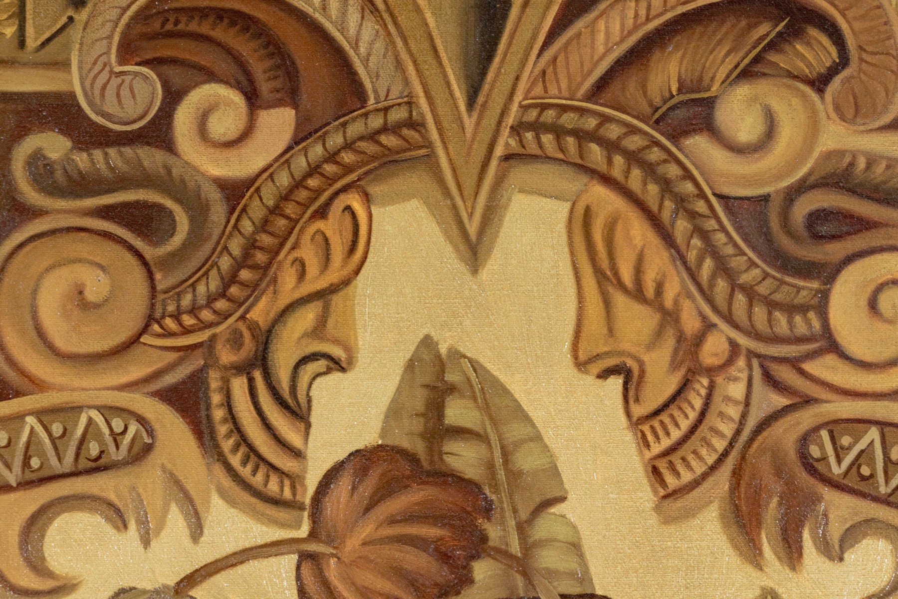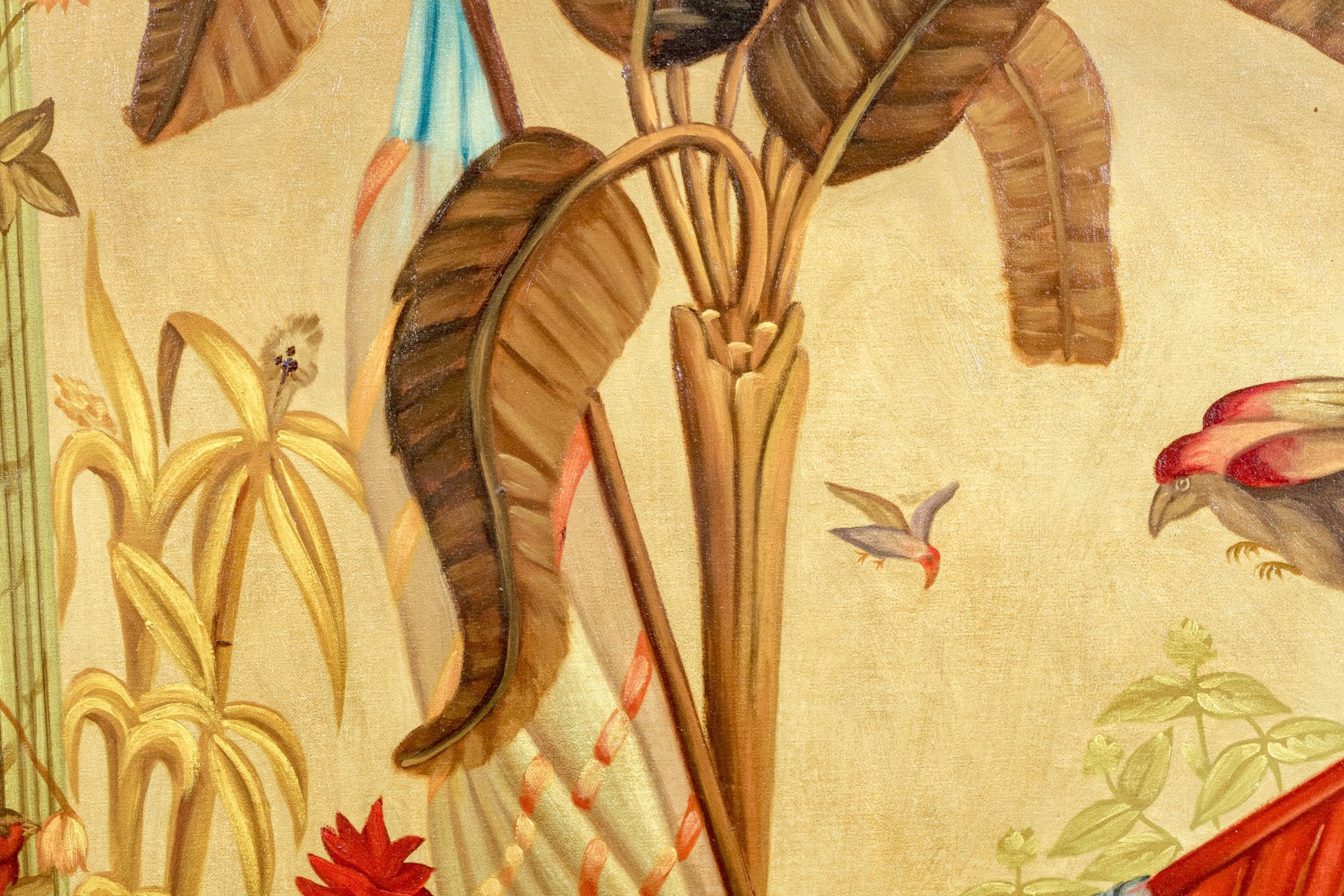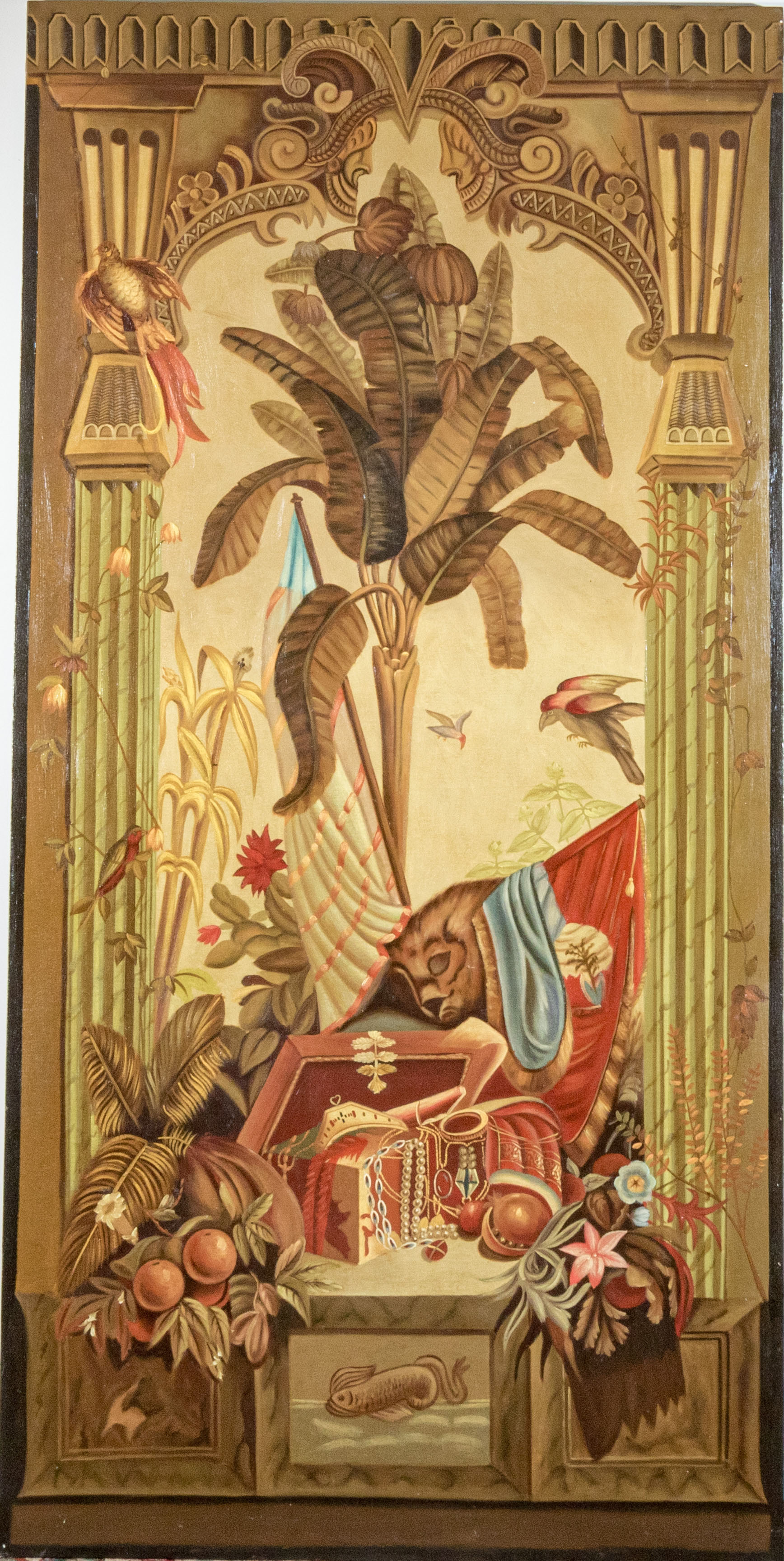 A fabulous and massive 6' H, Maitland-Smith hand-painted architectural scene with an elaborate arched door well, opening to a palm tree with a barrage of greenery, birds, with a treasure box opened and jewels and lavish items seemingly spilling out.