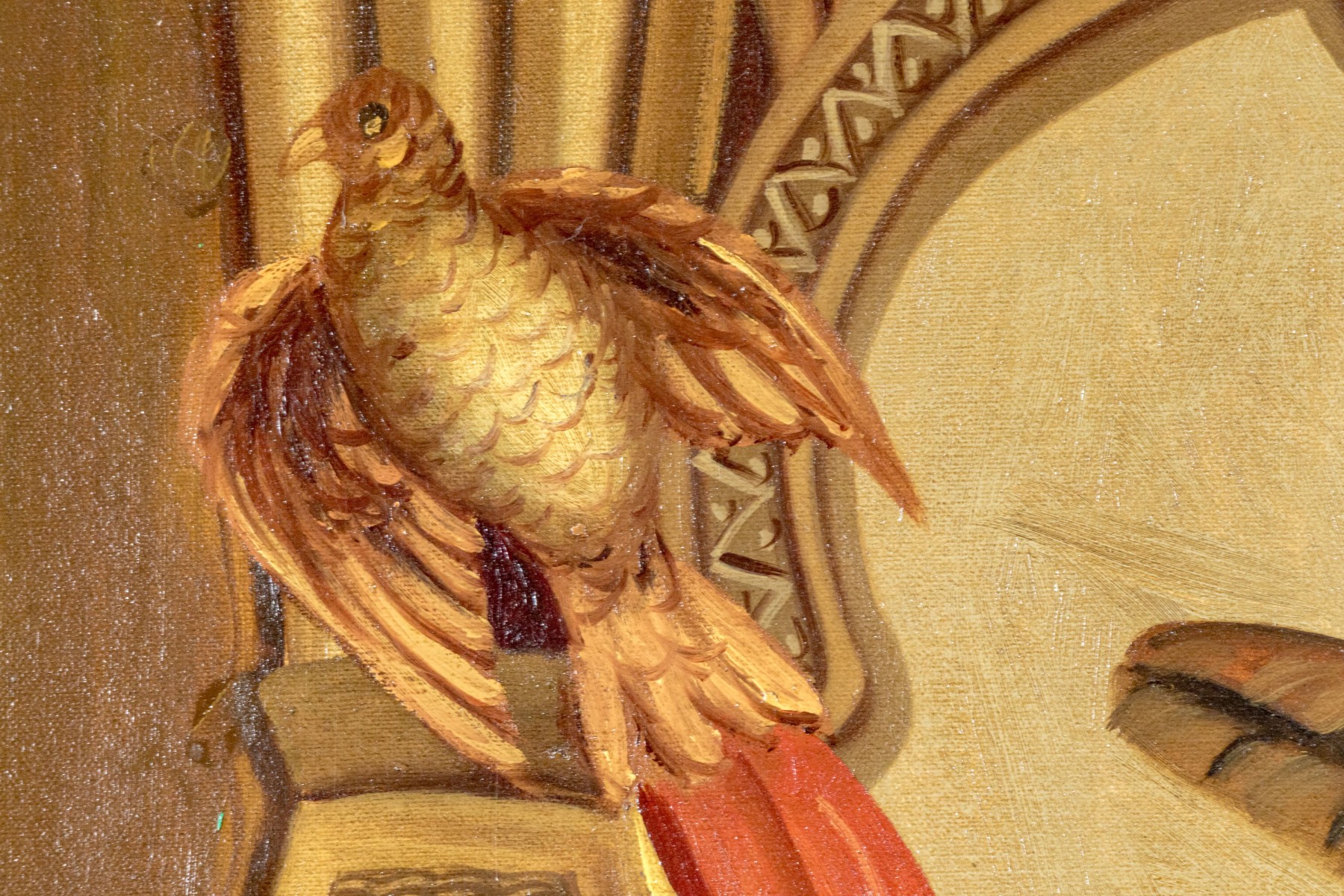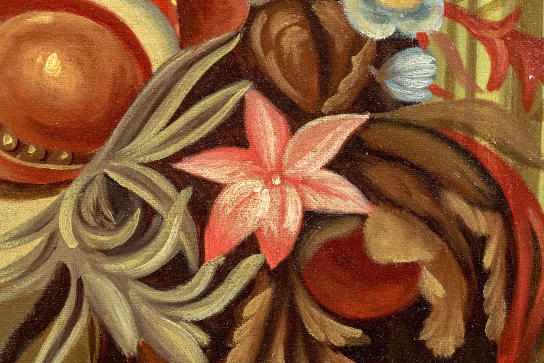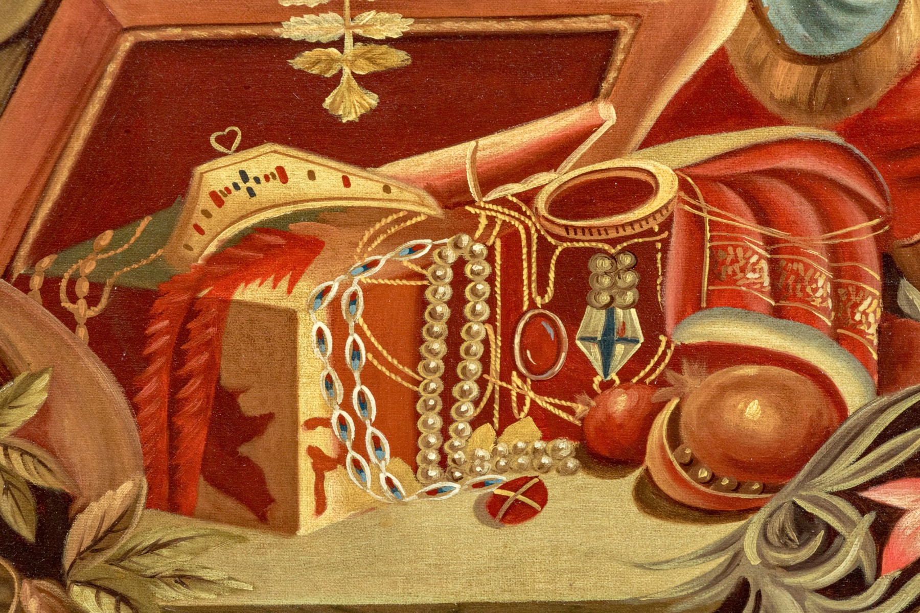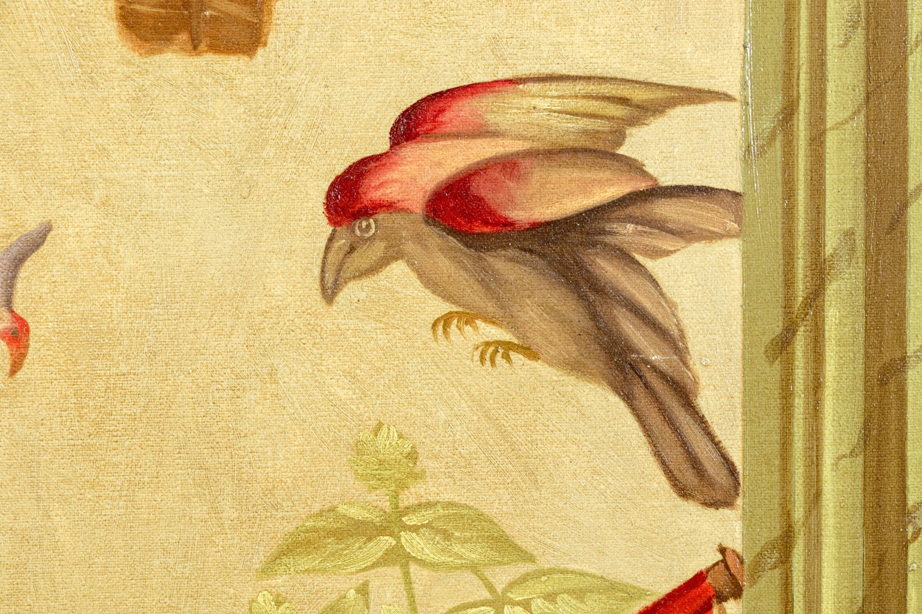 A fabulous and massive 6' H, Maitland-Smith hand-painted architectural scene with an elaborate arched door well, opening to a palm tree with a barrage of greenery, birds, with a treasure box opened and jewels and lavish items seemingly spilling out.