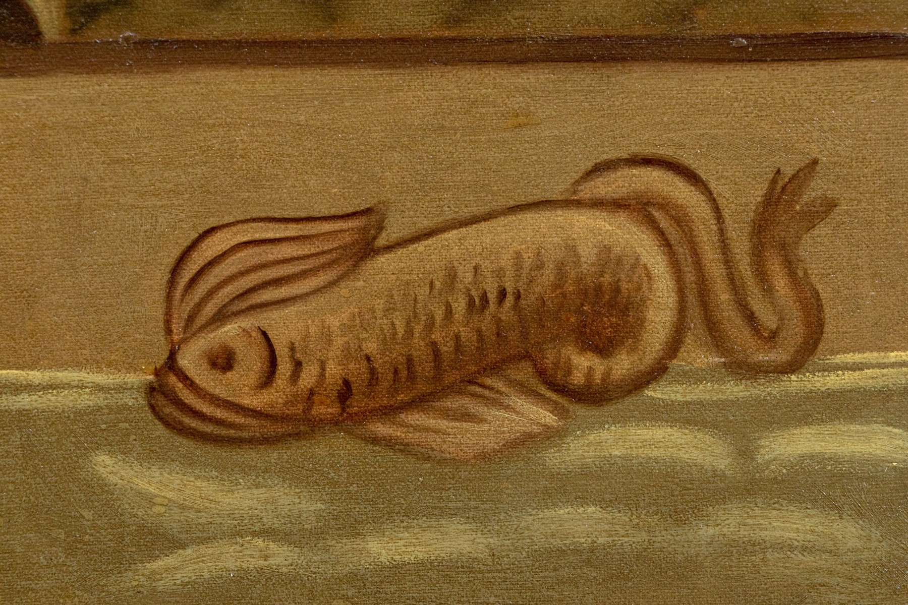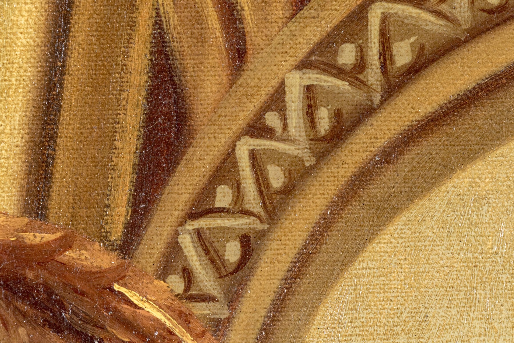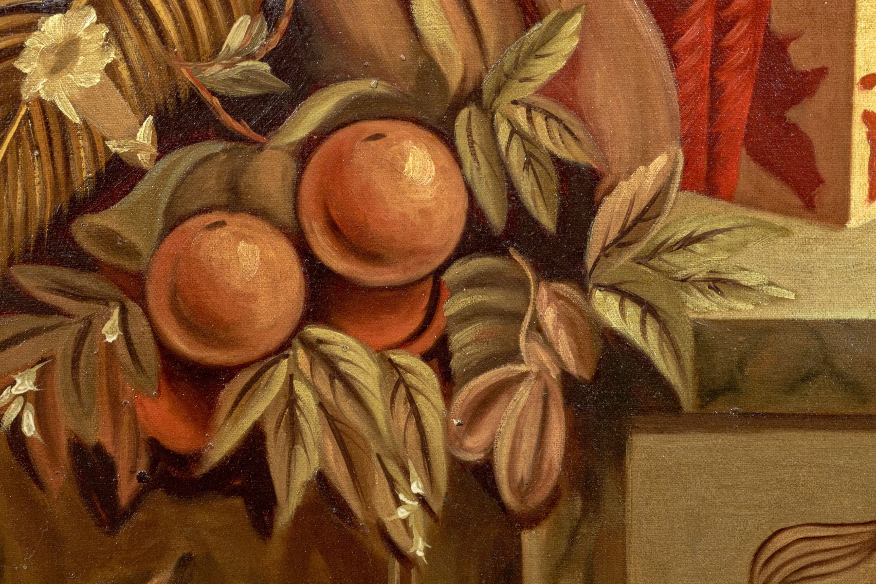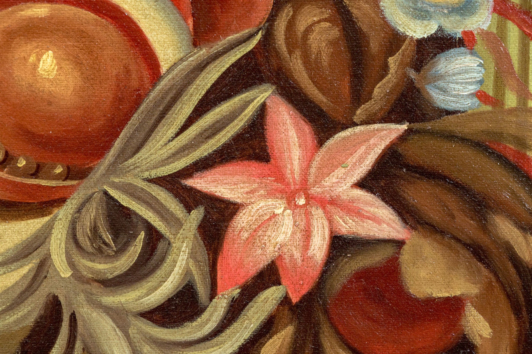 A fabulous and massive 6' H, Maitland-Smith hand-painted architectural scene with an elaborate arched door well, opening to a palm tree with a barrage of greenery, birds, with a treasure box opened and jewels and lavish items seemingly spilling out.
