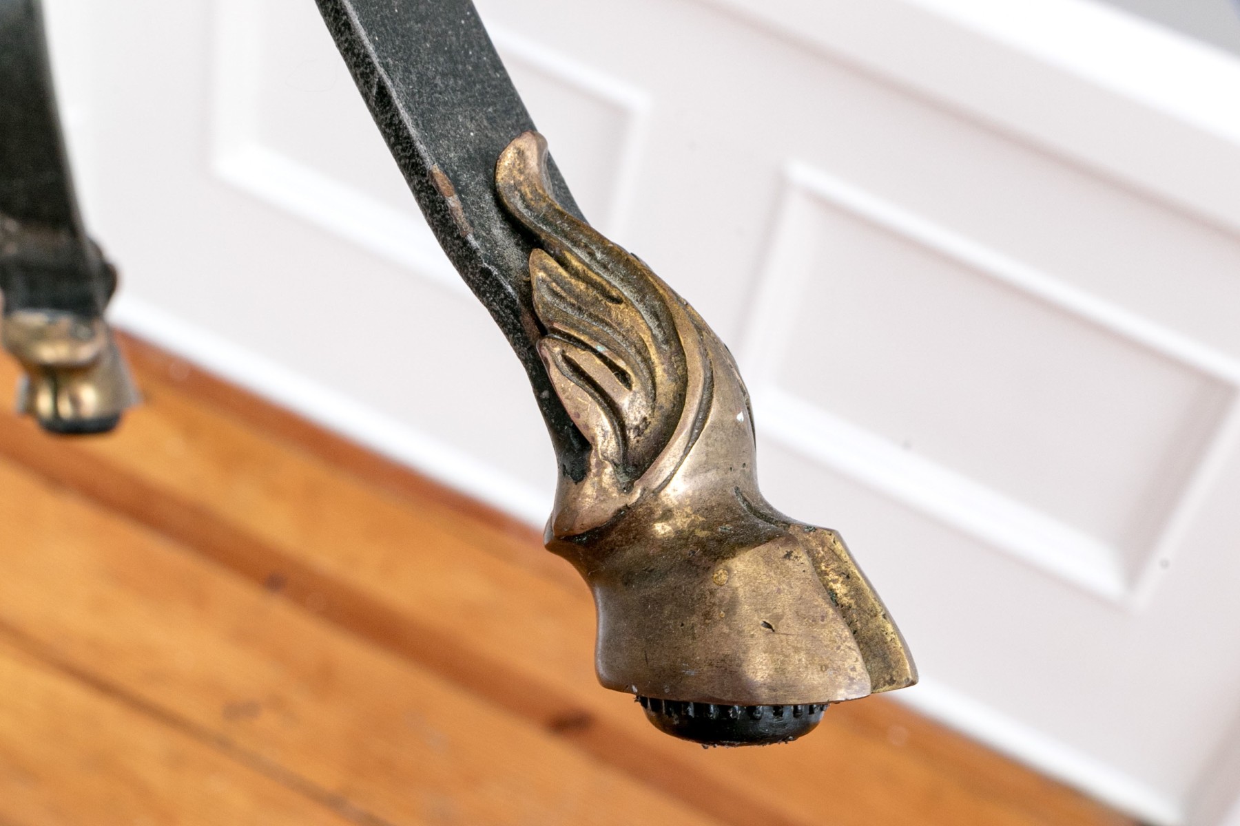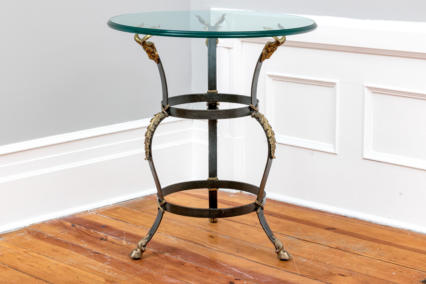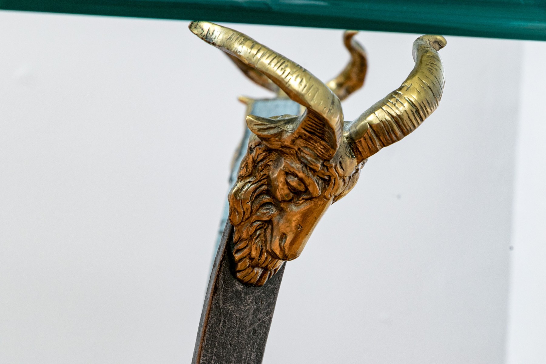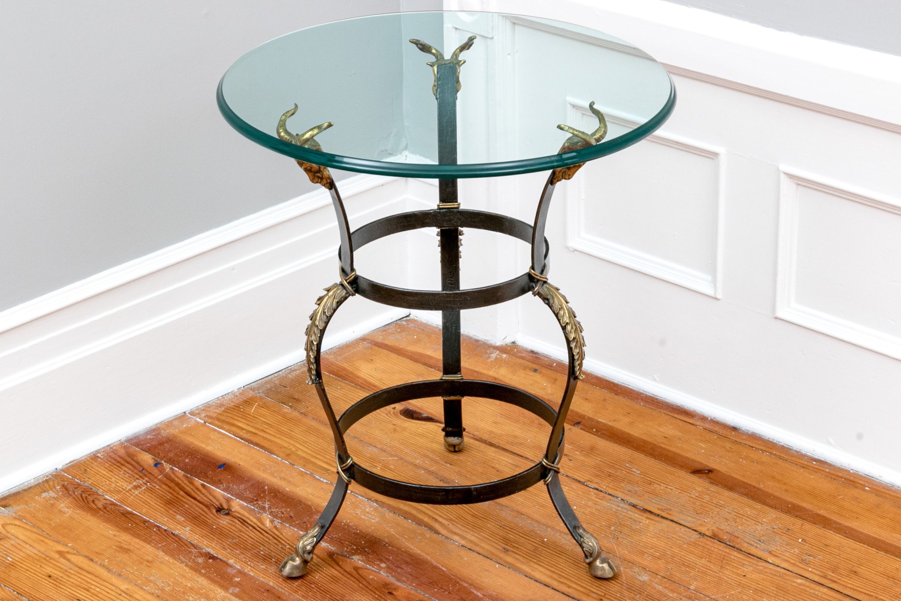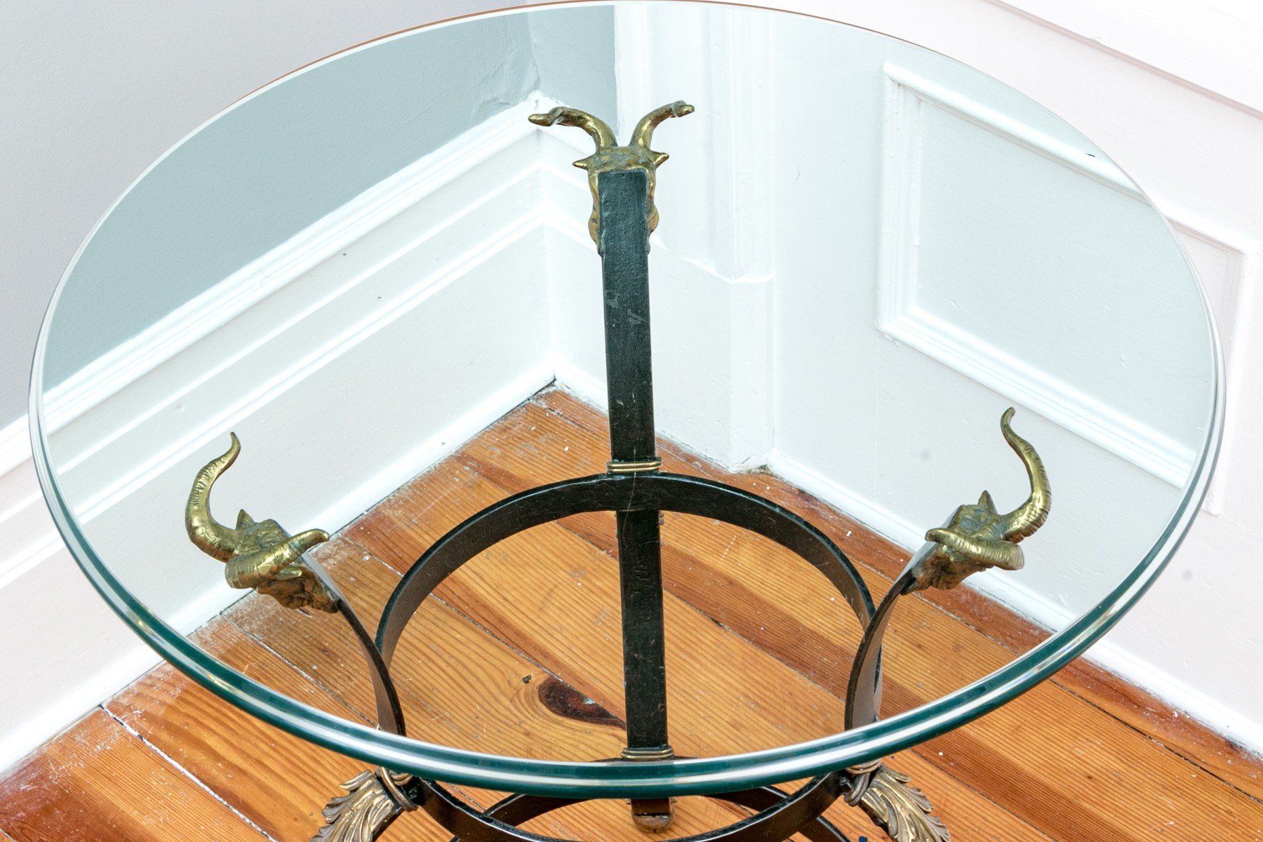 Three gilt hoof form feet, with ram head supports for the circular glass top.