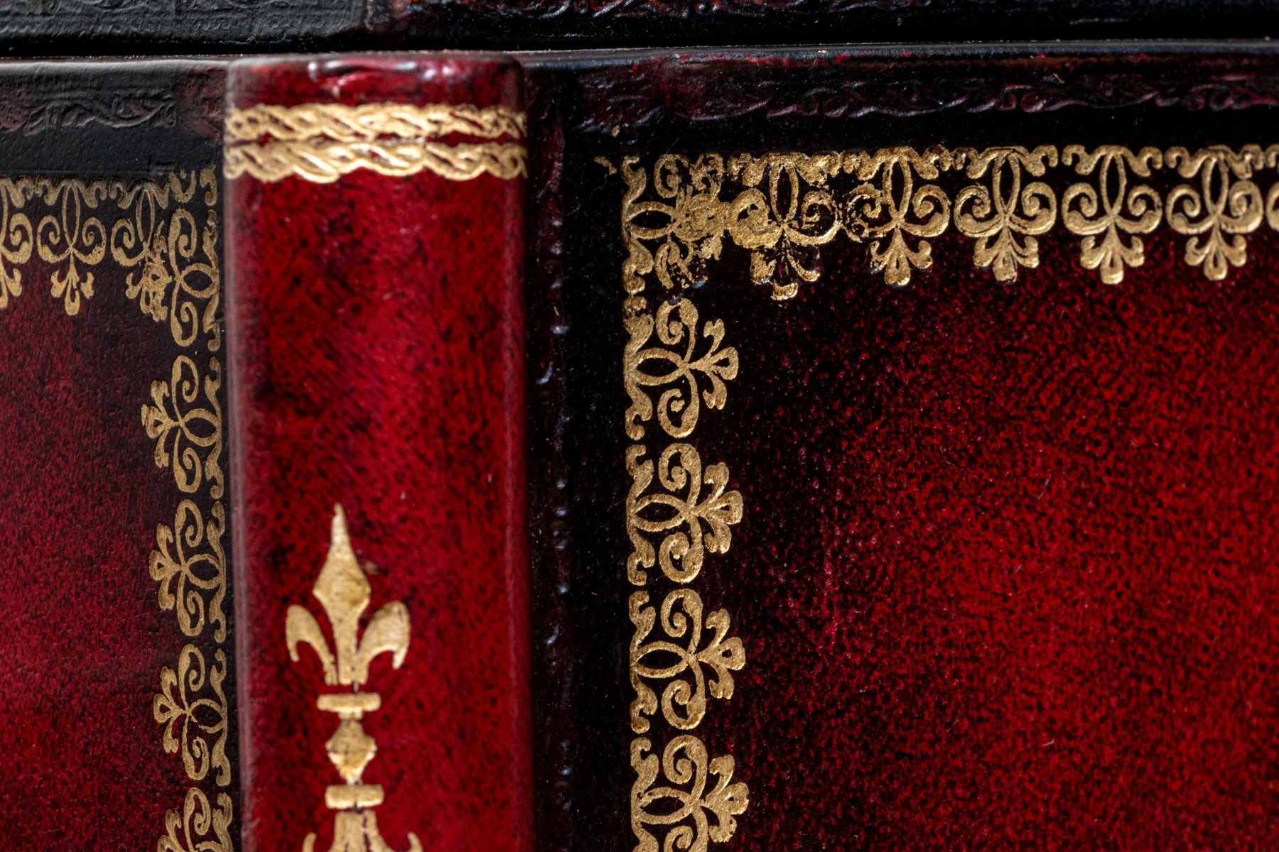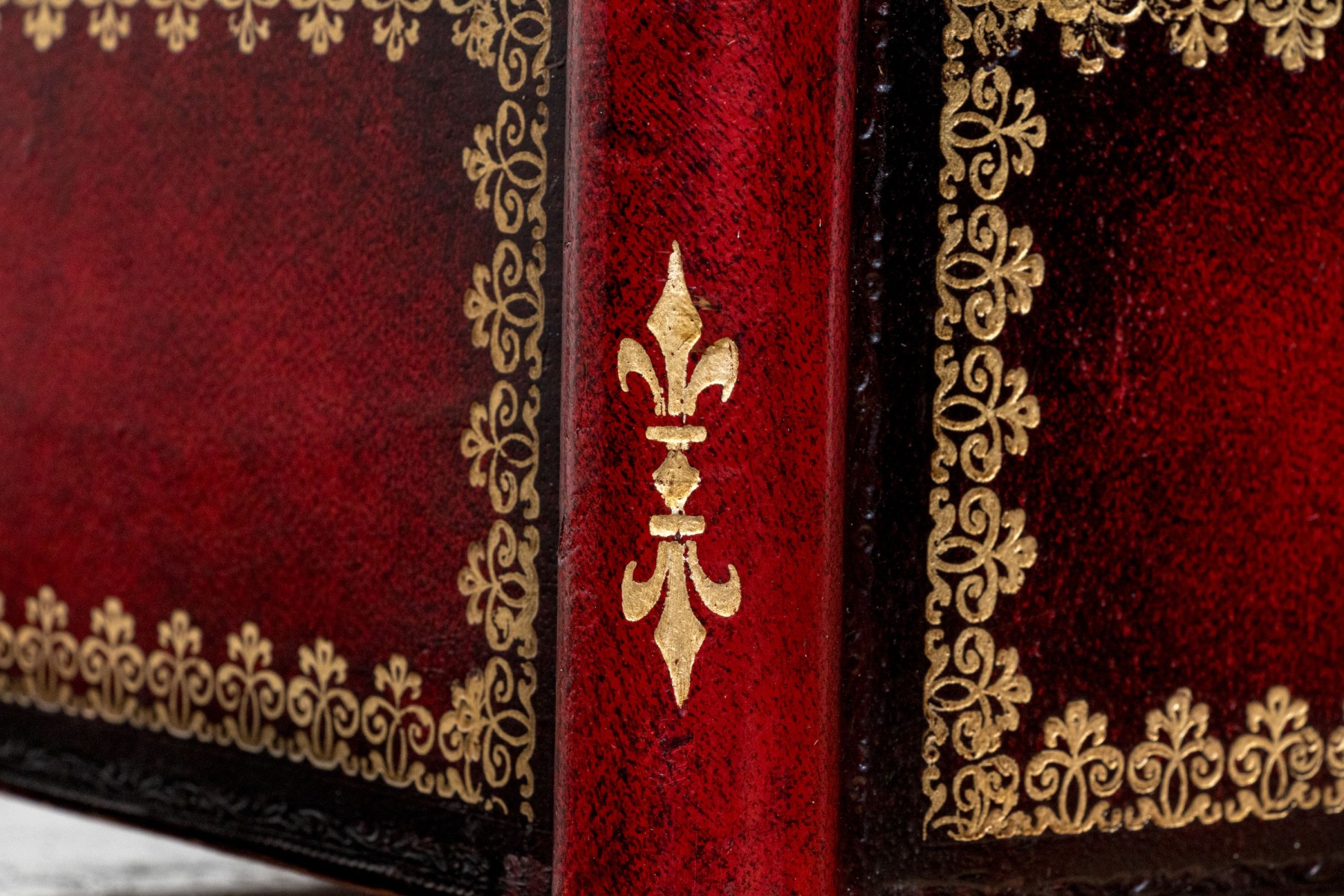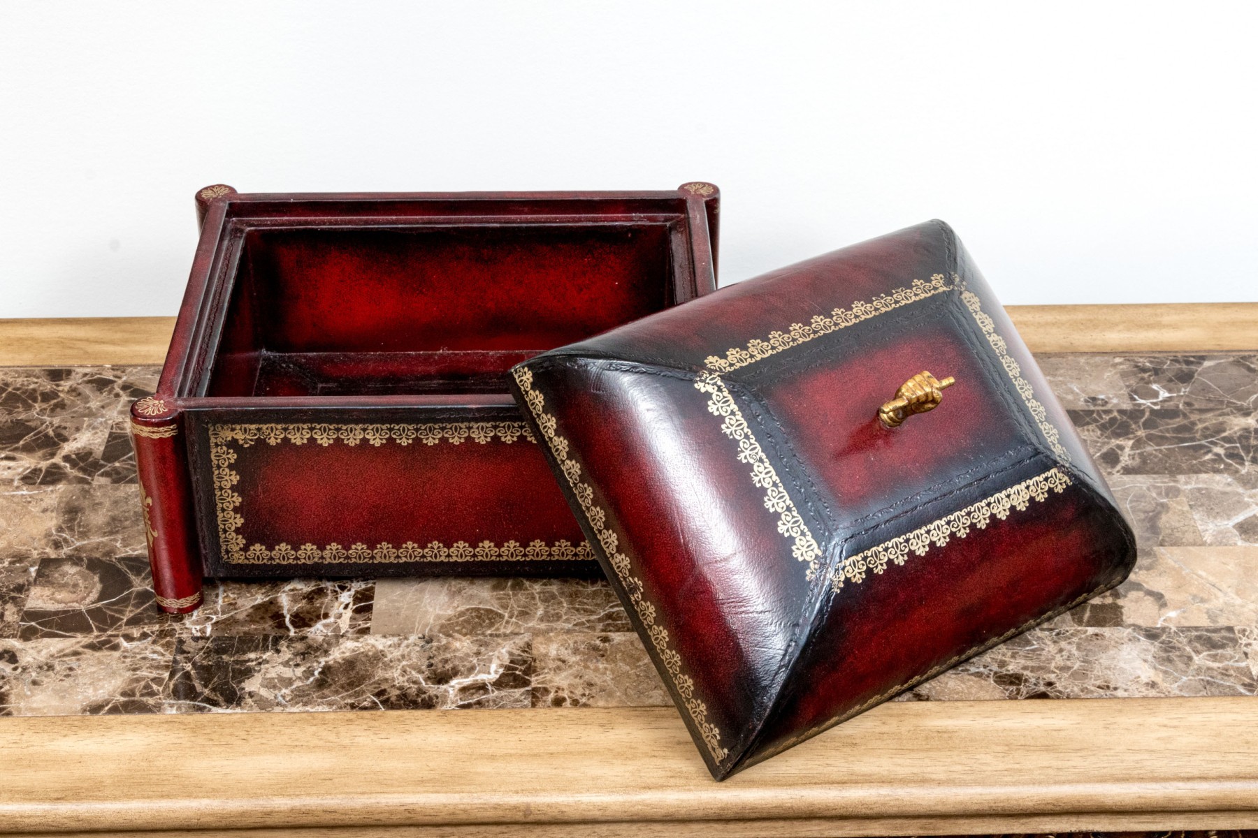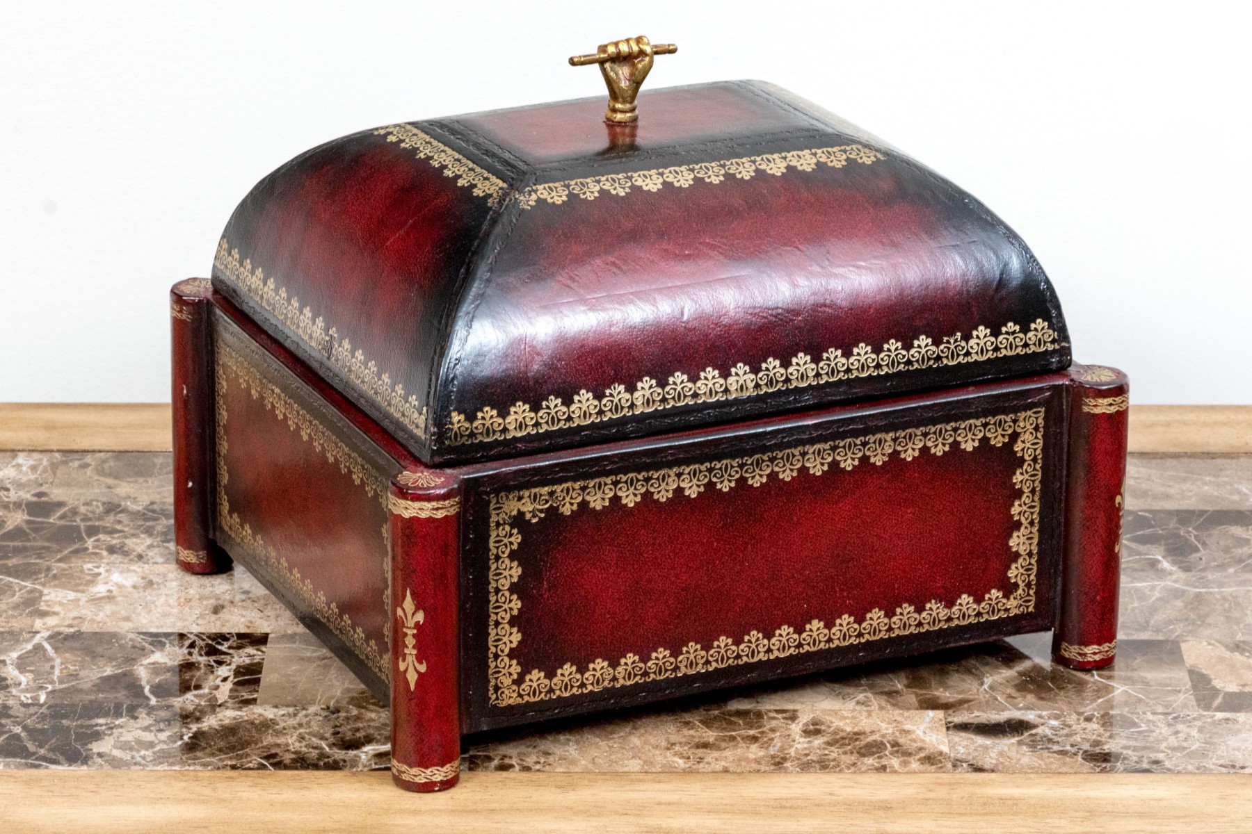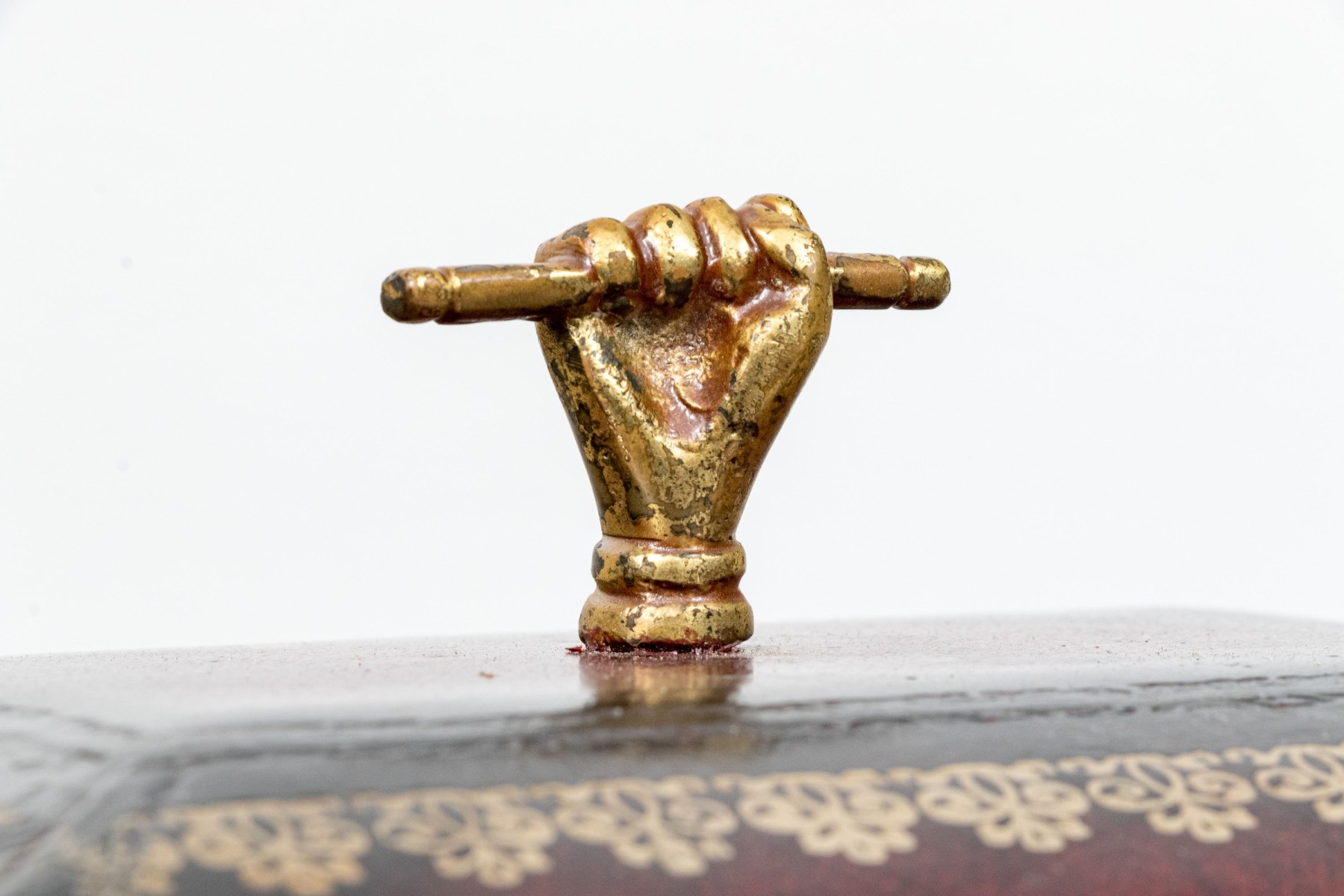 Square form with cylindrical corners with a domed lid and hand holding dowel in gilt finish as handle atop the lid. The burgundy leather wrap has gilt tooled embellishment.