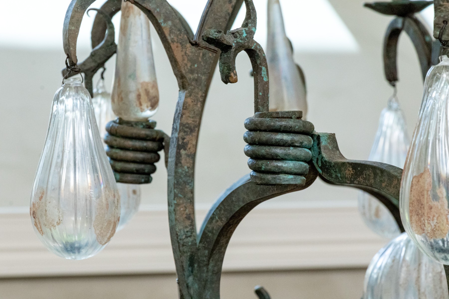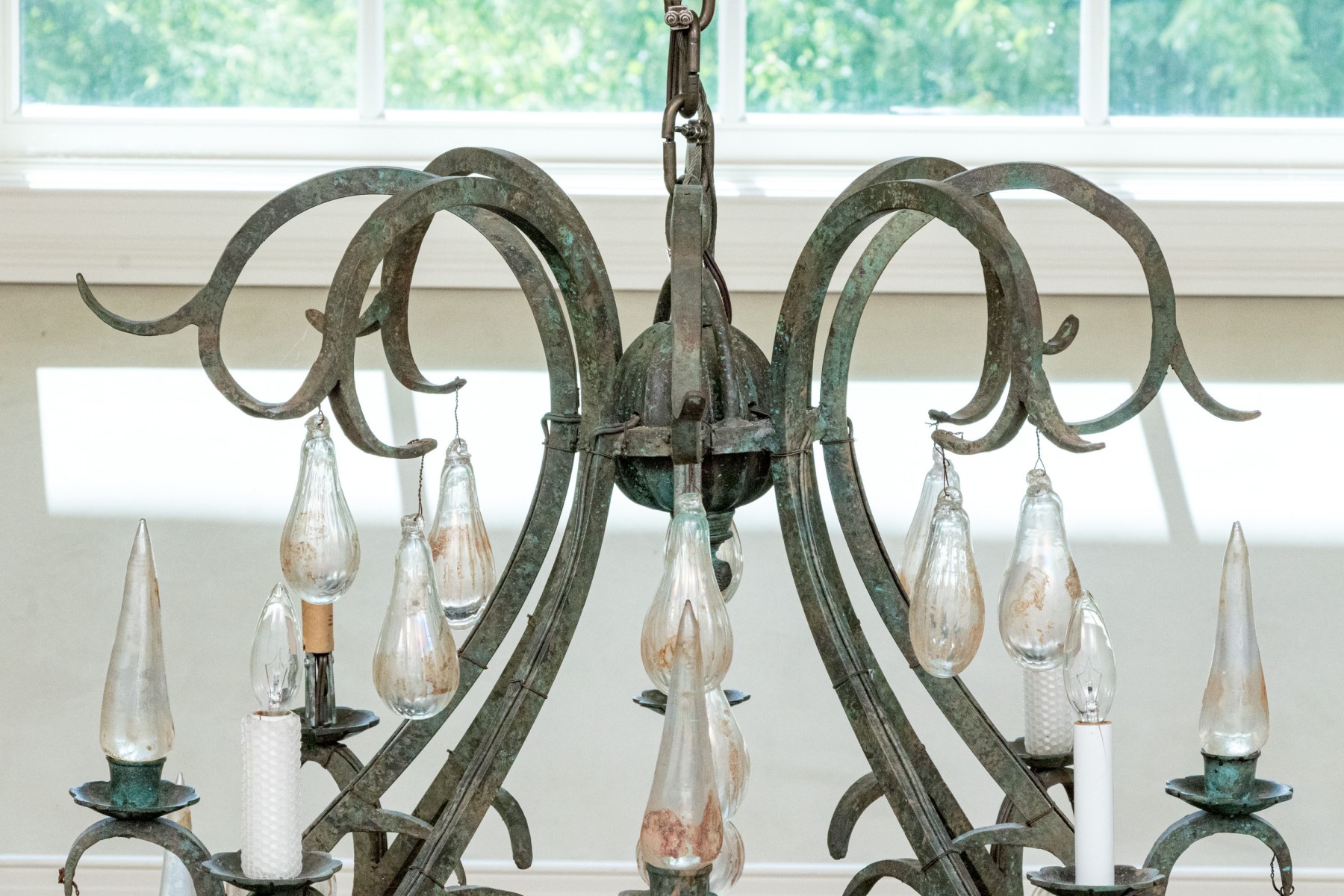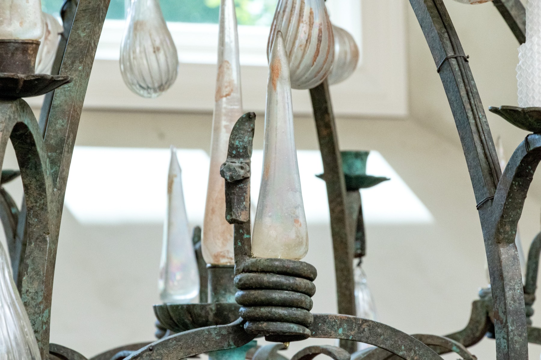 An impressive chandelier featuring a verdigris patinaed wrought iron frame with six scrolled main arms forming a pear-shaped body adorned with electric candle sockets and gorgeous ribbed murano glass prisms.