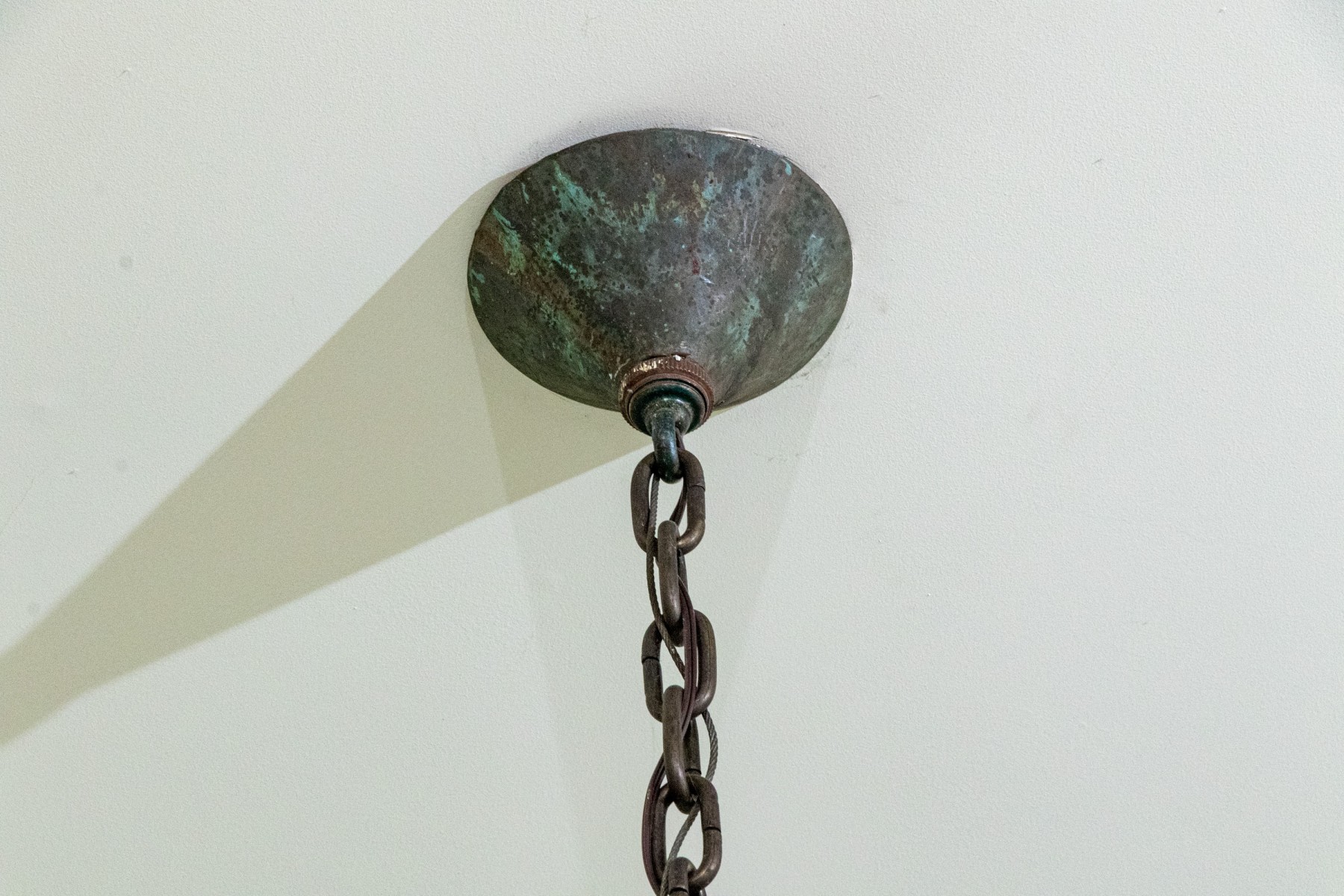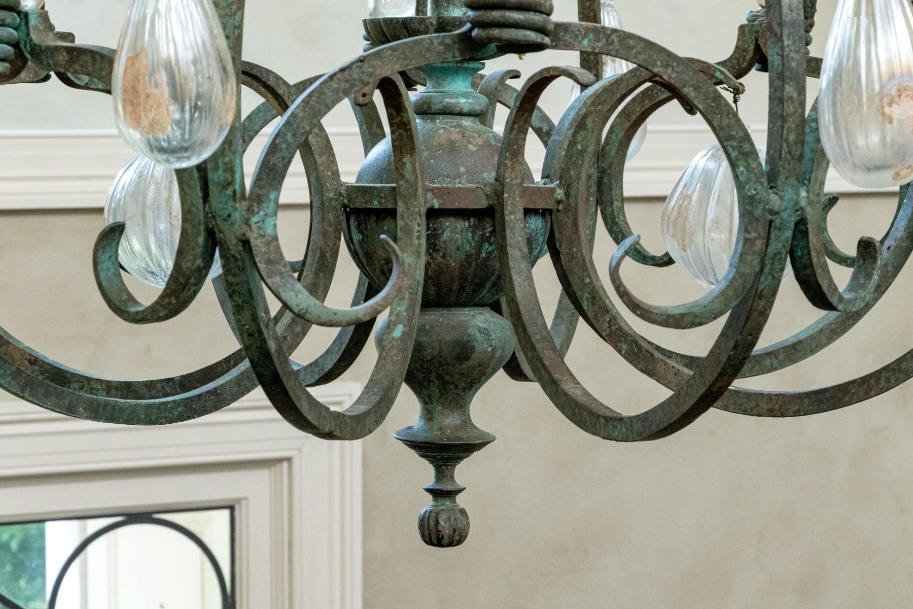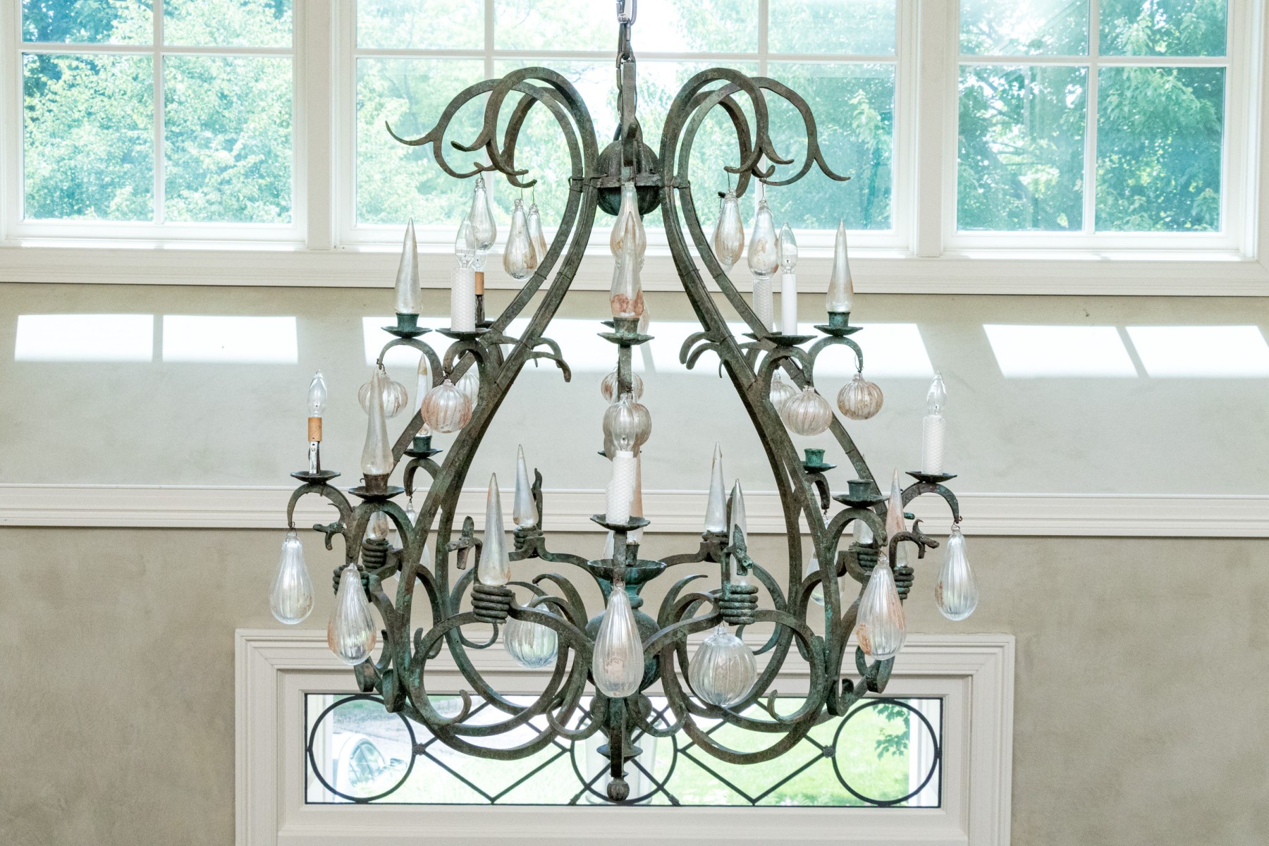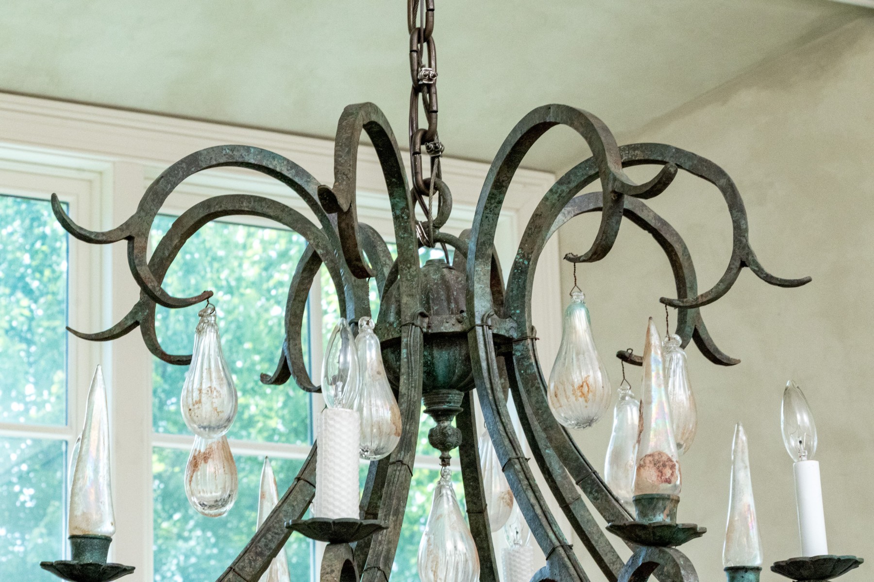 An impressive chandelier featuring a verdigris patinaed wrought iron frame with six scrolled main arms forming a pear-shaped body adorned with electric candle sockets and gorgeous ribbed murano glass prisms.