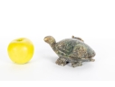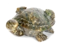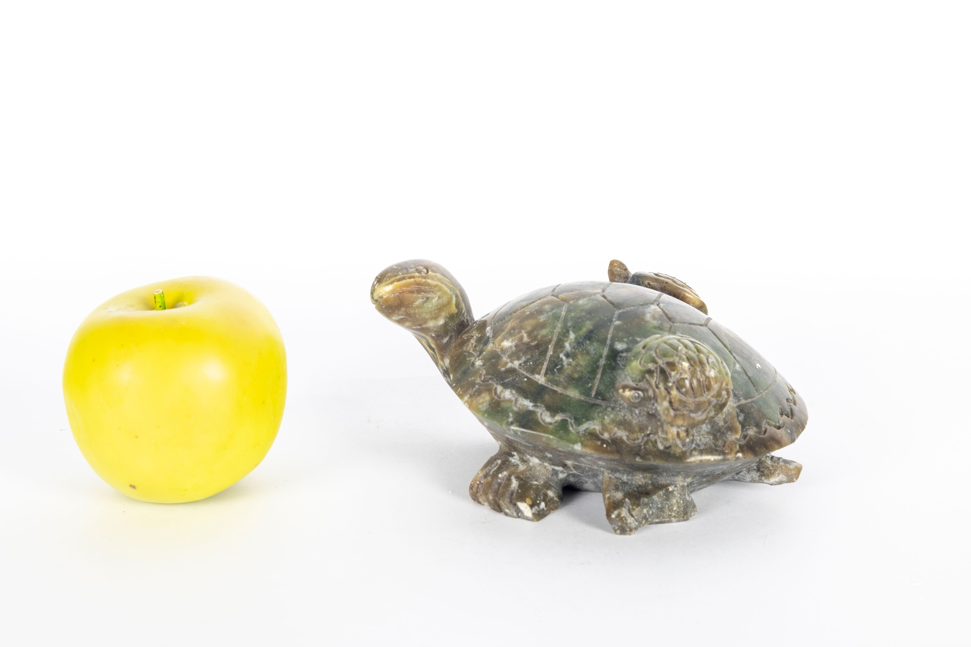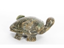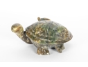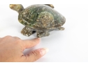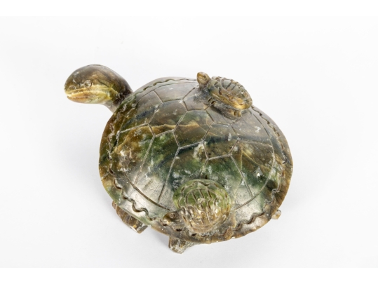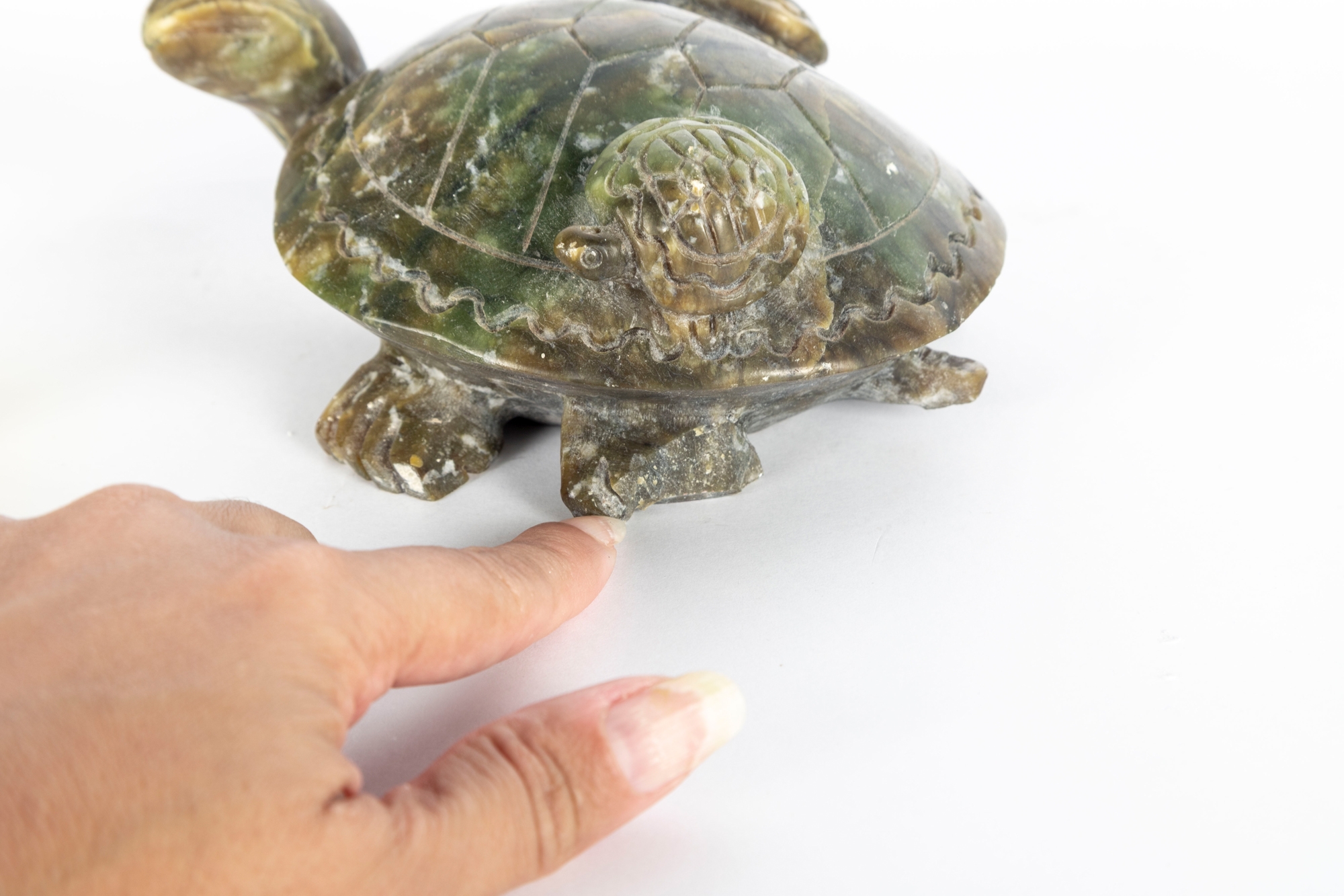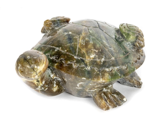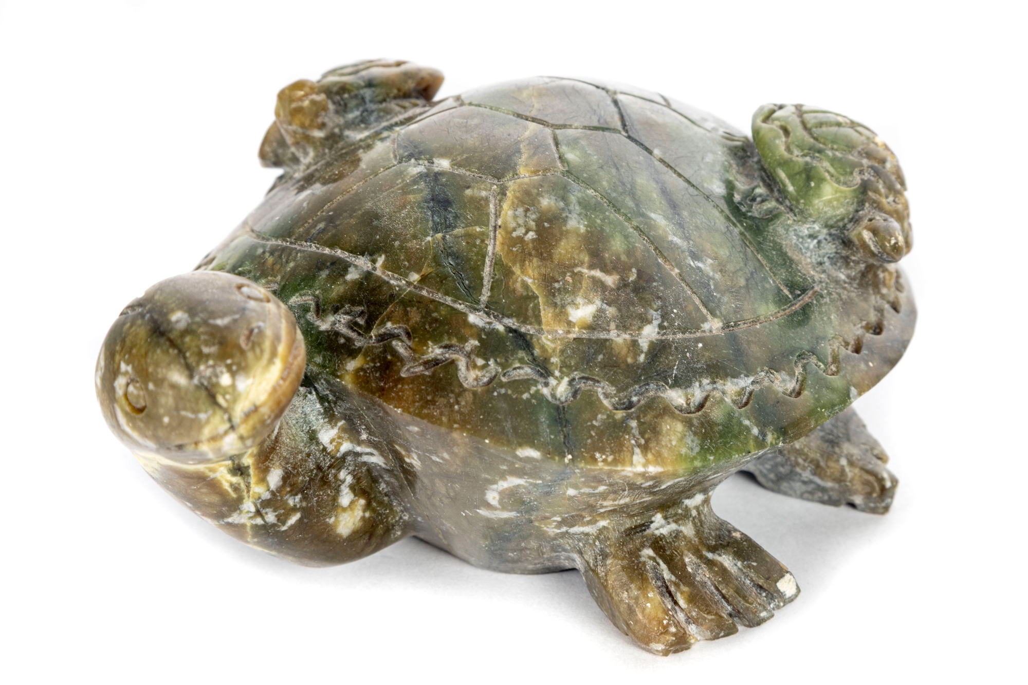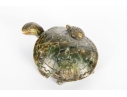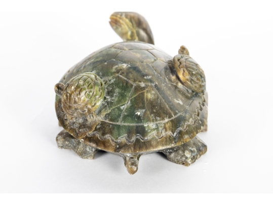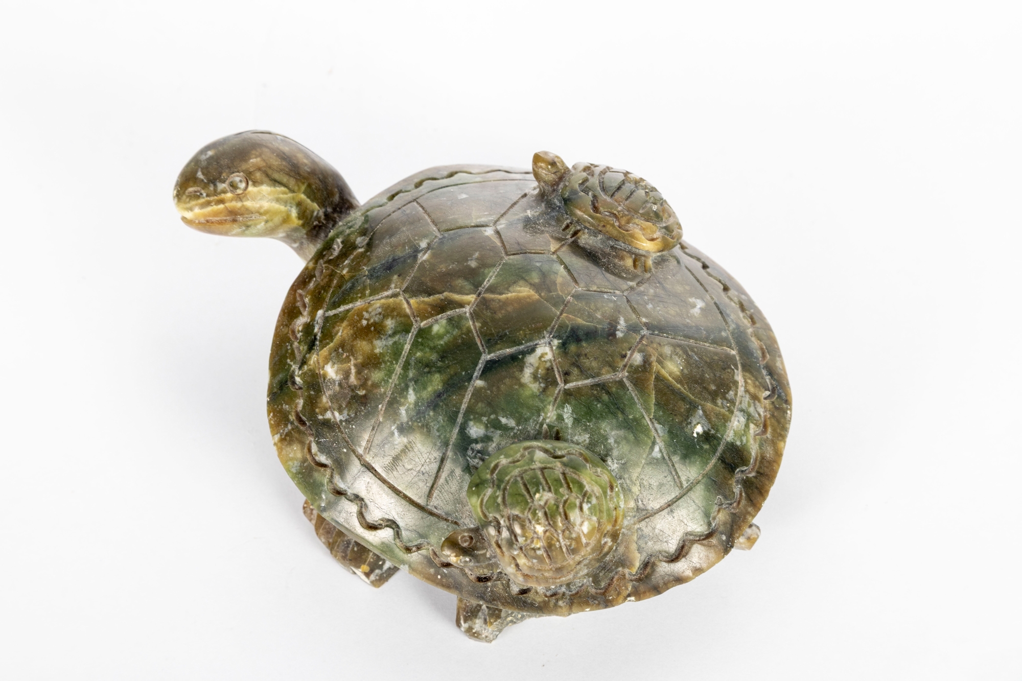 A delightful carved jade figurine of a mother tortoise and her two babies on her shell. A charming ornamental piece with beautifully mottled green and brown hues.