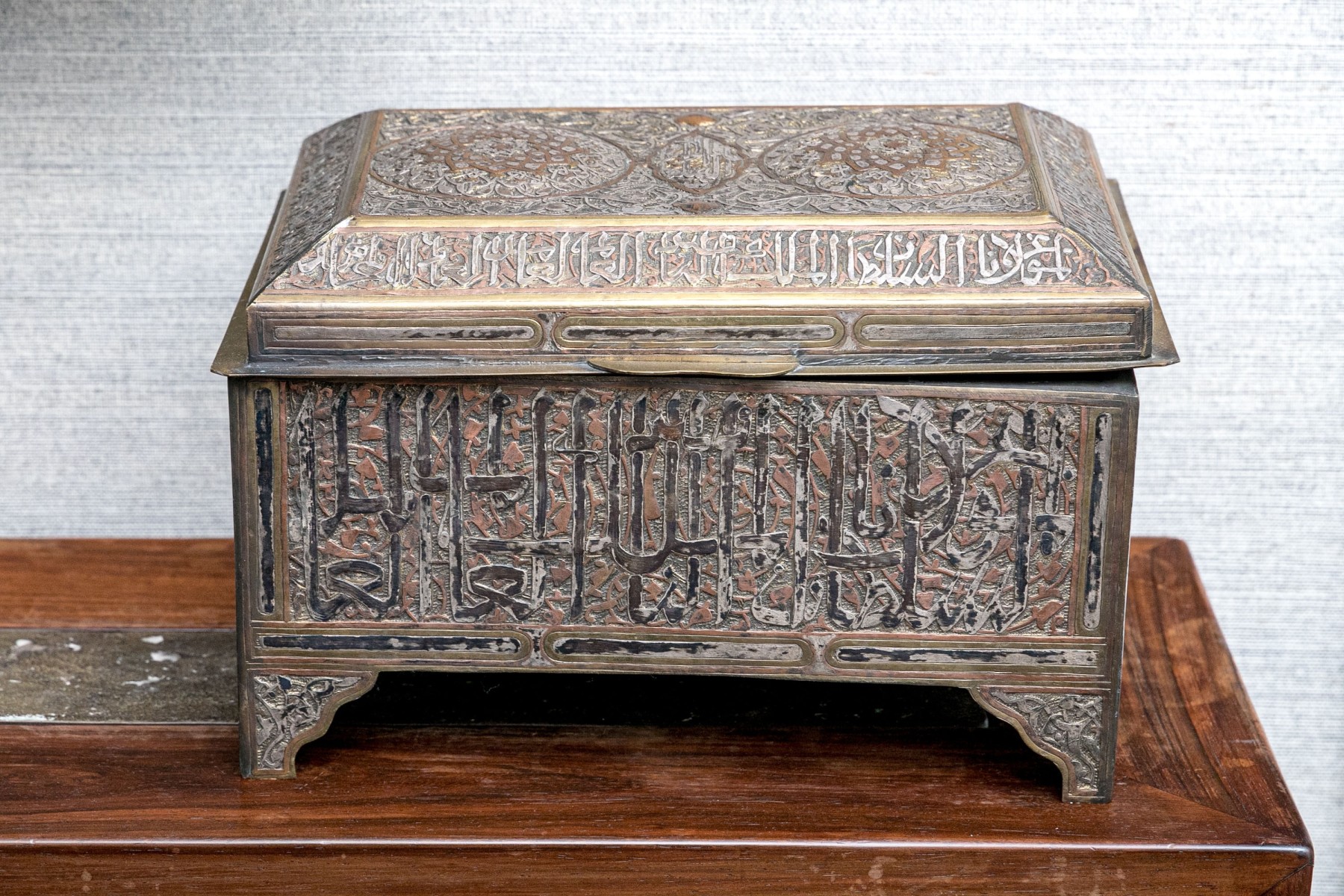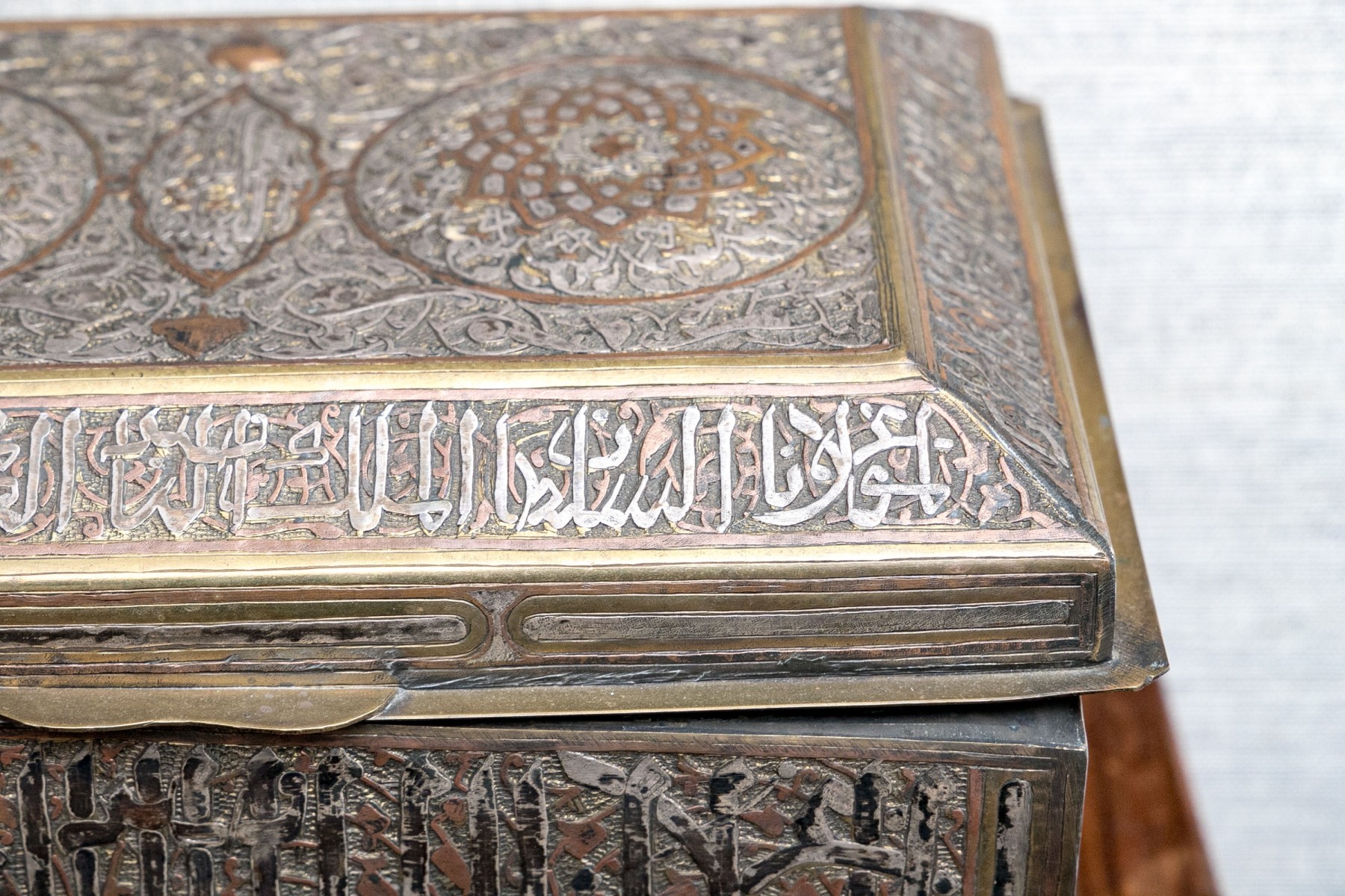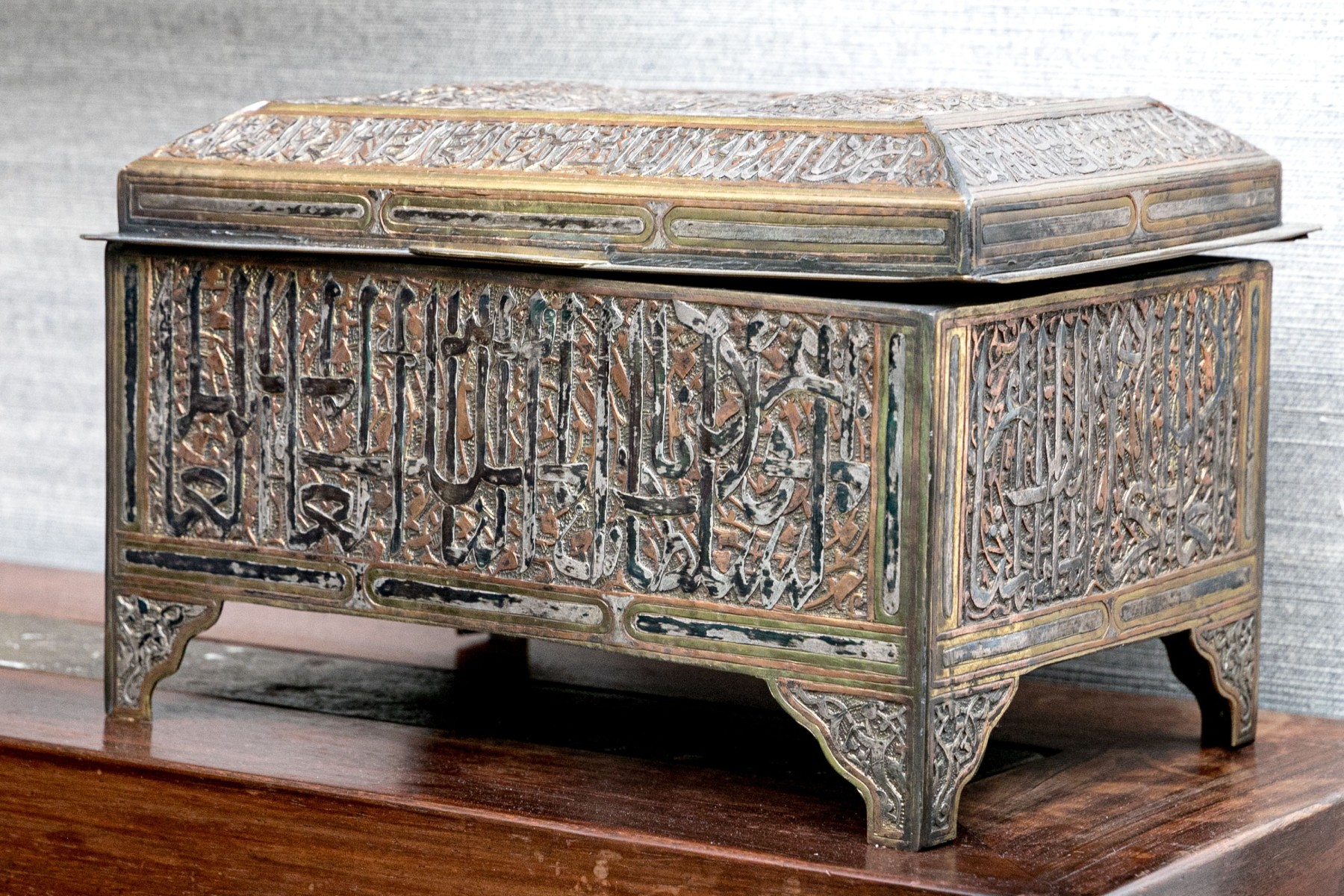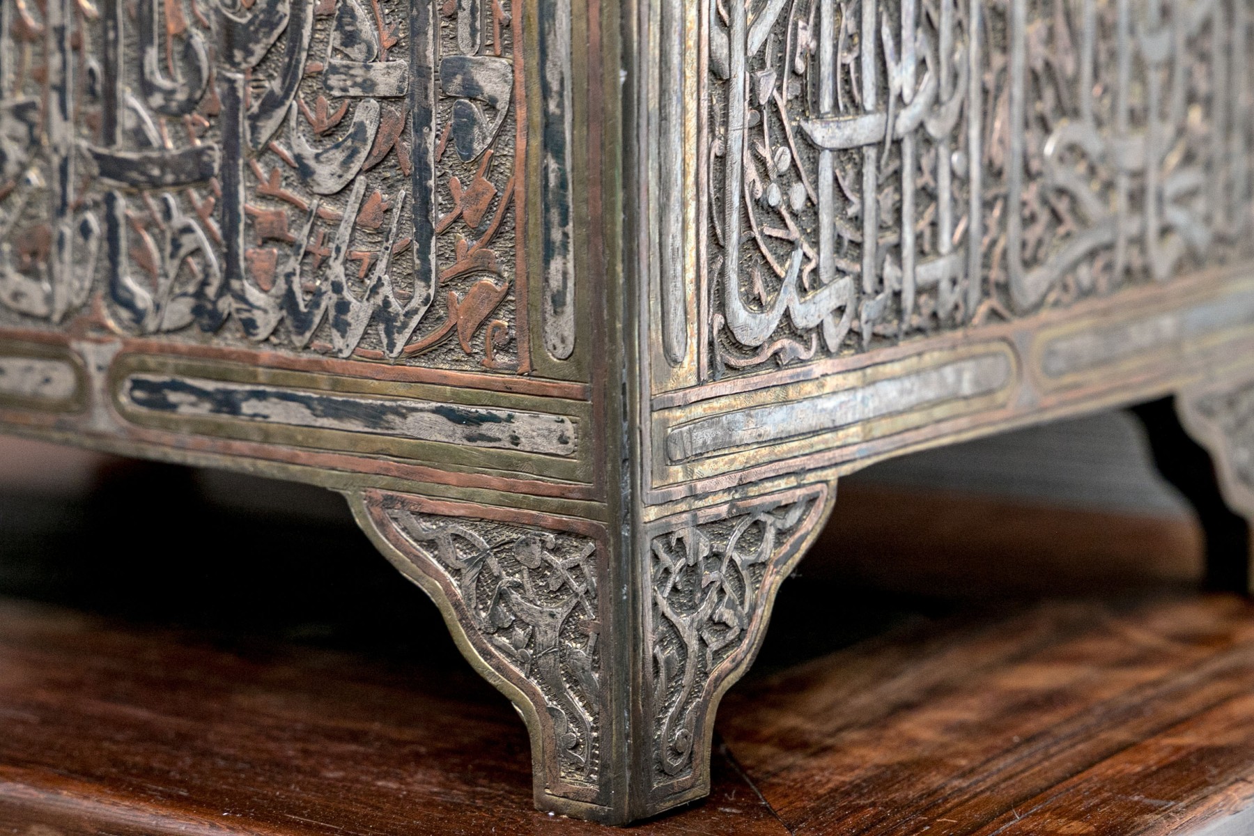 A handsome Mamluk Revival metal casket showcasing a hipped rectangular lid over a rectangular body raised on bracket legs. The exterior is finely paneled and beautifully incised with copper, brass, and silvertone accents throughout geometric texture and script.