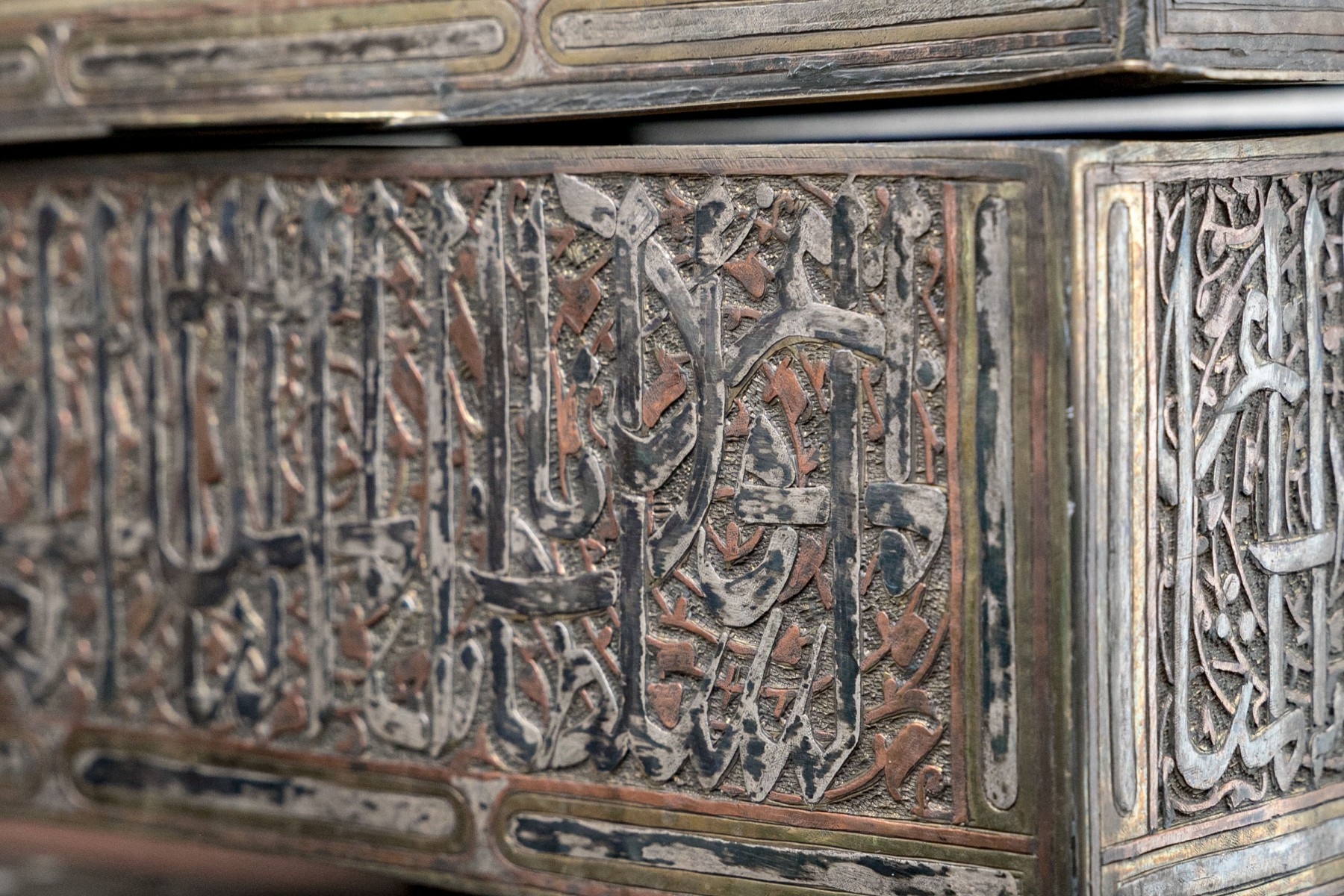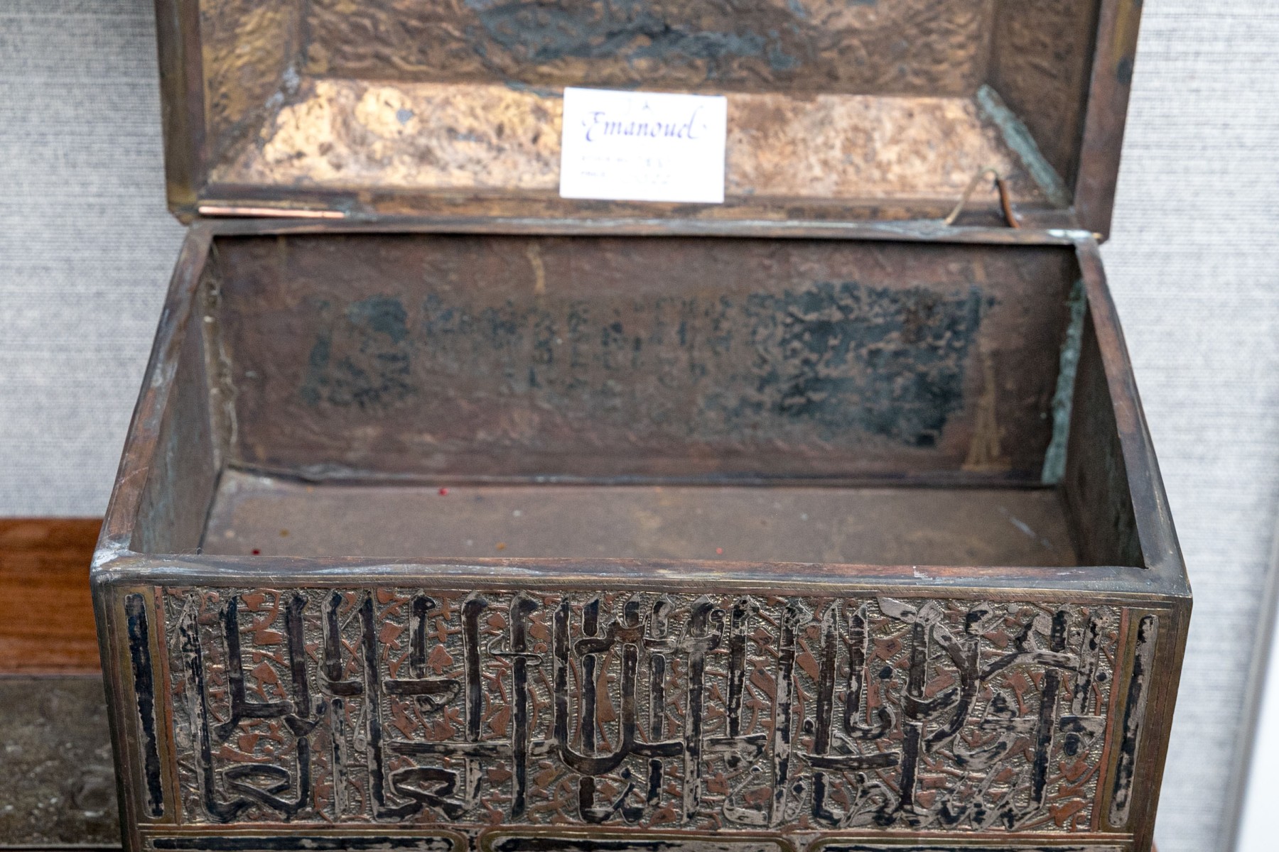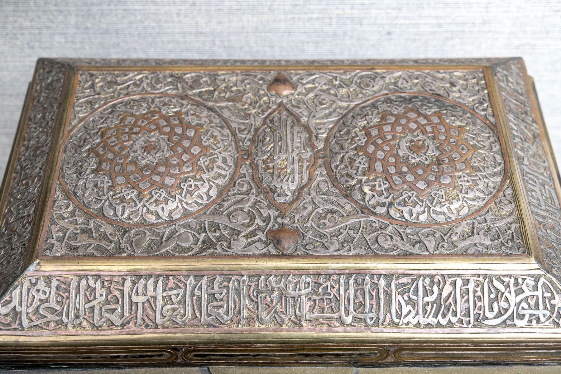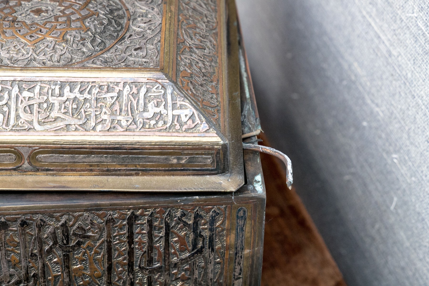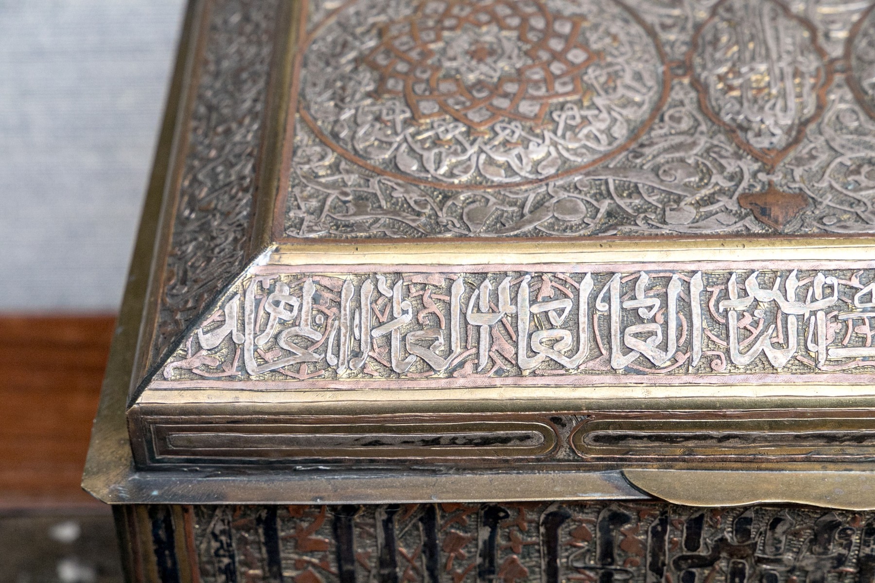 A handsome Mamluk Revival metal casket showcasing a hipped rectangular lid over a rectangular body raised on bracket legs. The exterior is finely paneled and beautifully incised with copper, brass, and silvertone accents throughout geometric texture and script.