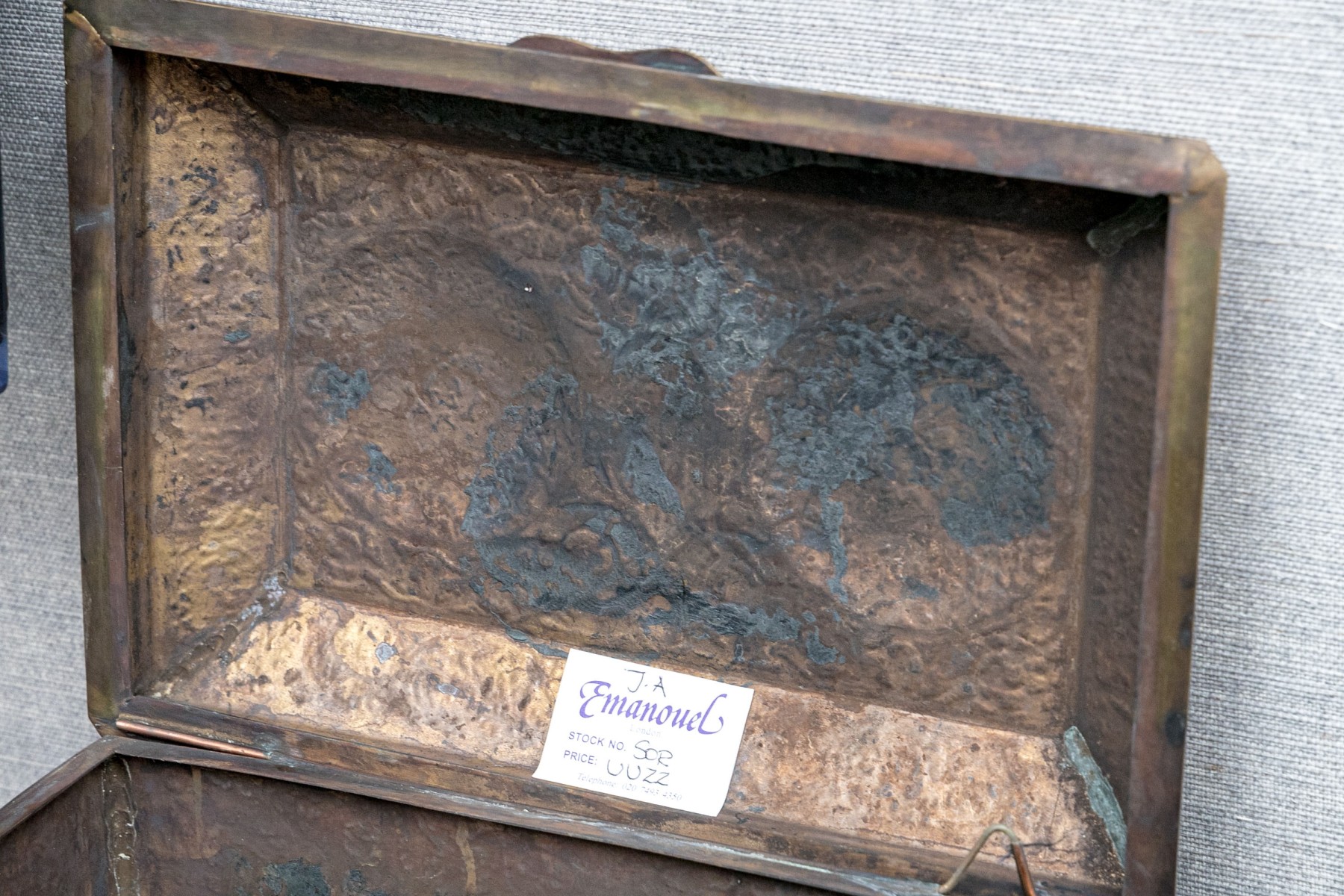 One hinge is broken and therefore the hinged lid doesn't line up straight on the casket. There is some finish wear, tarnish, and surface abrasions commensurate with age.