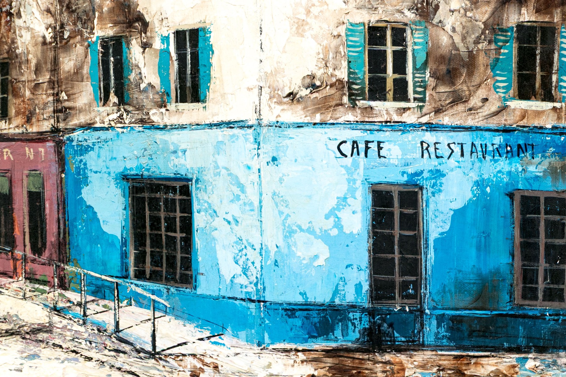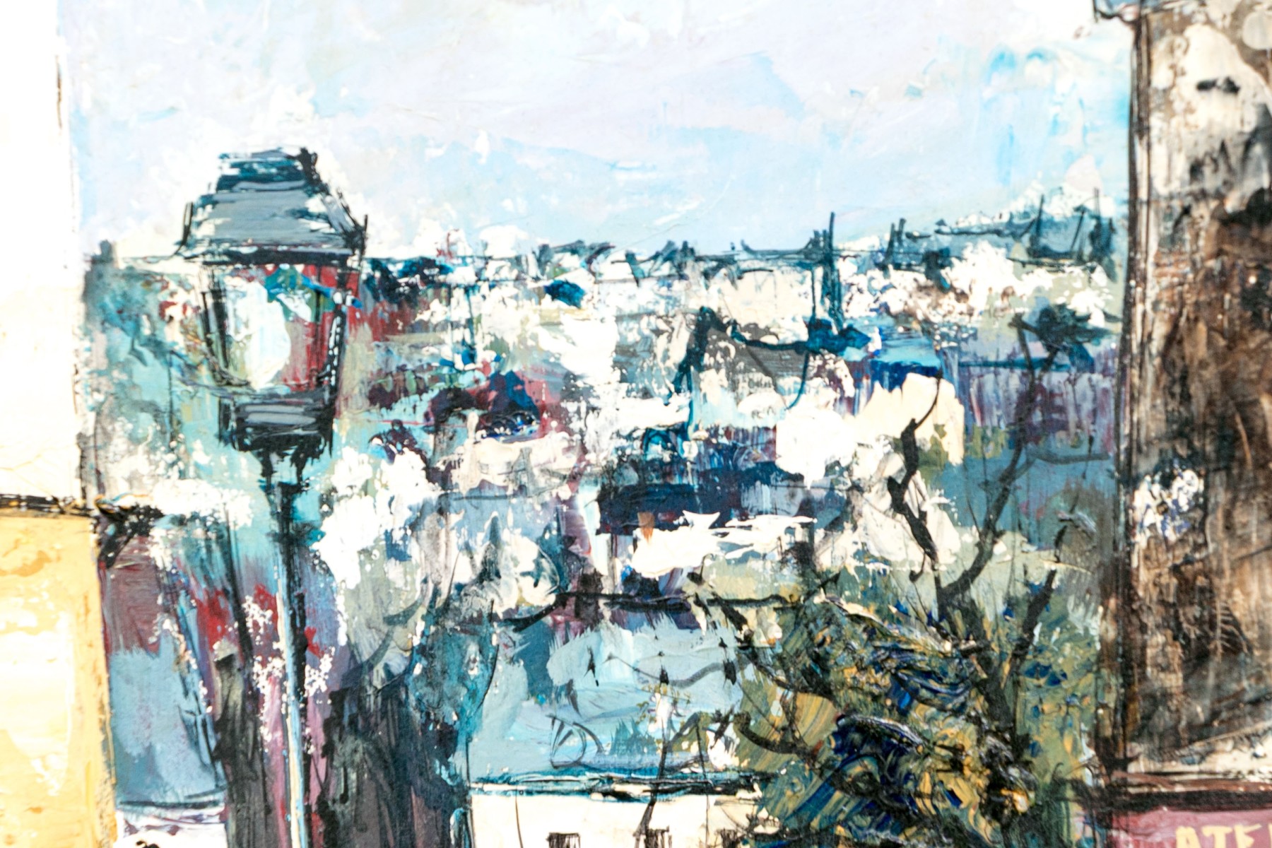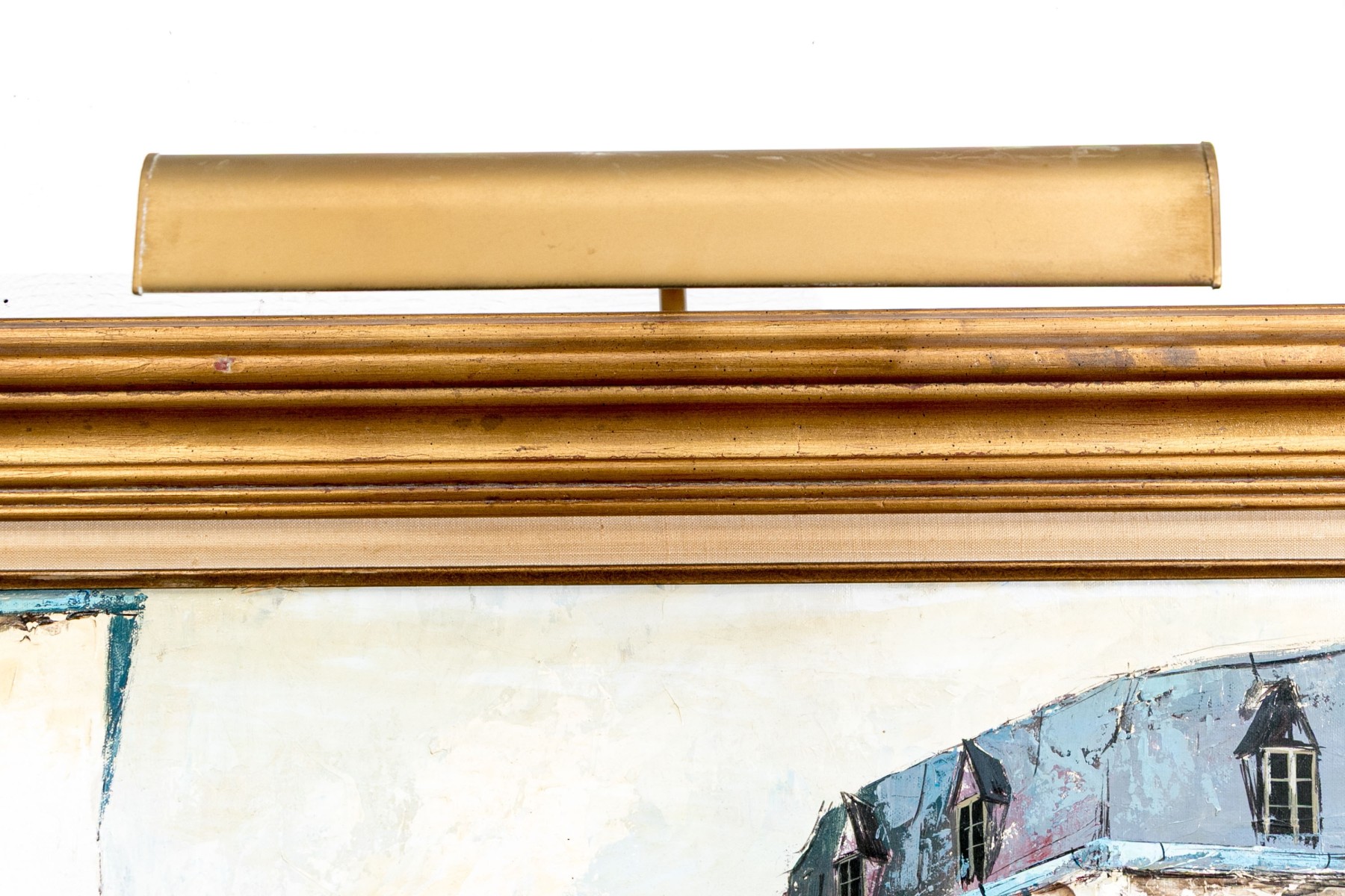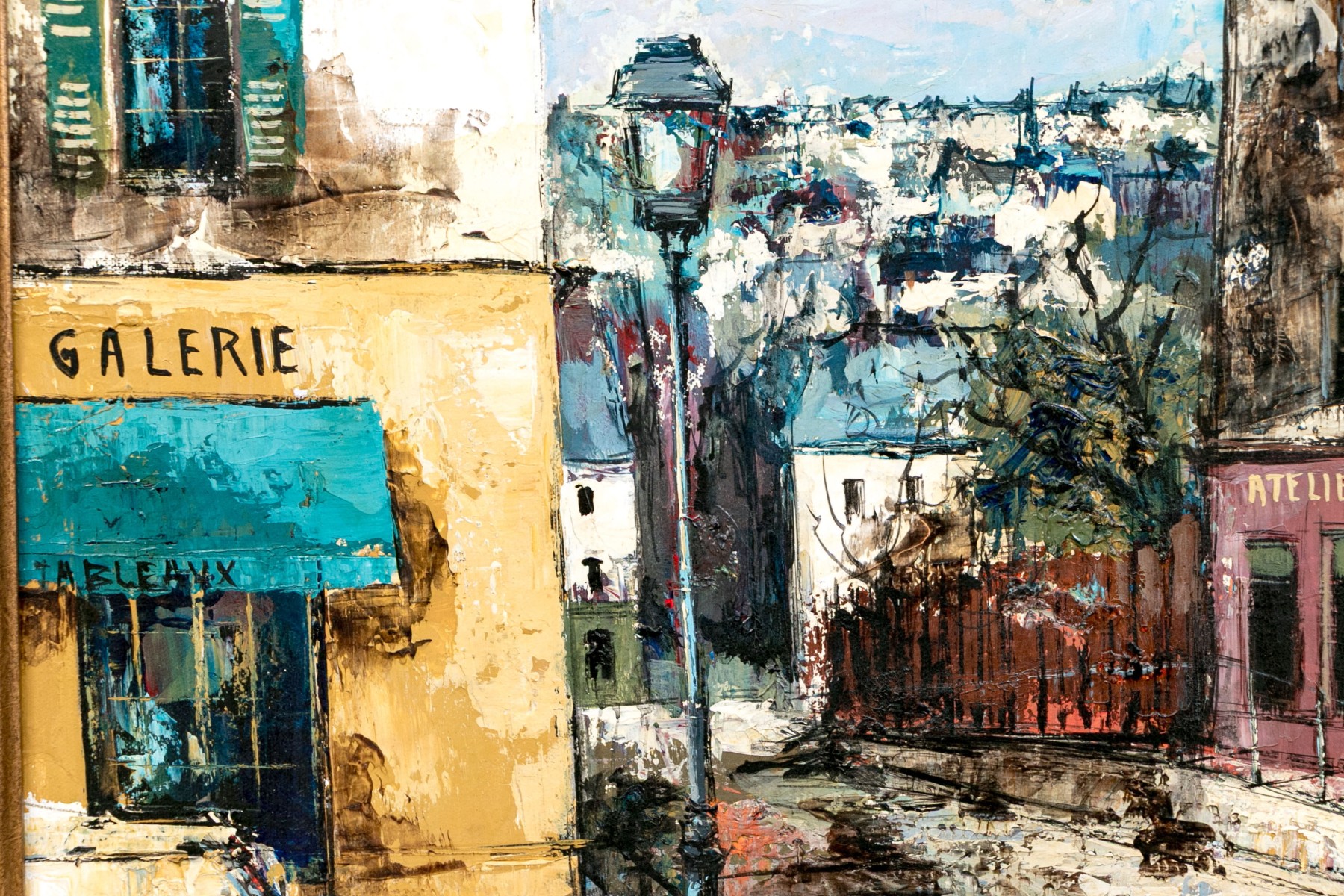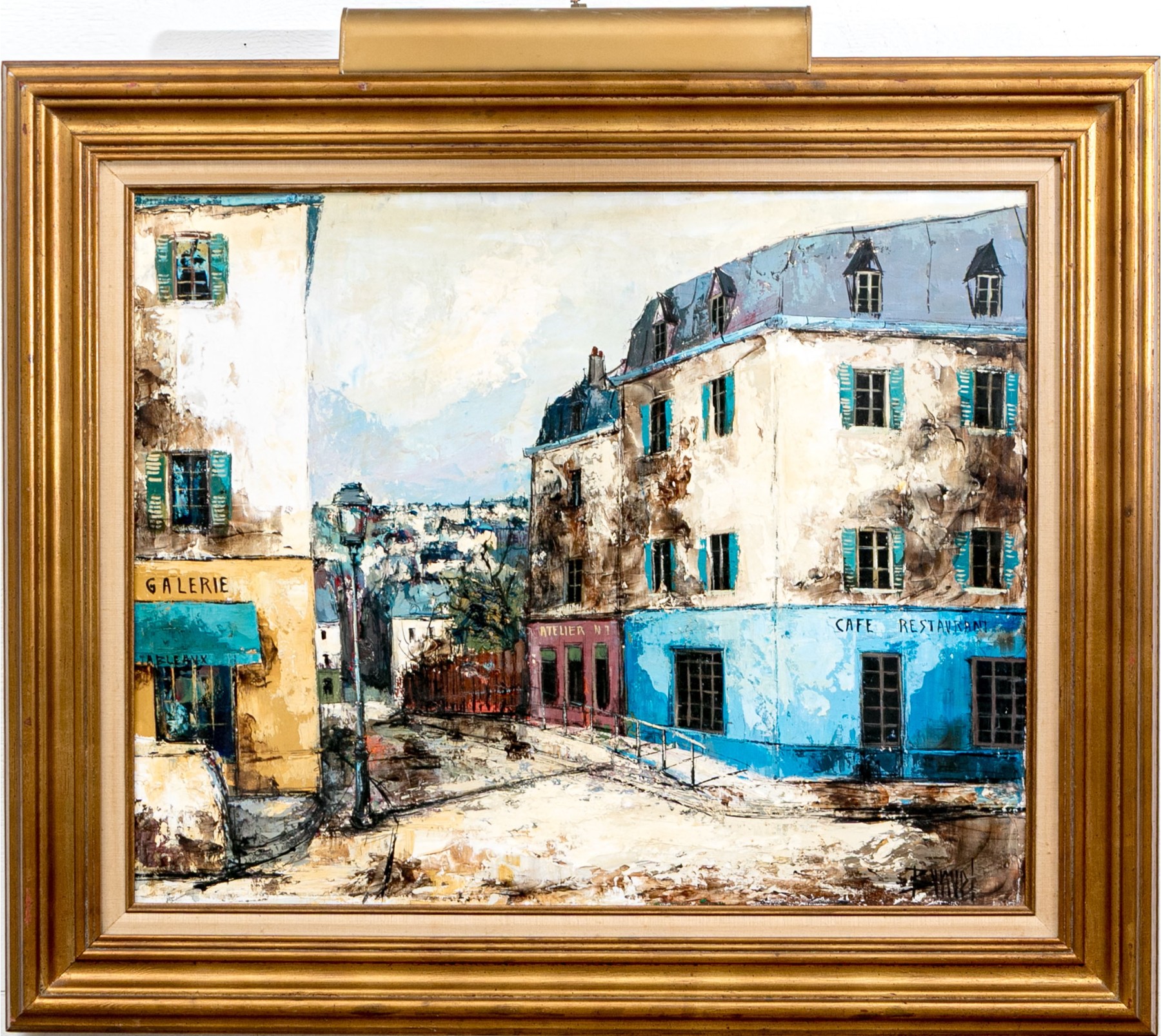 Signed lower right. A charming French village street with white washed buildings accented in colors- a cafe with blue paint, a galerie with yellow paint, and an atelier with purple. All on the top of the street overlooking a town. Presented in a gilt frame with linen filet and attached light.