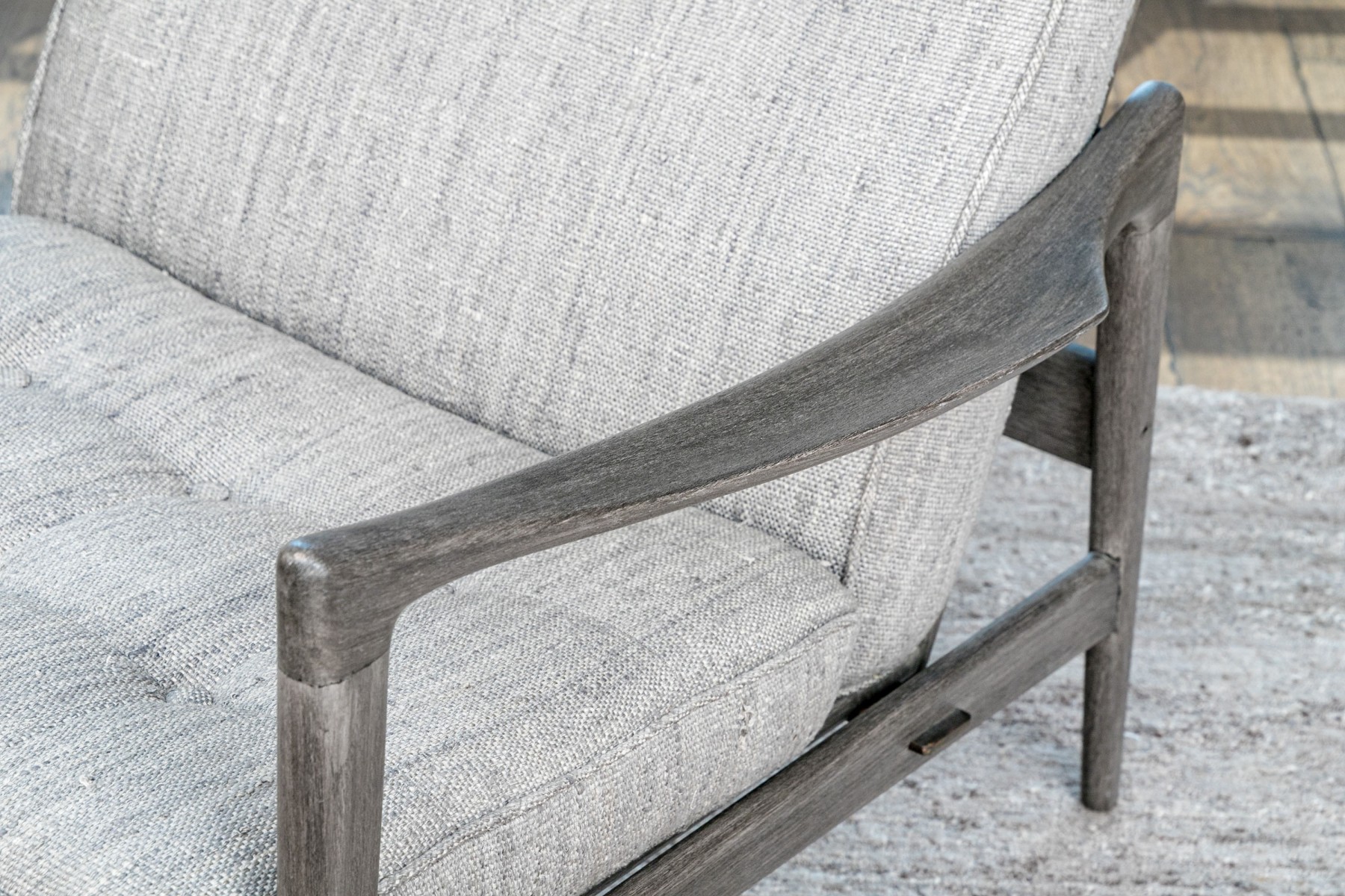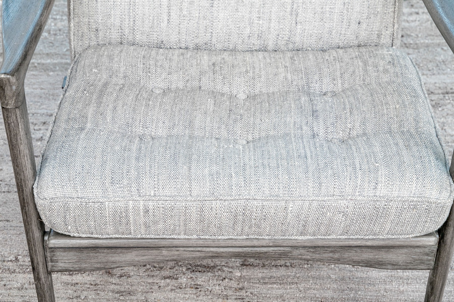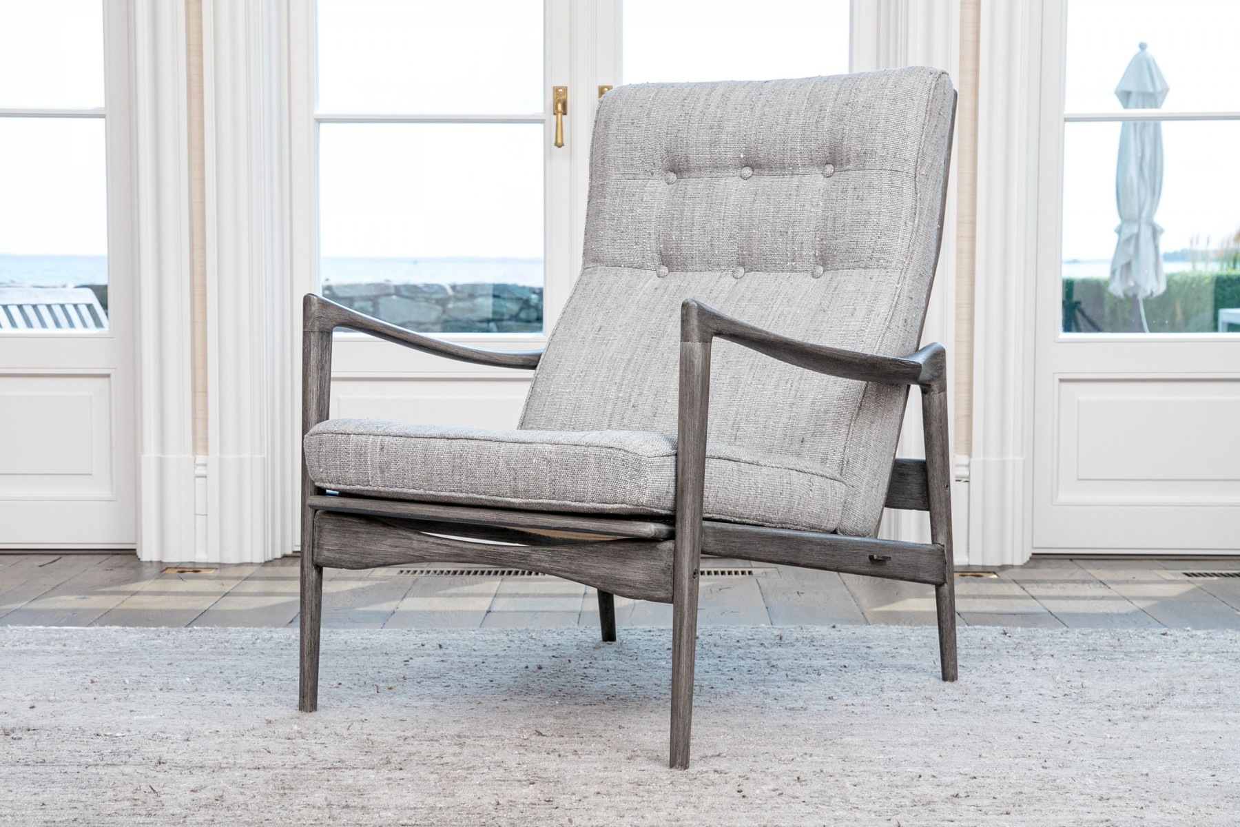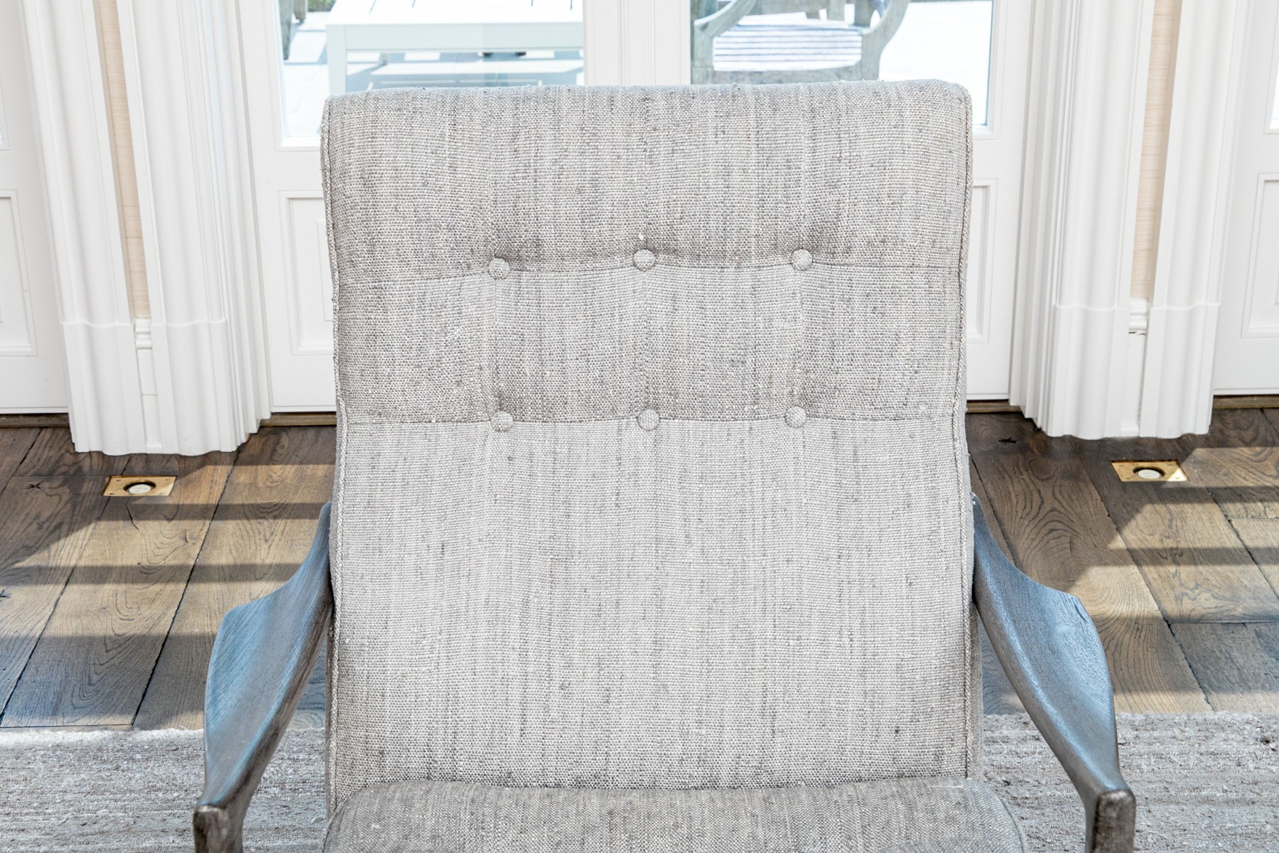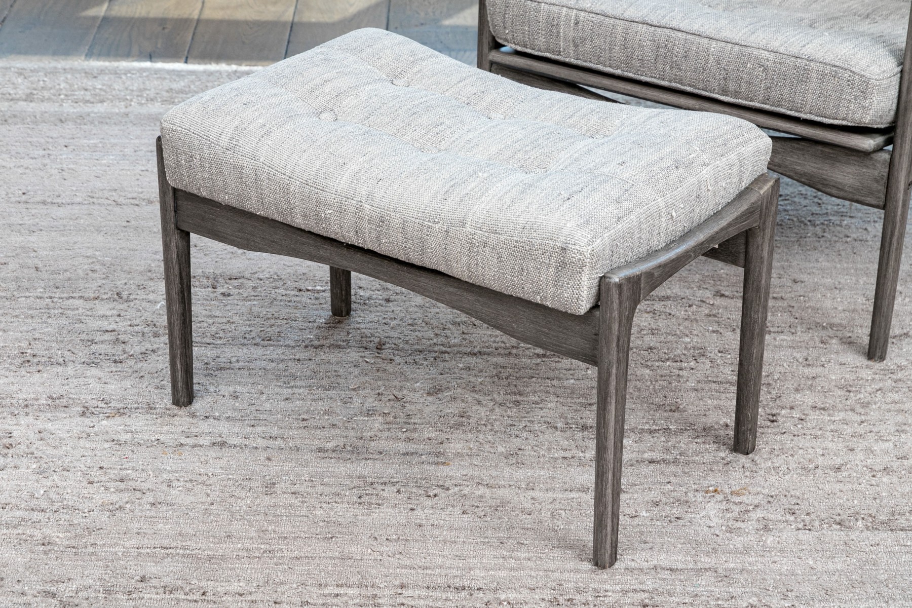 The Mar Silver Design open armchair, paired with its matching ottoman, showcases a sleek and contemporary design. Both pieces are upholstered in a chic light grey fabric with button tufting, while the two front legs are elegantly capped in 1" stainless steel. This set is a versatile addition that can seamlessly blend into various contemporary, modern, and transitional home settings, offering both style and comfort.