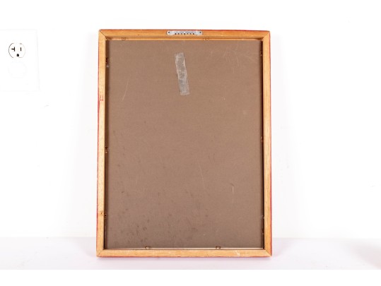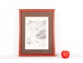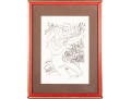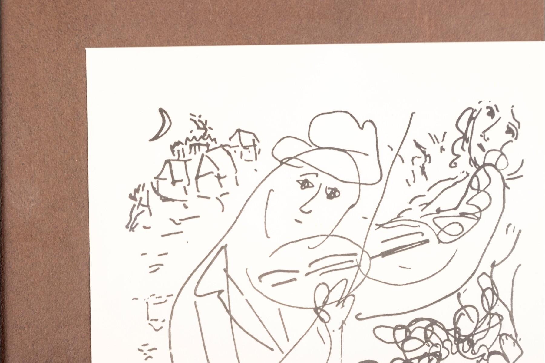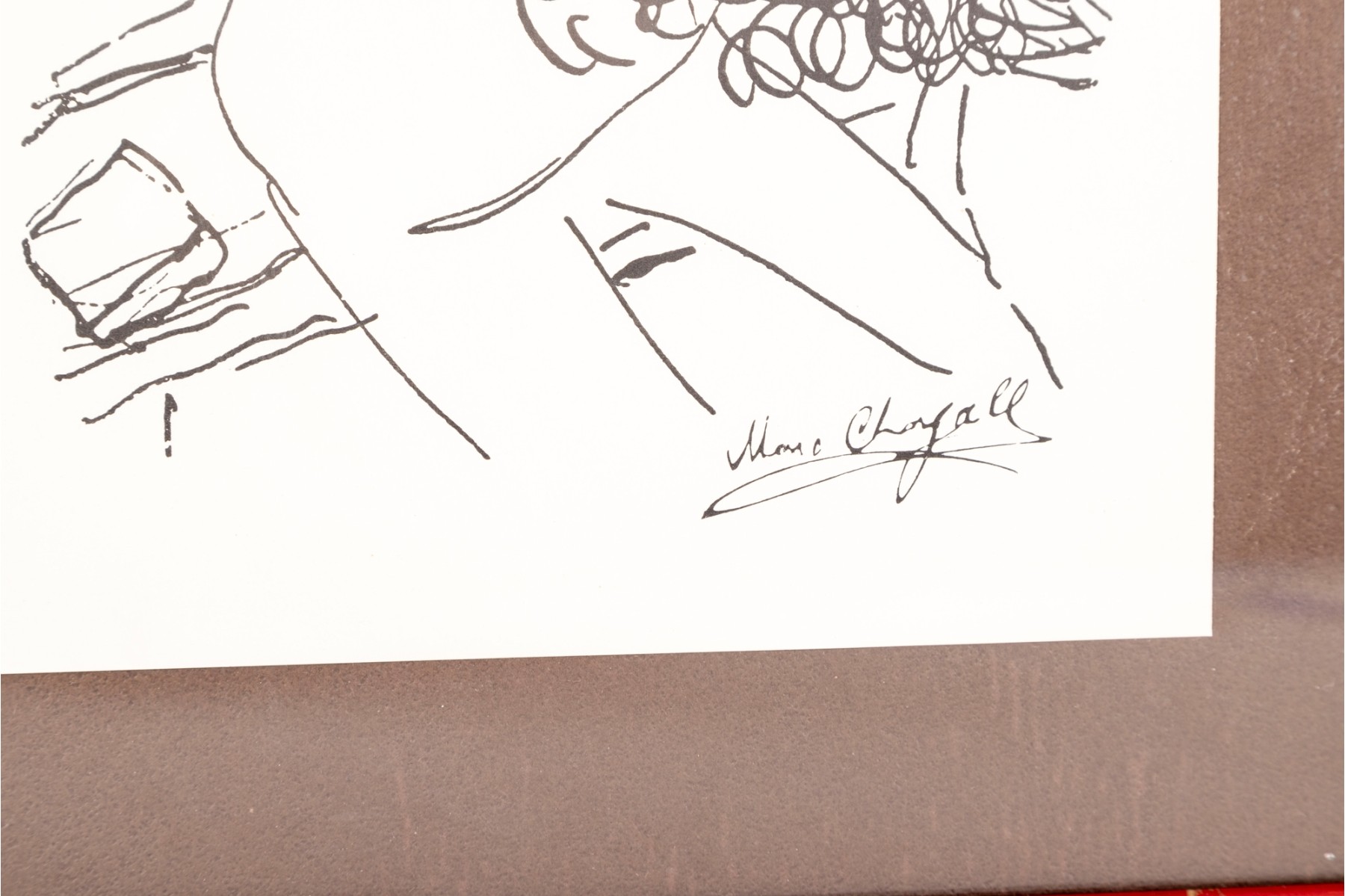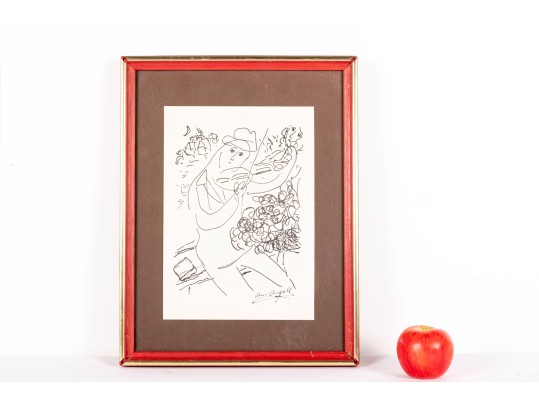 Marc Chagall's "Violinist" lithograph print, presented in a red wood frame and accented by a brown mat -- contained behind glass. See photos for details.