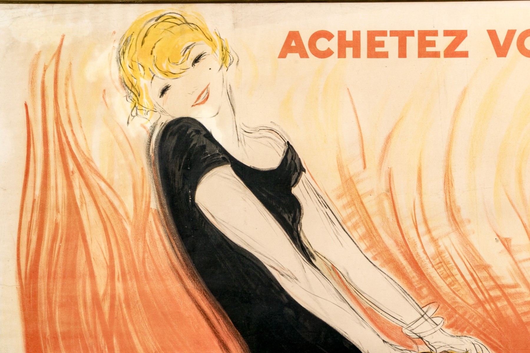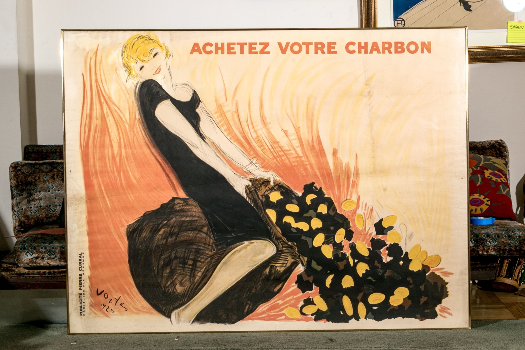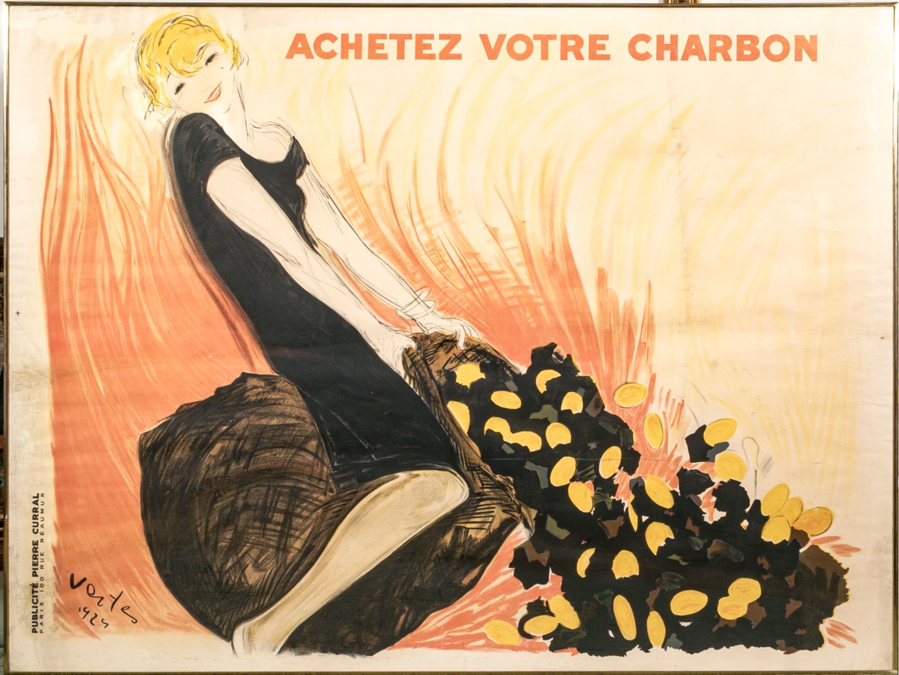 Marcel Vertès (Hungarian-French, 1895-1961) "Achetez Votre Carbon" ("Buy your coal") large lithographic poster printed by Publicite Pierre Curral, Paris. The poster depicts a flapper woman with short blonde hair wearing a black sheath dress sitting over a large back of coal mixed with gold coins against a flaming orange-red and yellow background. Plate signature lower left.