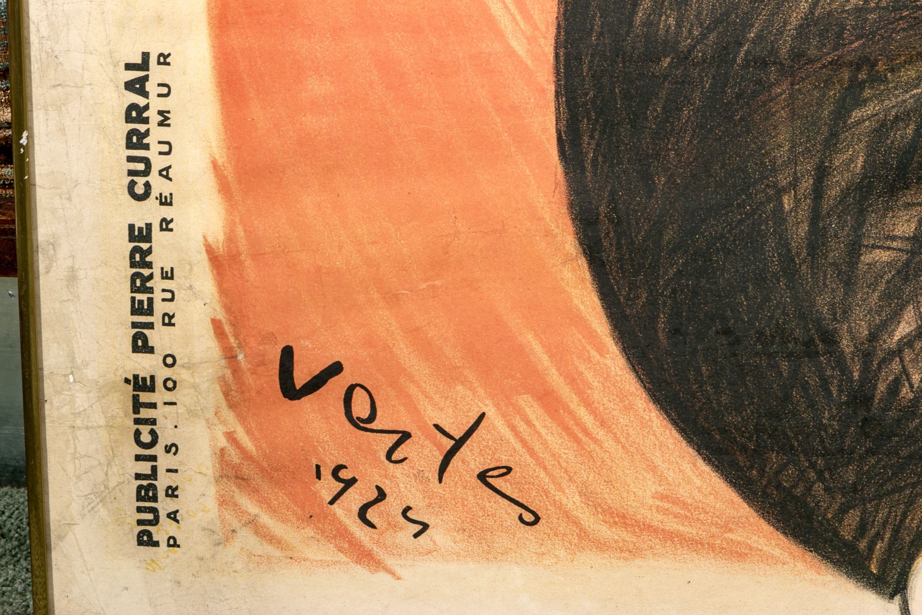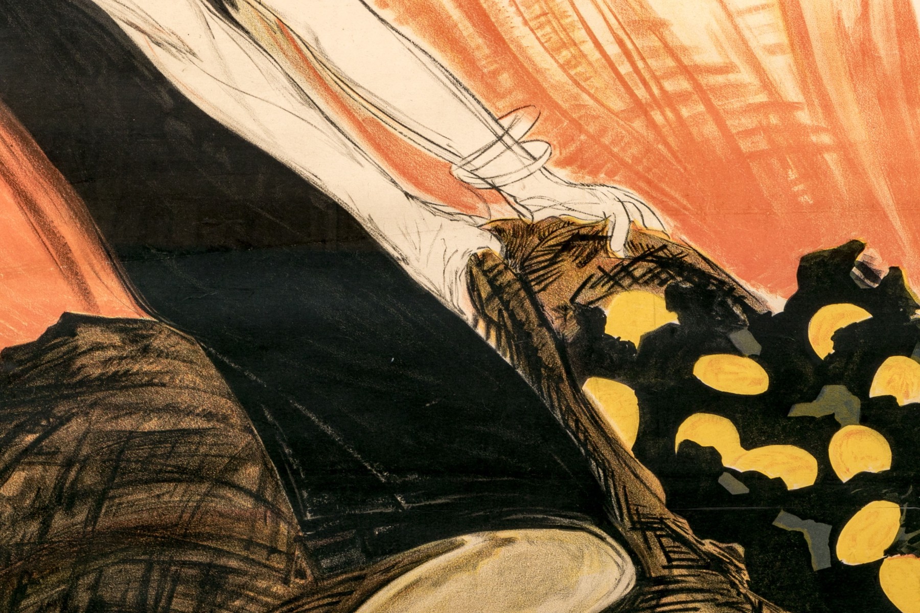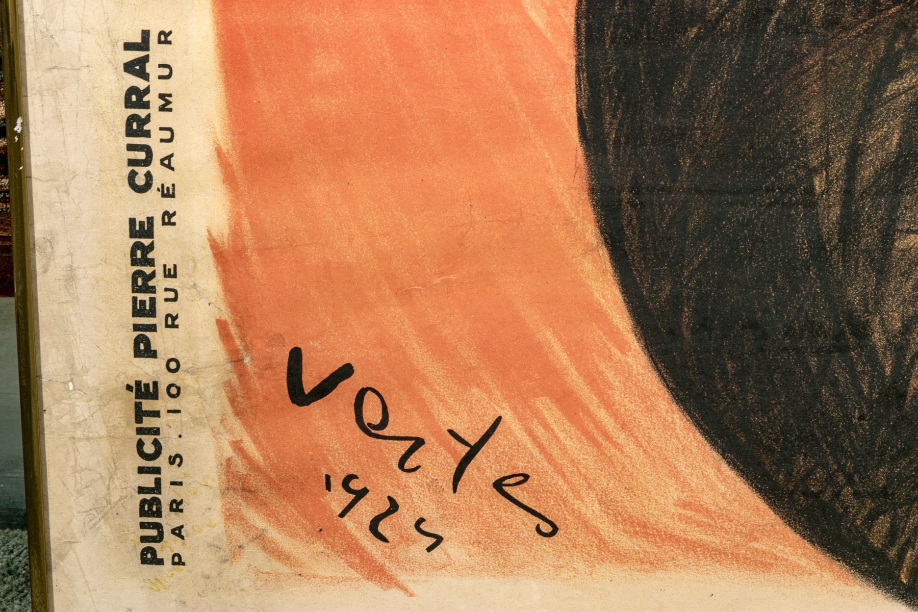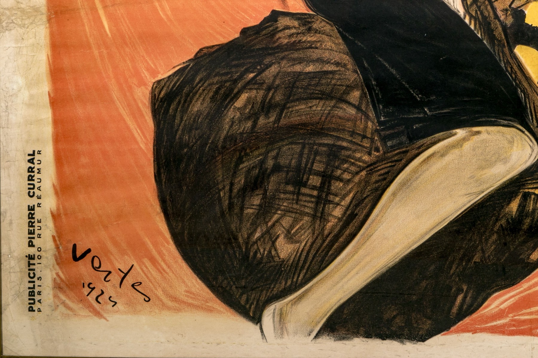 Marcel Vertès (Hungarian-French, 1895-1961) "Achetez Votre Carbon" ("Buy your coal") large lithographic poster printed by Publicite Pierre Curral, Paris. The poster depicts a flapper woman with short blonde hair wearing a black sheath dress sitting over a large back of coal mixed with gold coins against a flaming orange-red and yellow background. Plate signature lower left.