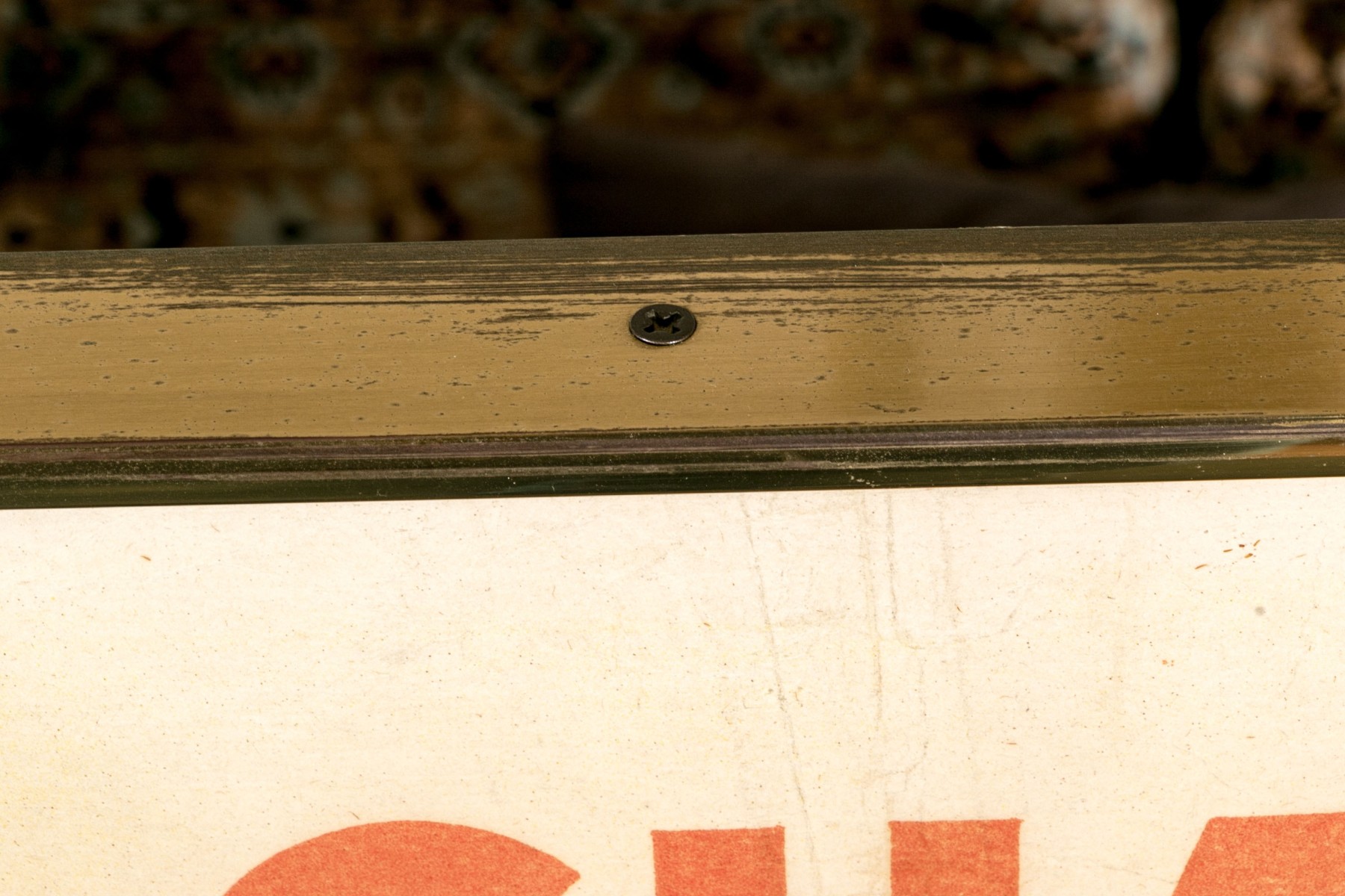 Presents well overall with paper toning and minor discoloration commensurate with age. Minor finish wear to the frame. Scratch to the glazing and some creasing to the paper.