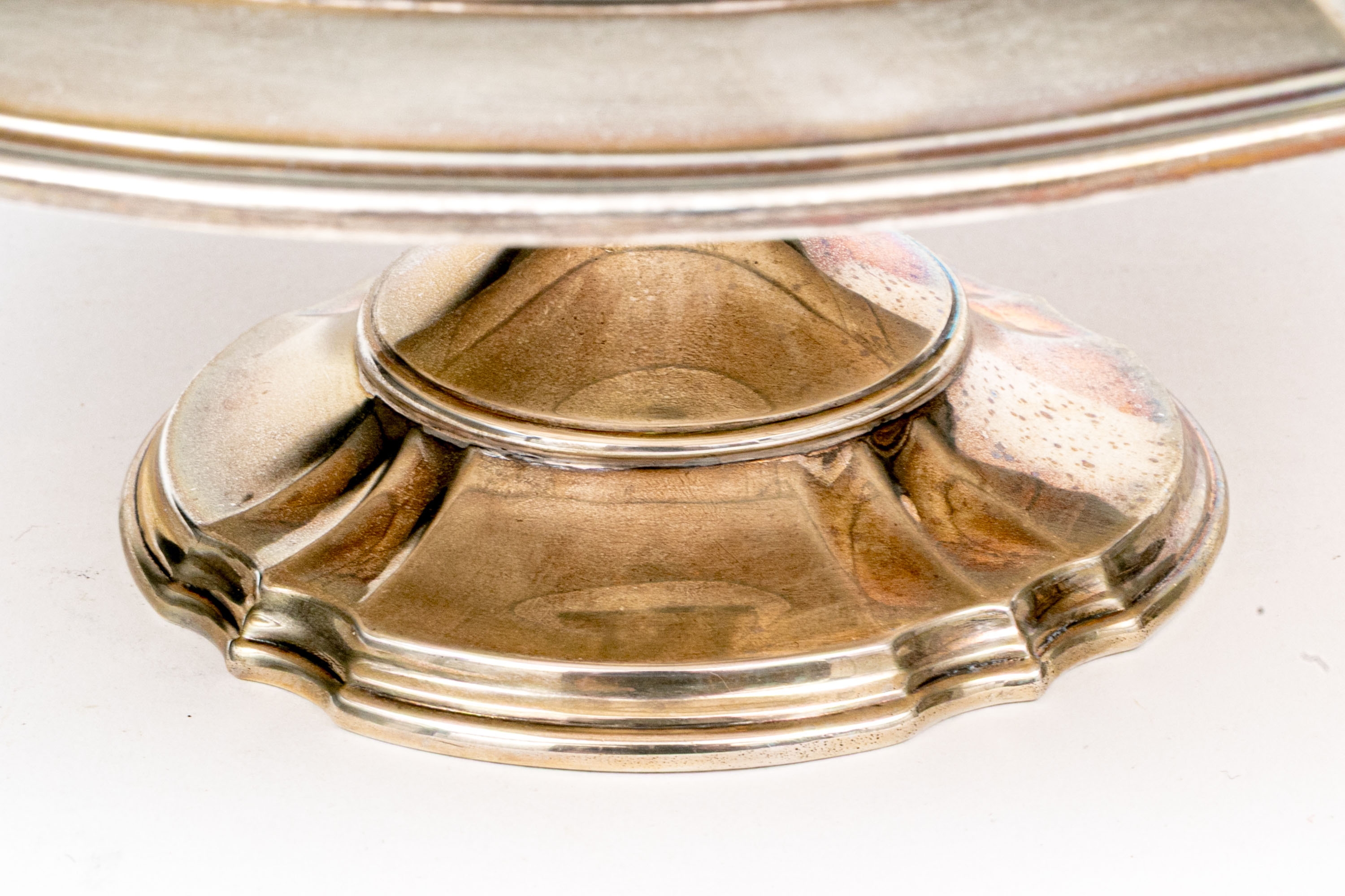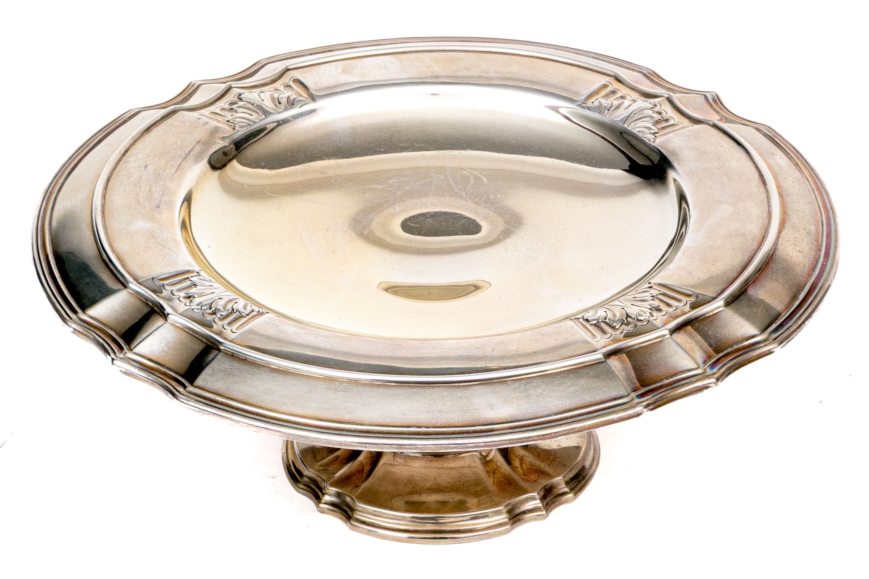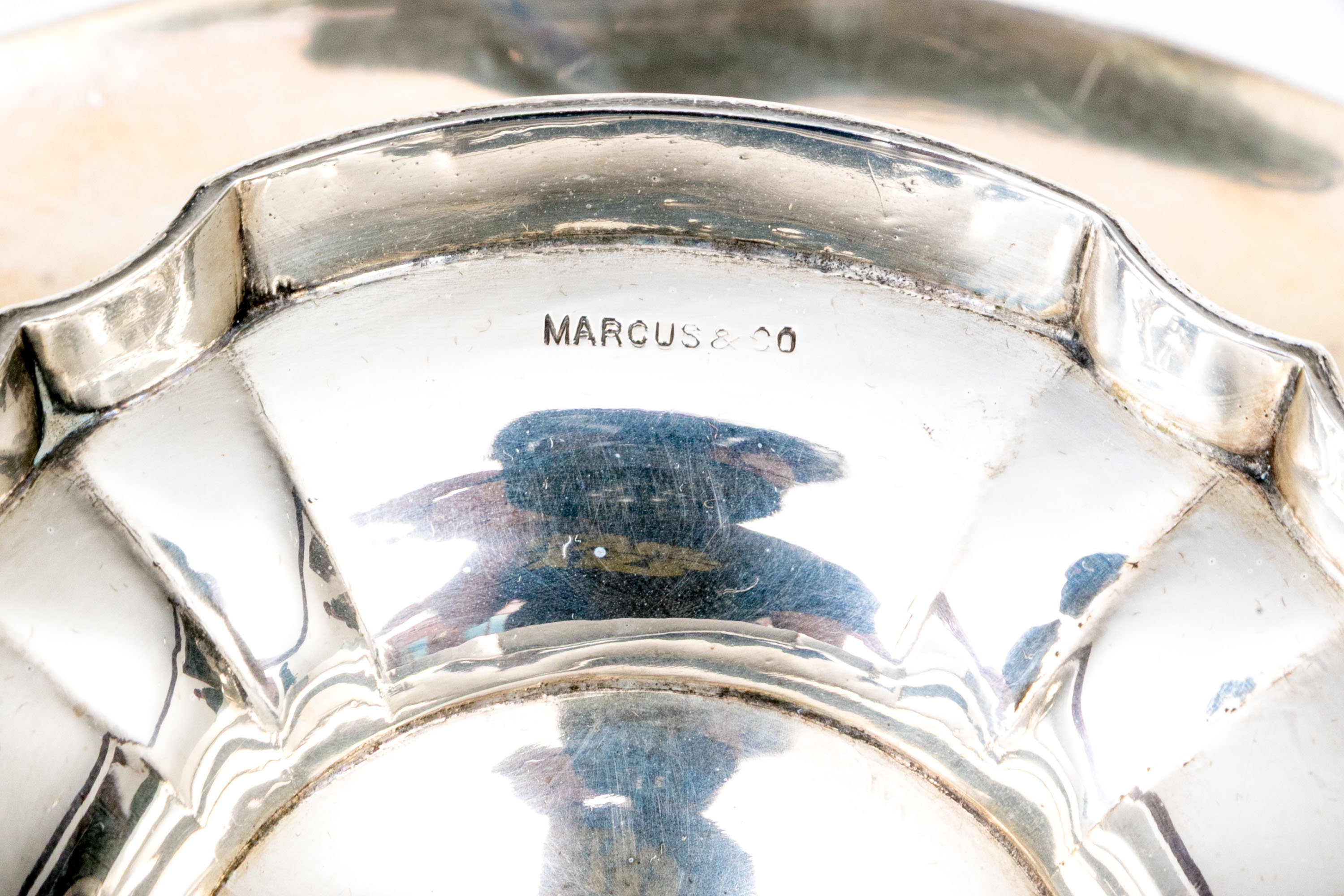 A handsome Marcus & Co. compote bowl standing on its foot with a short pedestal rising up to the bowl with a depressed circular interior and decorative trim. Decorated with four repousse foliate reserves and circular applied rim with four scalloped sections. Marked underfoot.