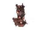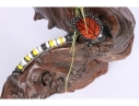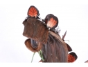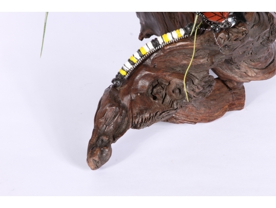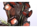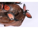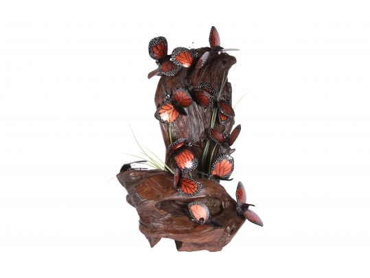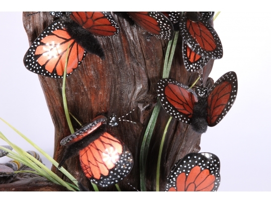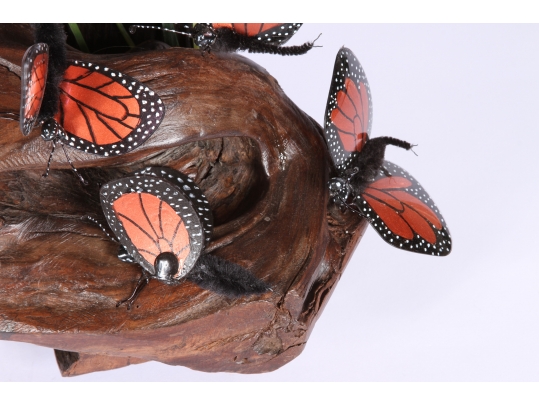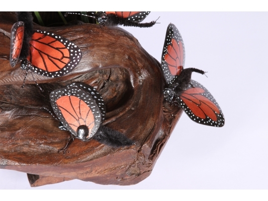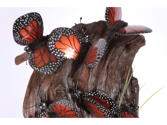 Monarch butterfly sculpture comprised of handpainted eyeglasses mounted on a faux wood base.