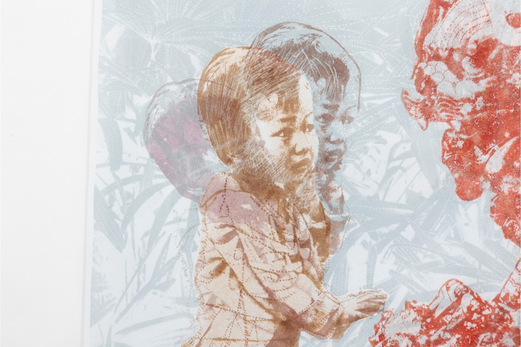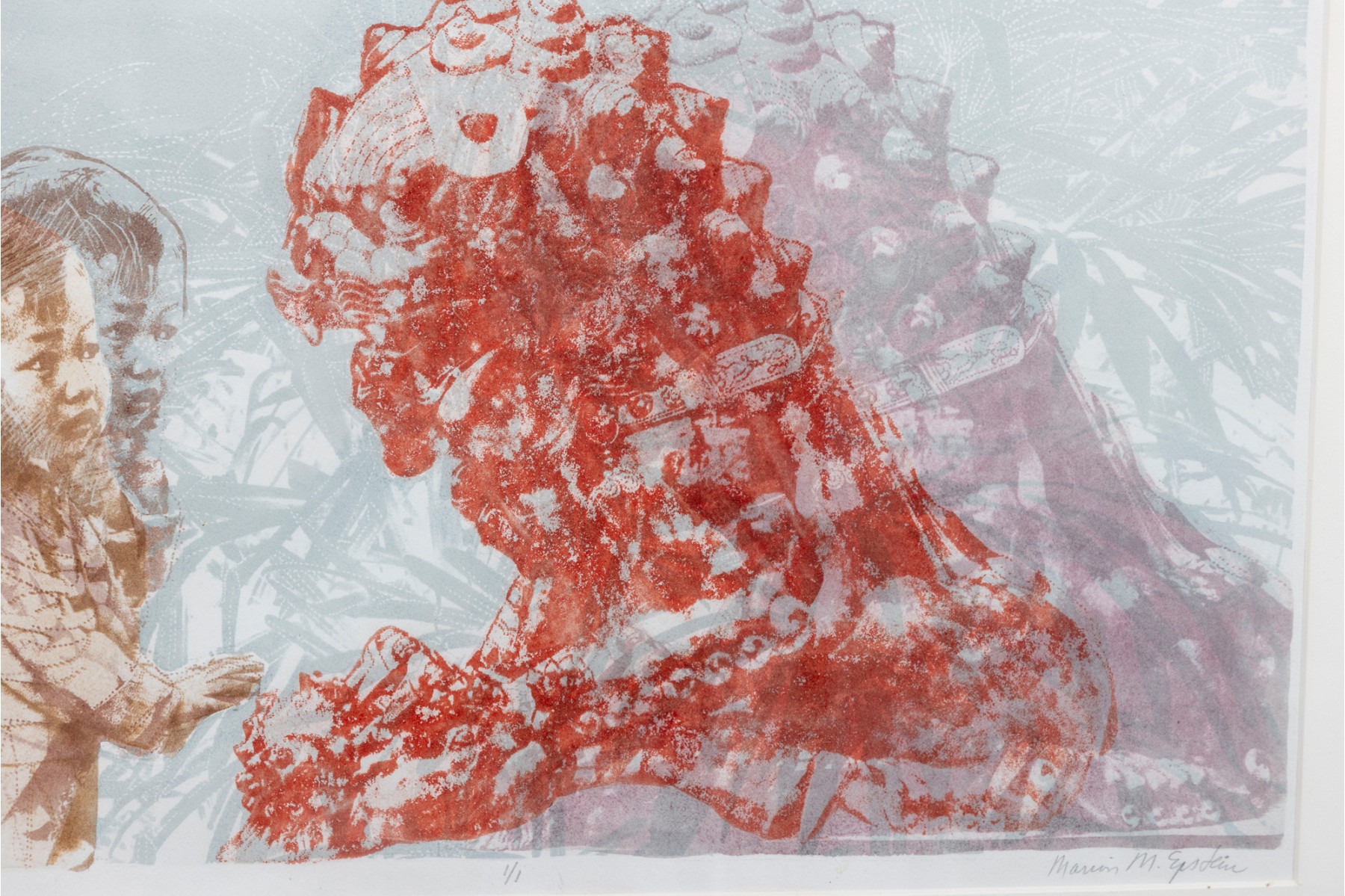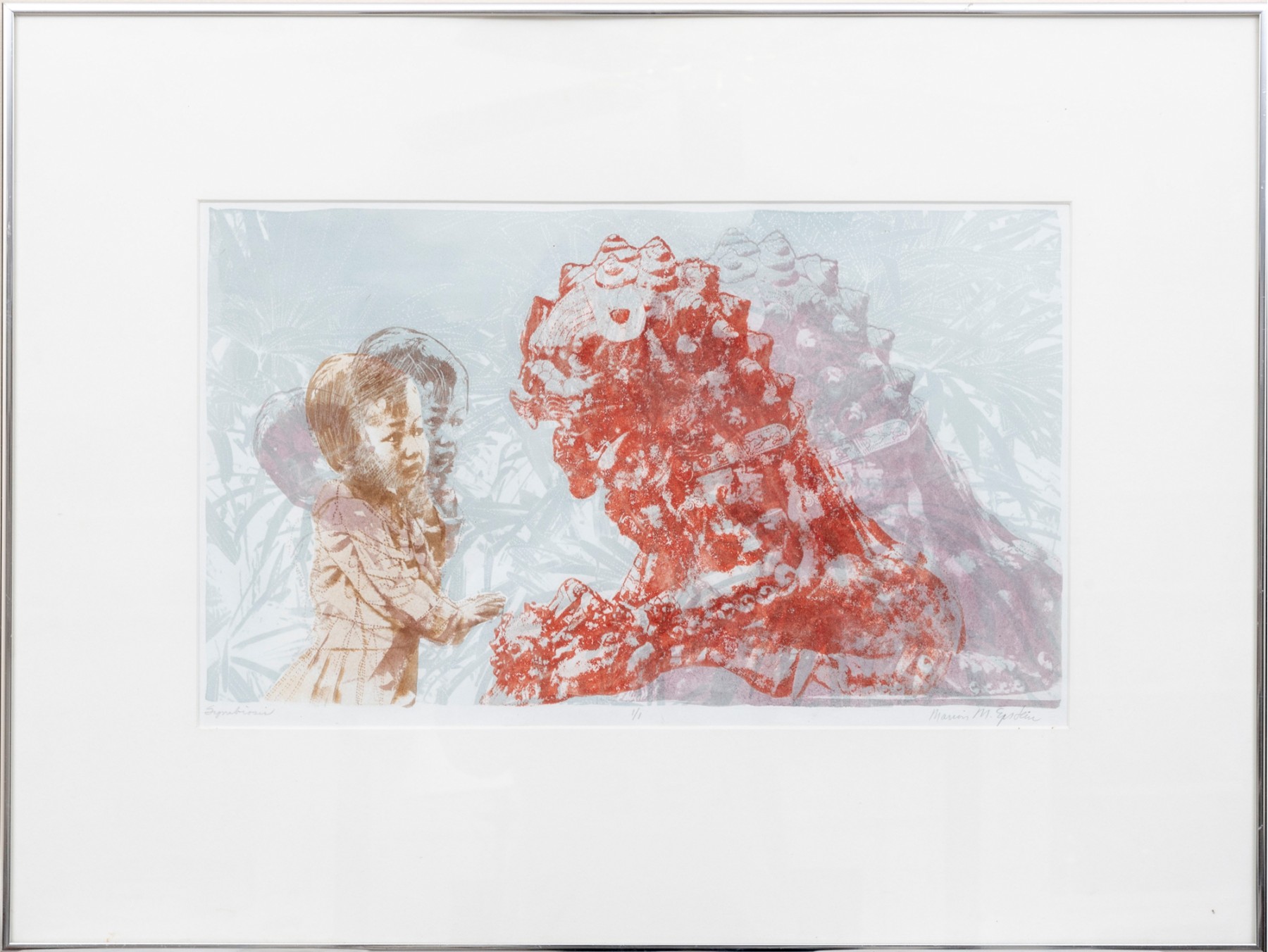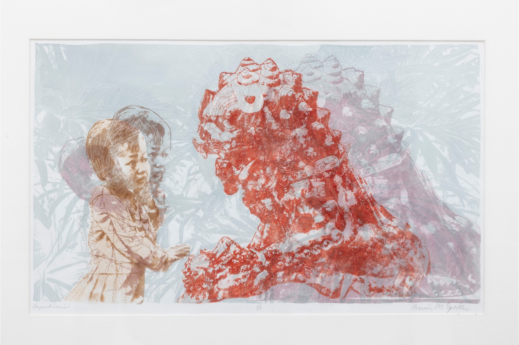 Marion Miller Epstein (American, 1921-2002) "Symbiosis" print depicting a child approaching a red dragon or lion statue. Pencil signed lower right, numbered 1/1 lower center, and titled lower left. Displayed behind glass with a white mat in a gray metal frame.