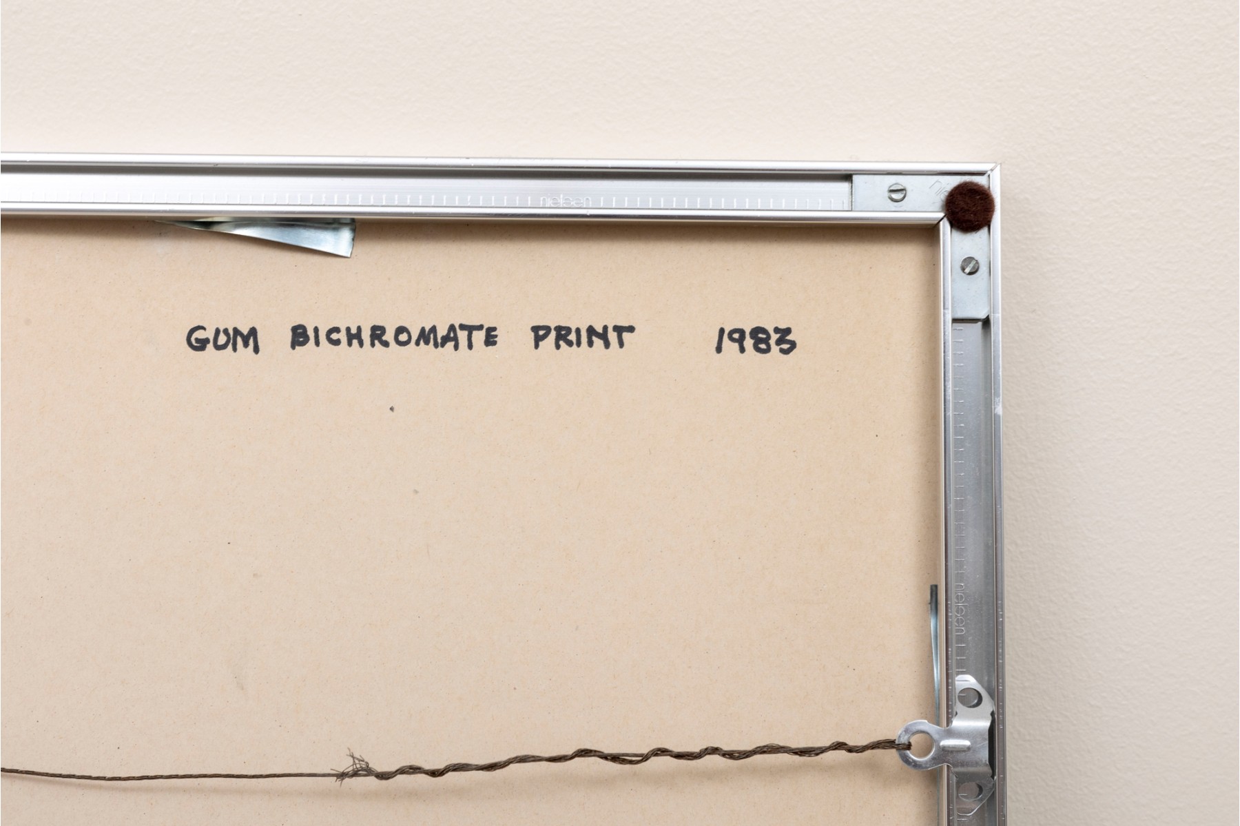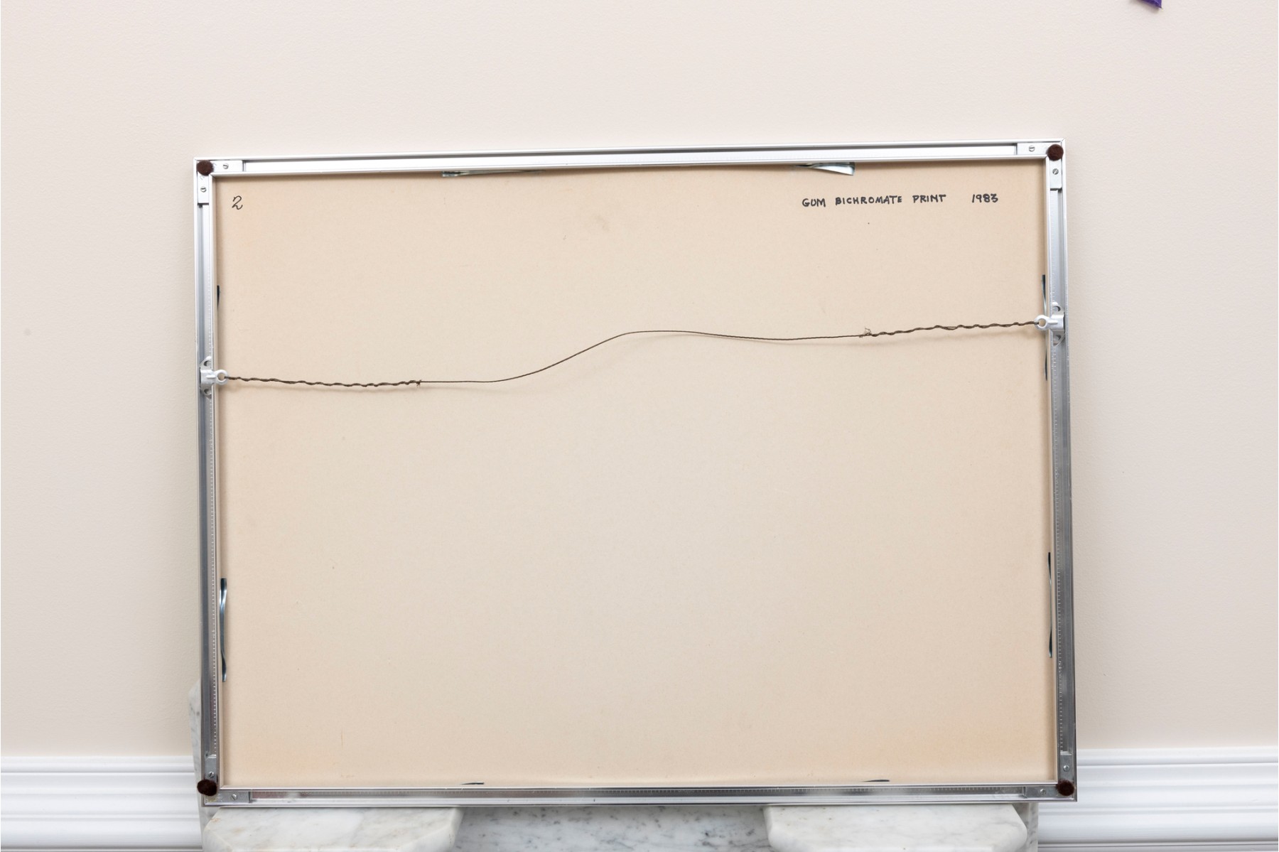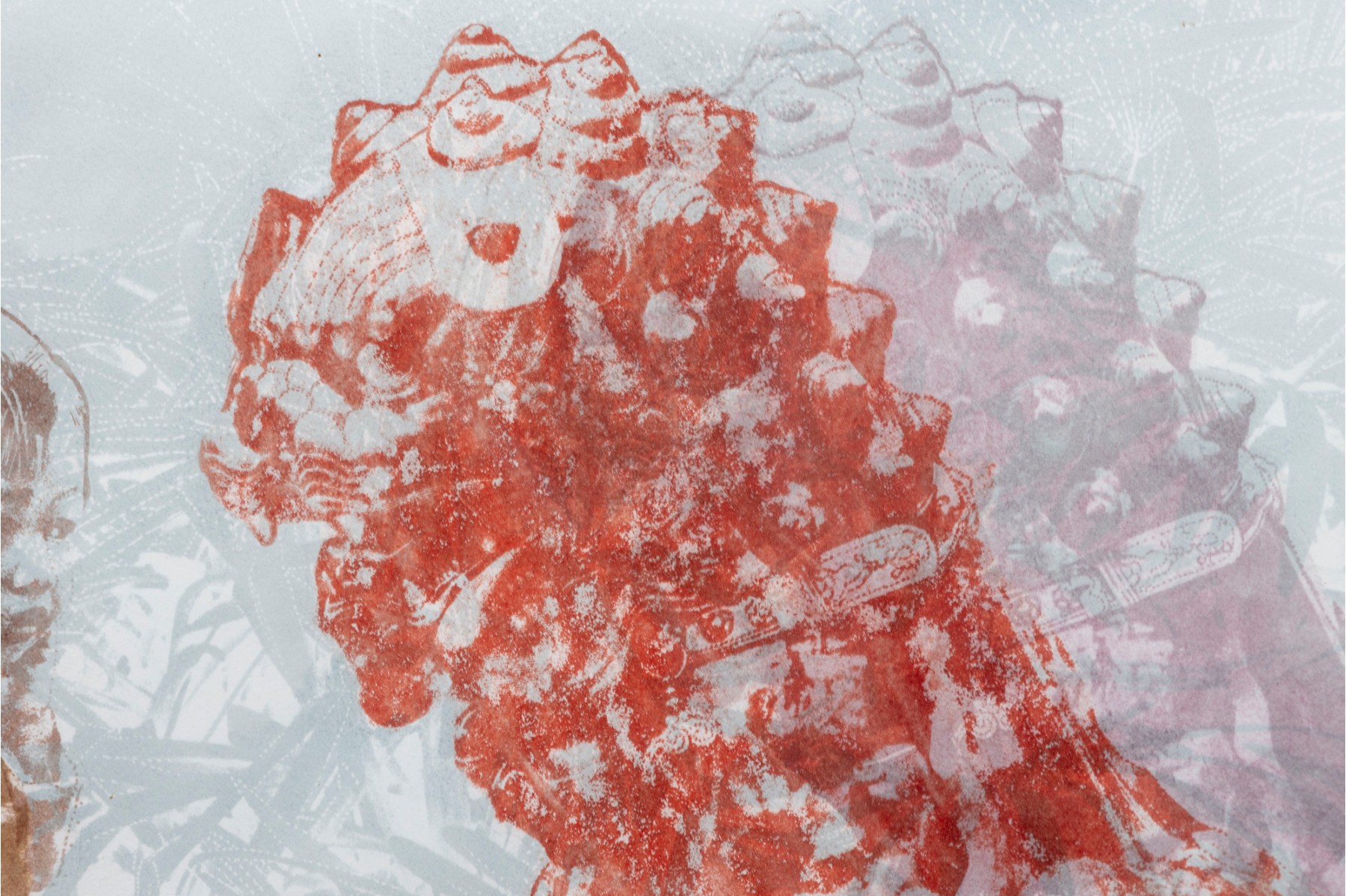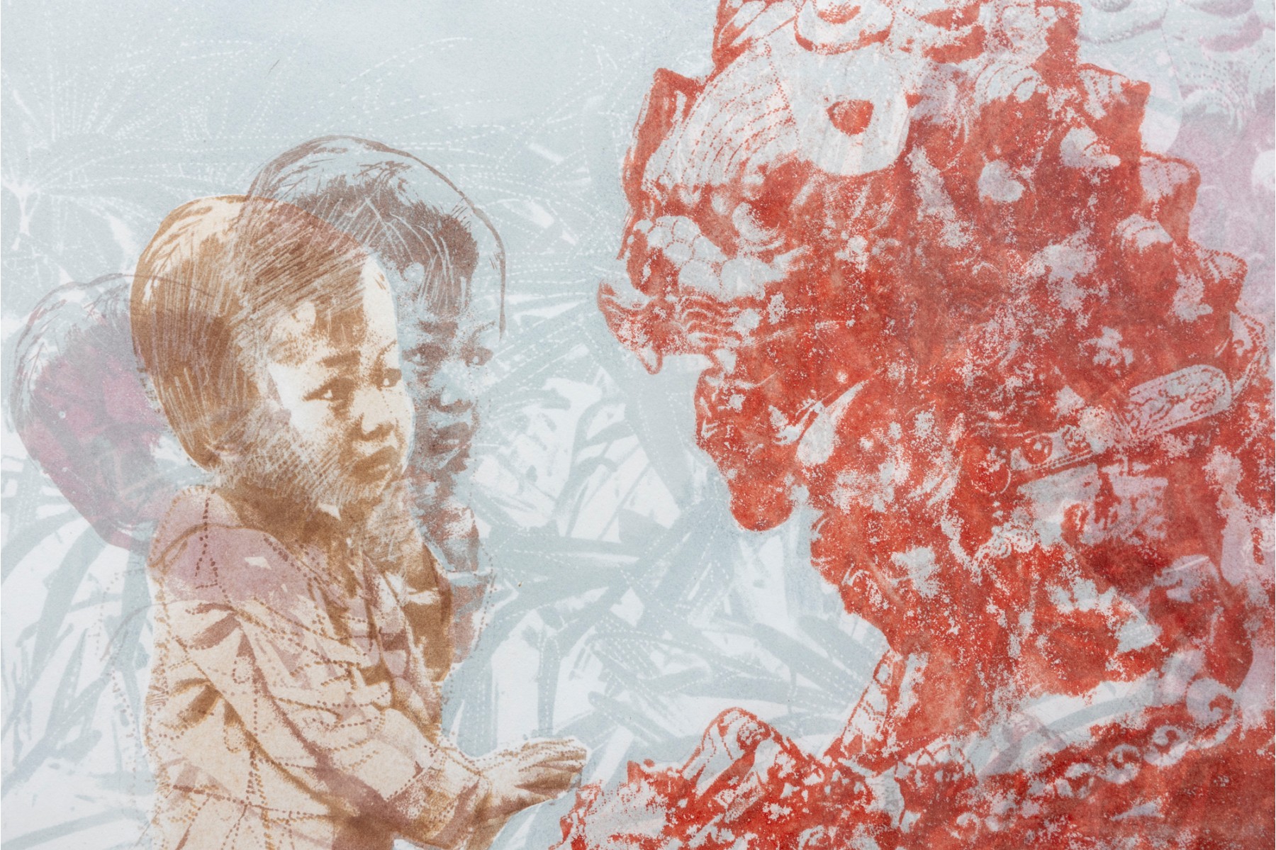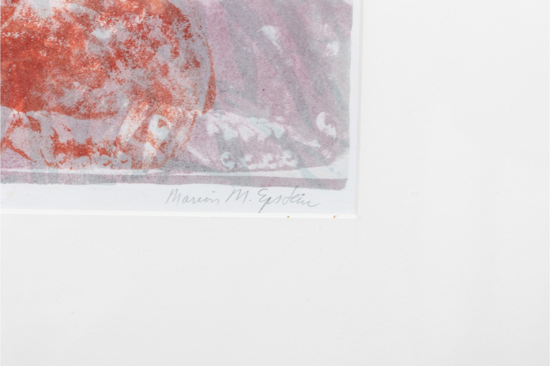 Marion Miller Epstein (American, 1921-2002) "Symbiosis" print depicting a child approaching a red dragon or lion statue. Pencil signed lower right, numbered 1/1 lower center, and titled lower left. Displayed behind glass with a white mat in a gray metal frame.