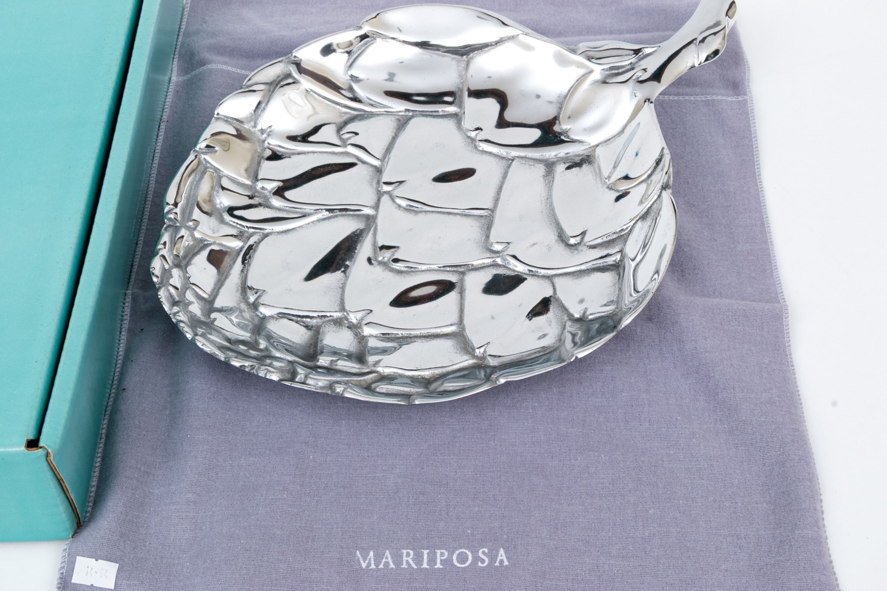 A stylish Mariposa cast aluminum serving plate in the form of an artichoke with wonderful layered texture. Includes the original box and dust bag.